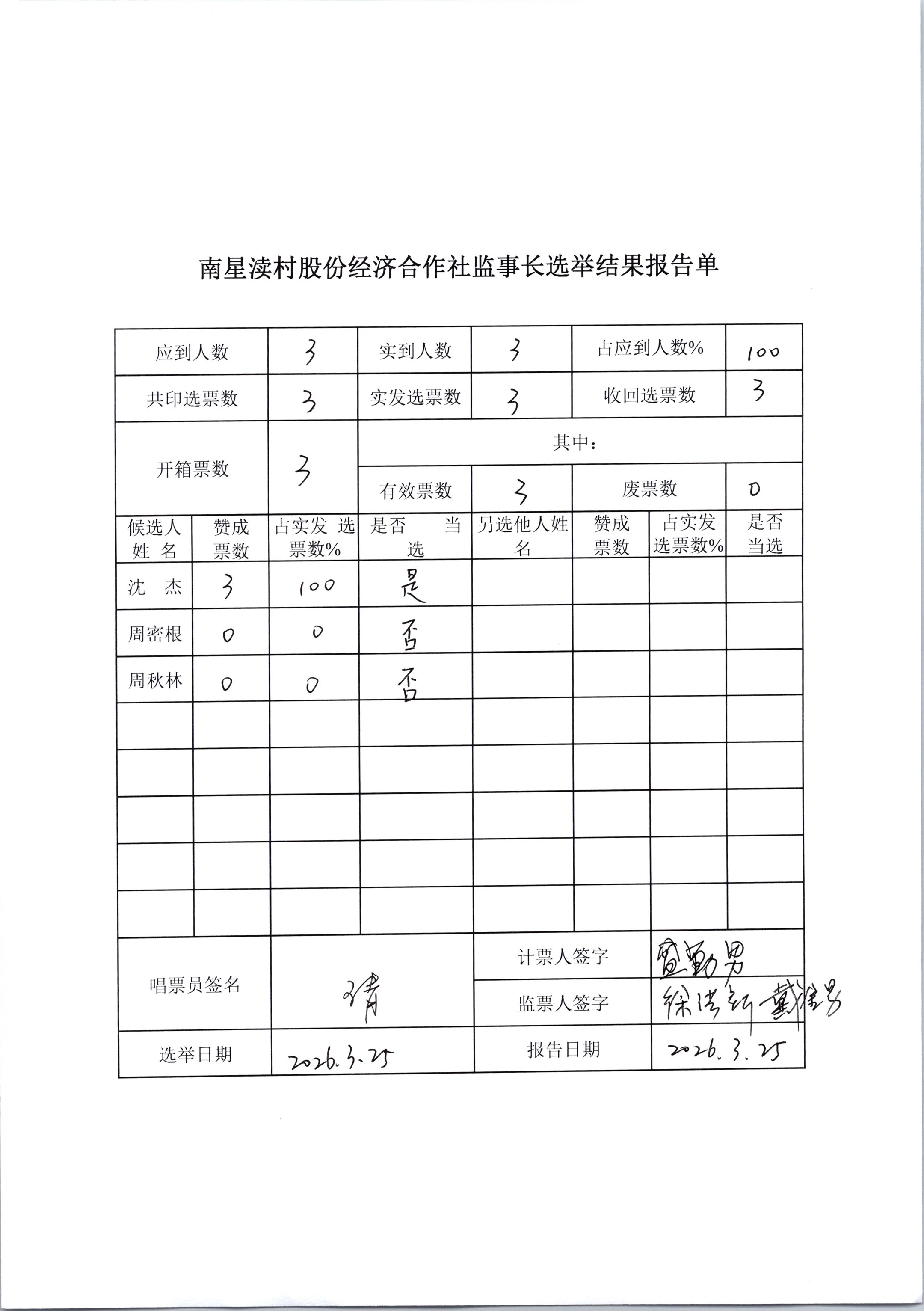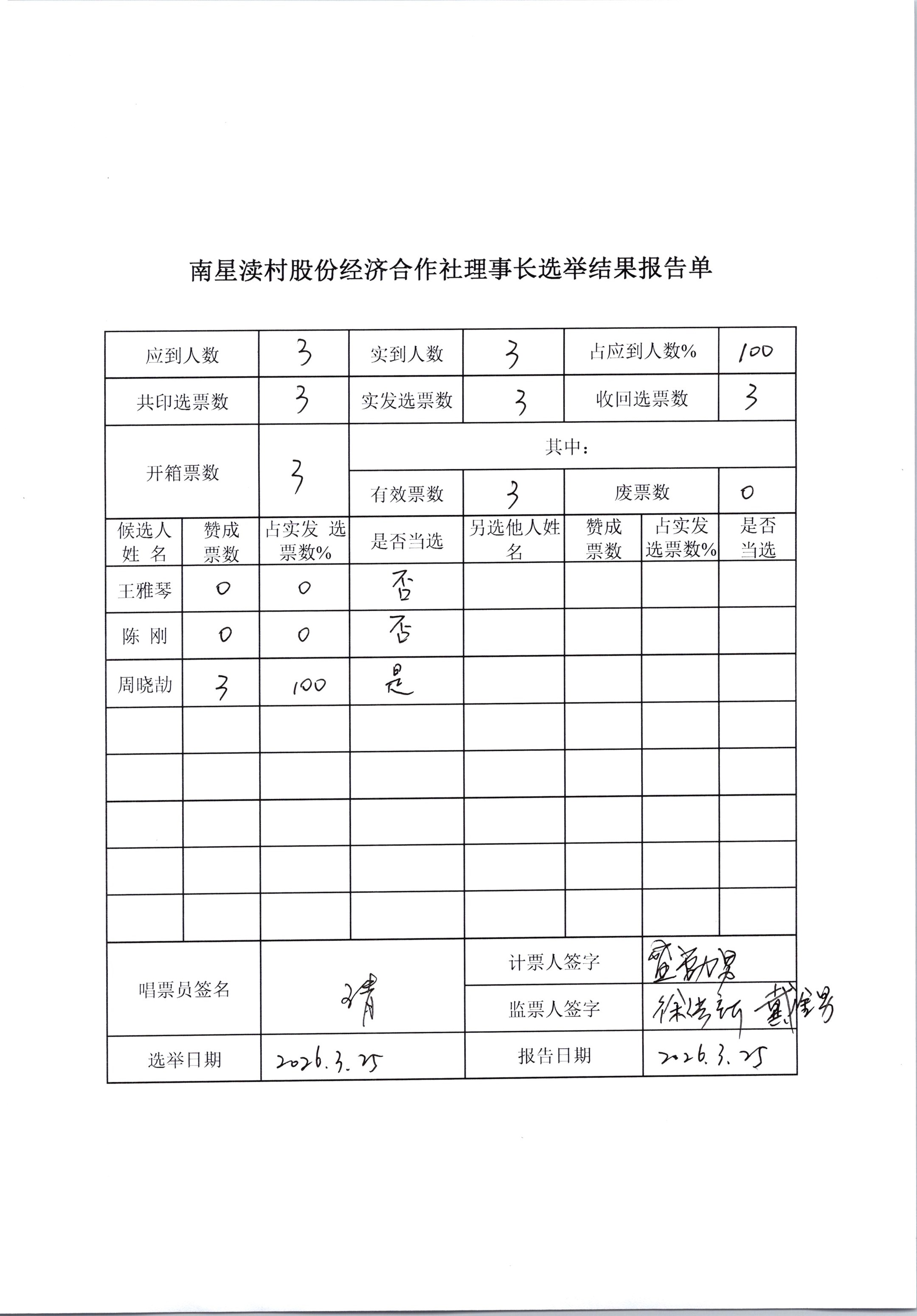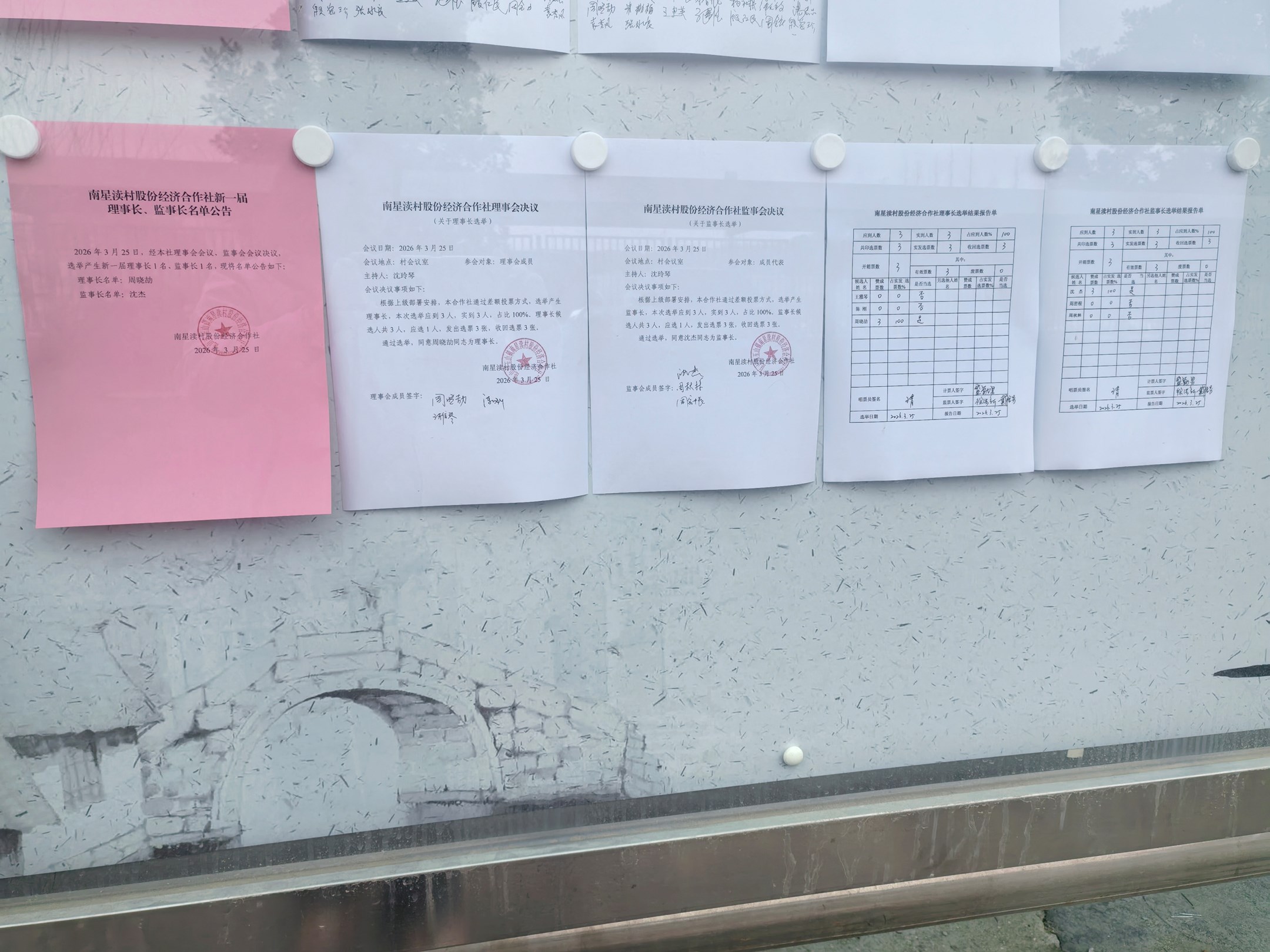 南星渎村股份经济合作社理事会、监事会决议公示(关于理事长、监事长选举)