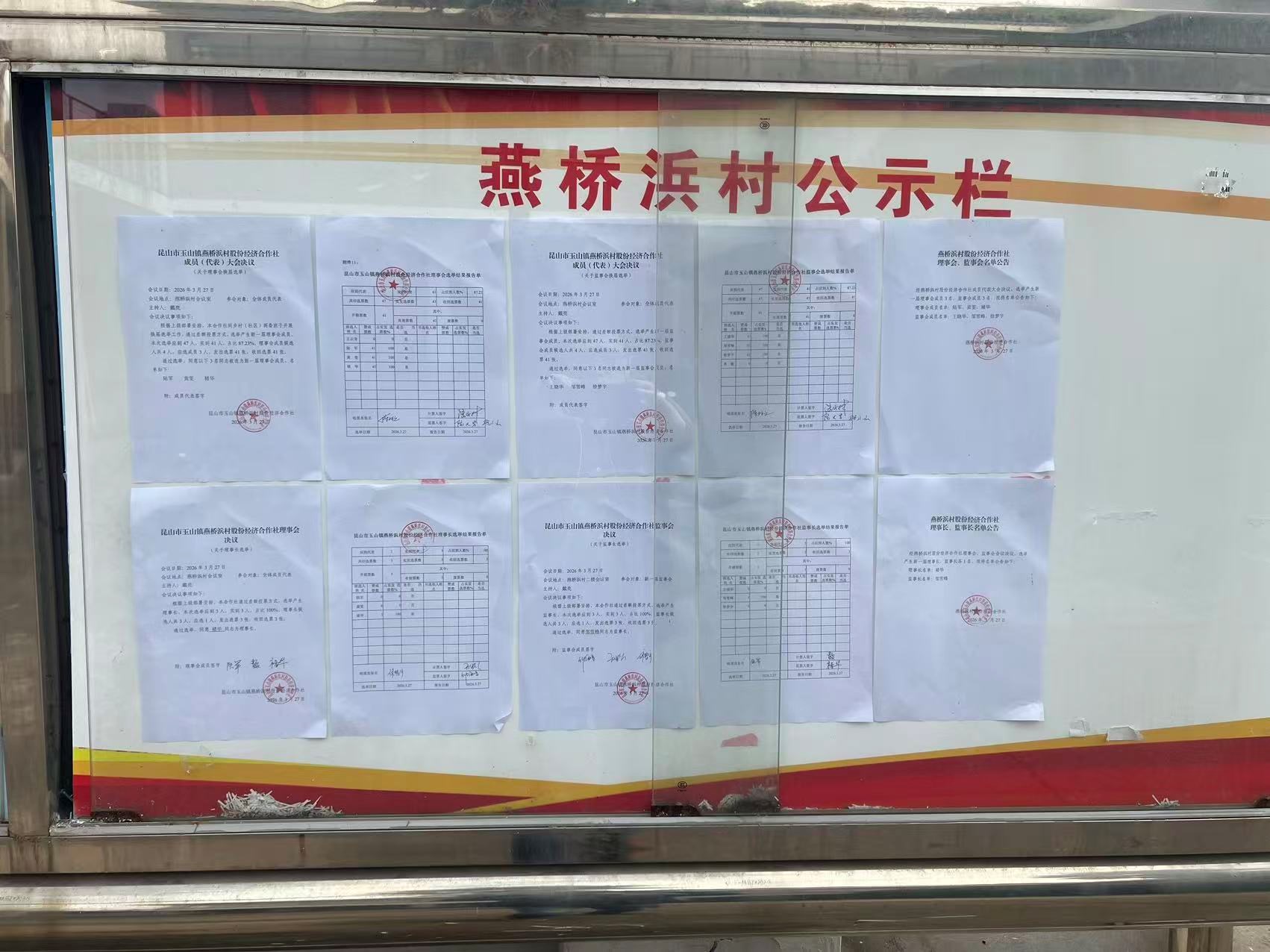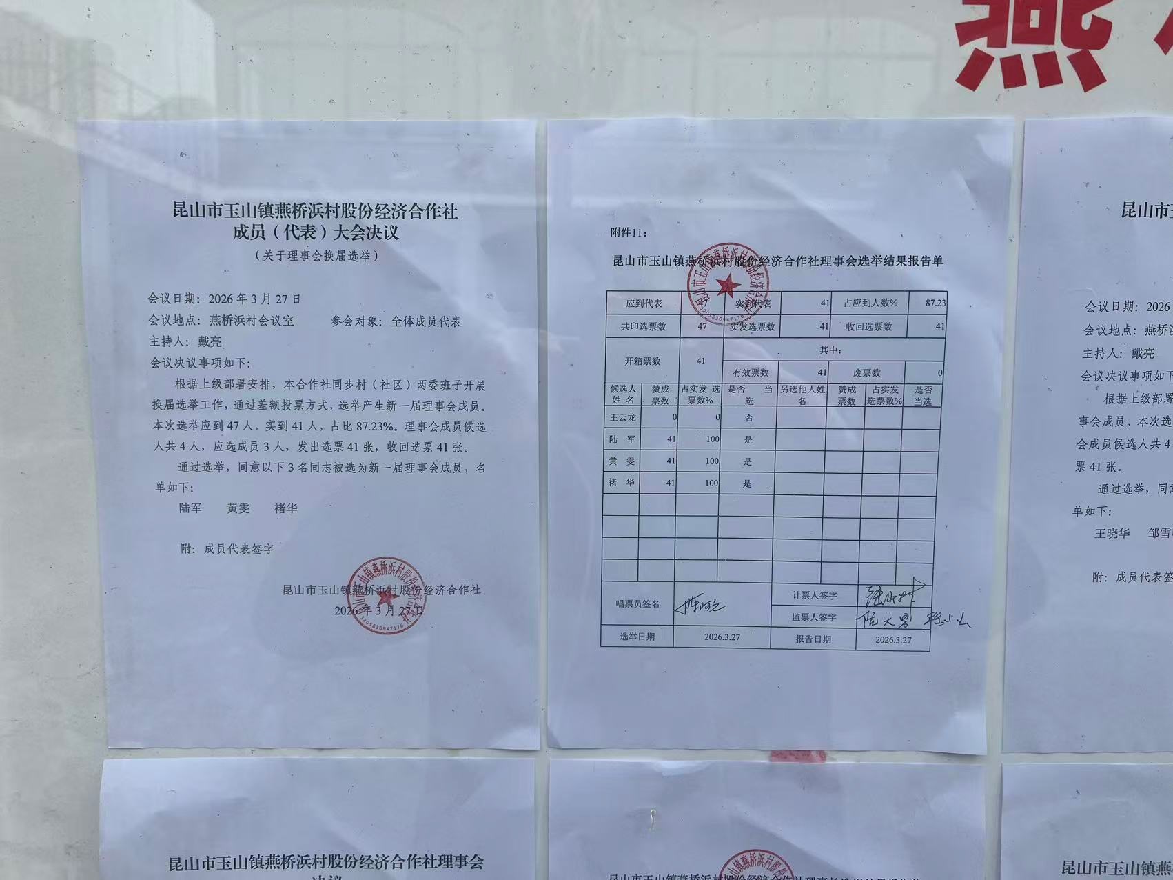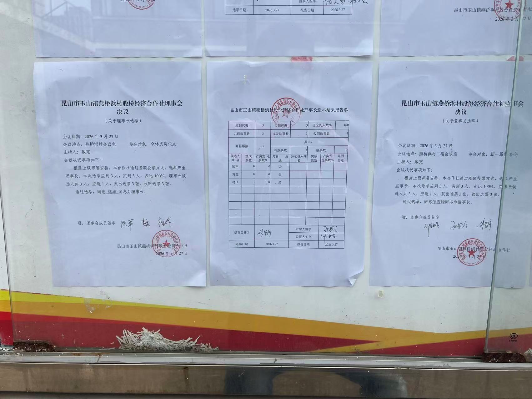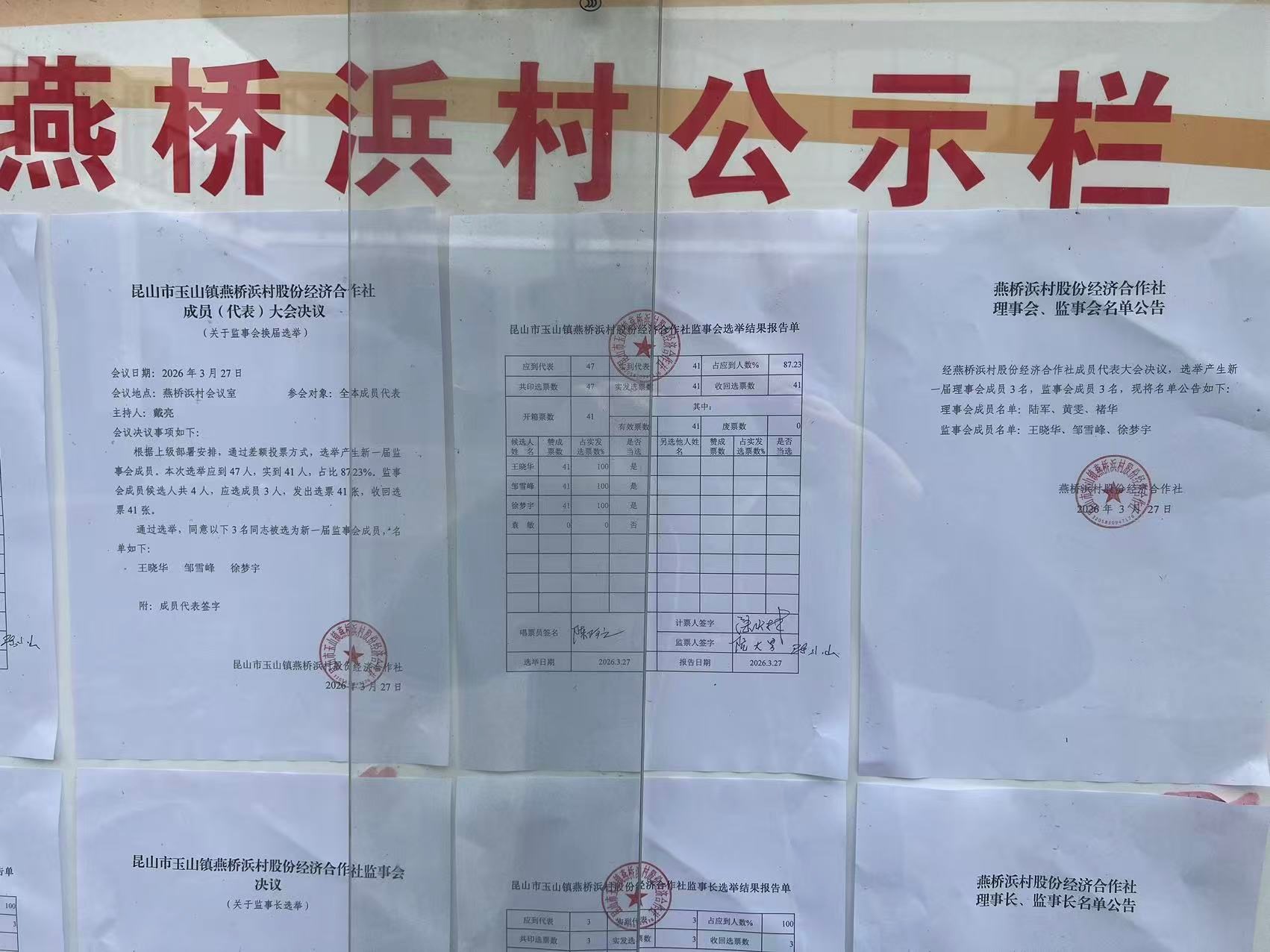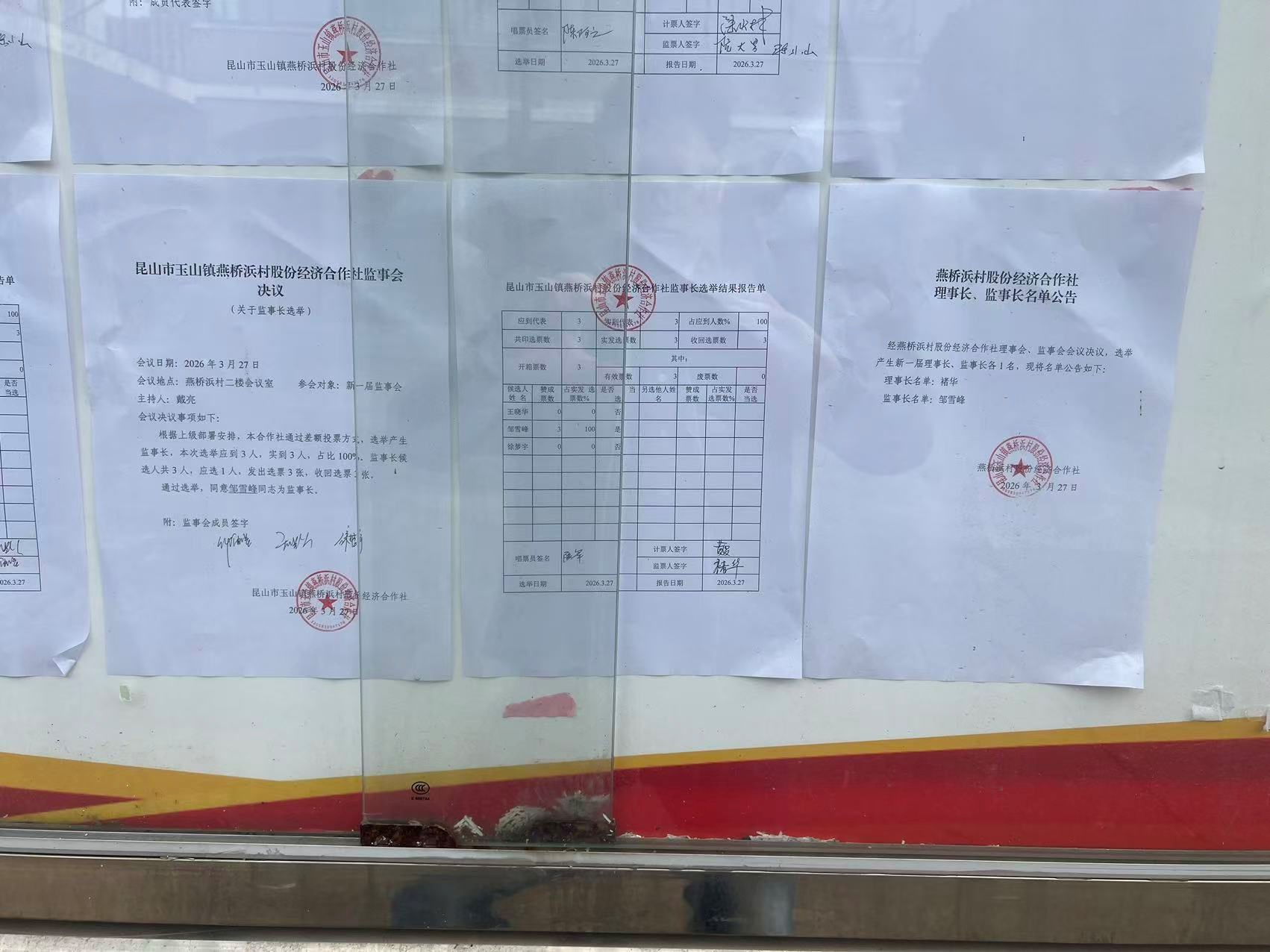 昆山市玉山镇燕桥浜村股份经济合作社选举理事会、监事会、理事长、监事长选举结果公告