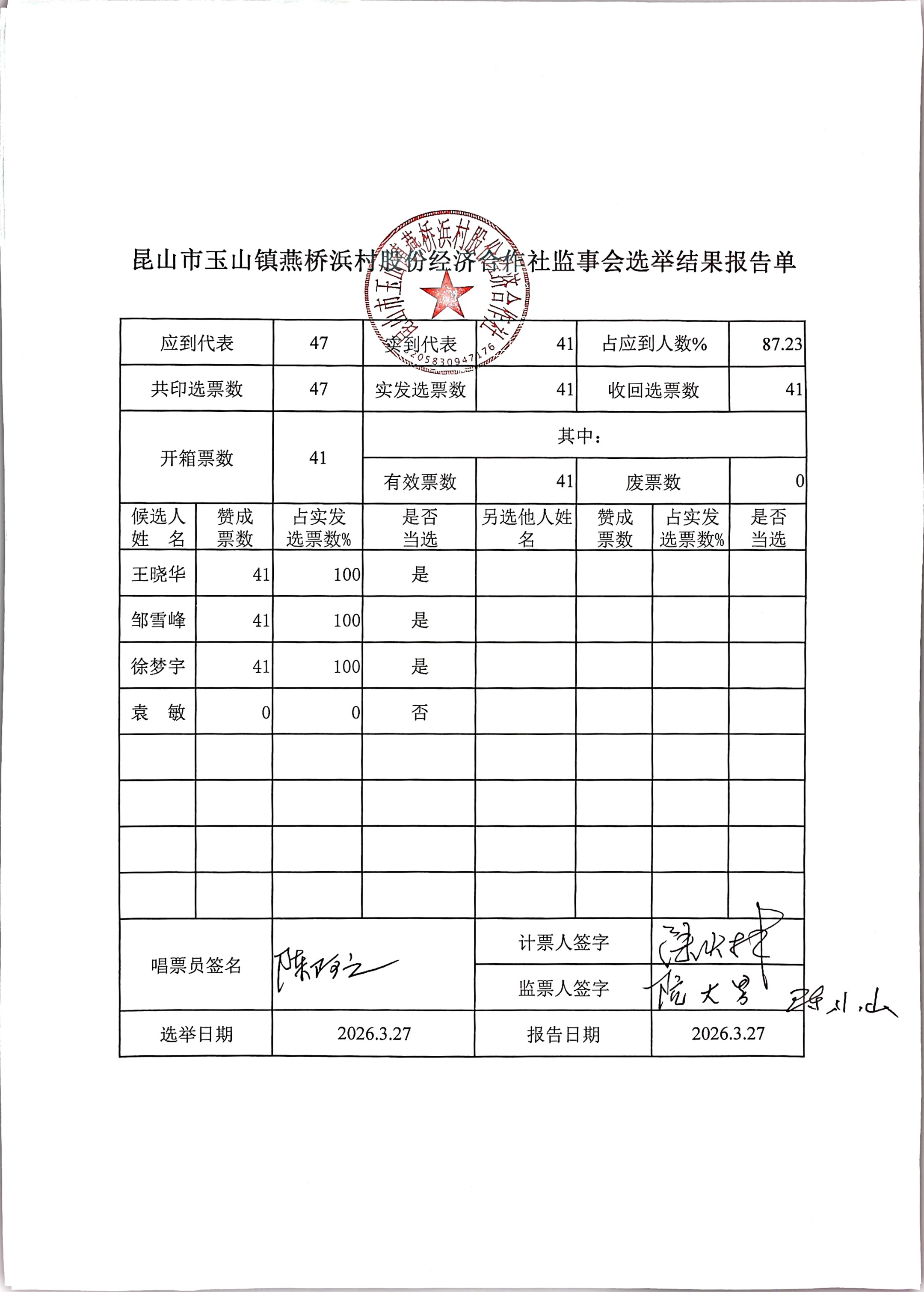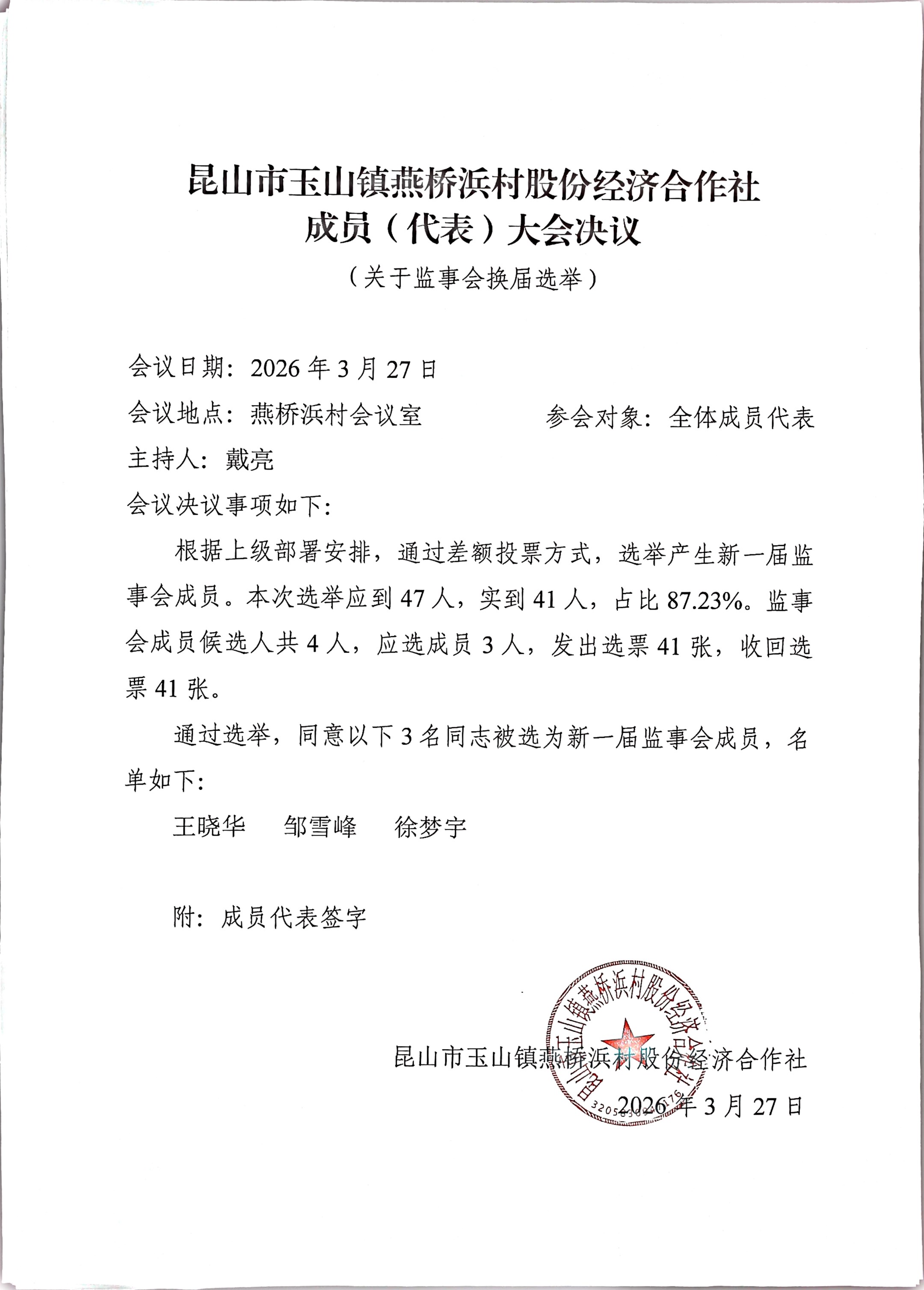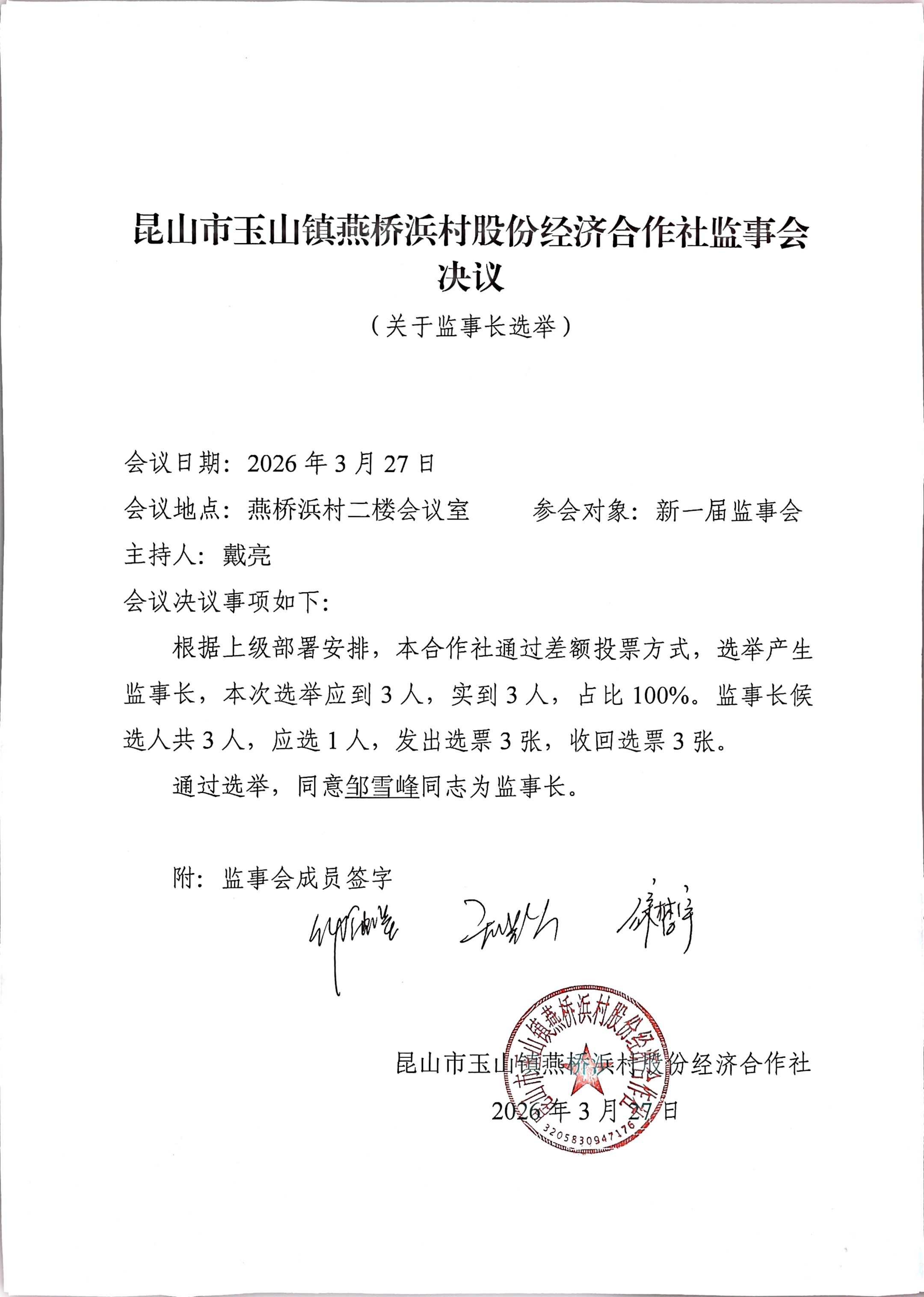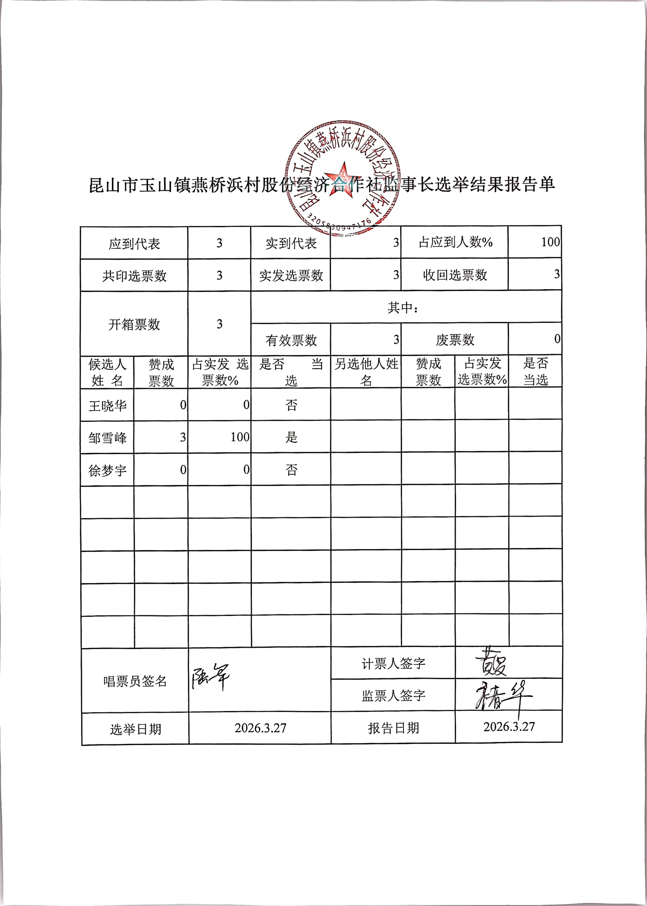 昆山市玉山镇燕桥浜村股份经济合作社选举理事会、监事会、理事长、监事长选举结果公告