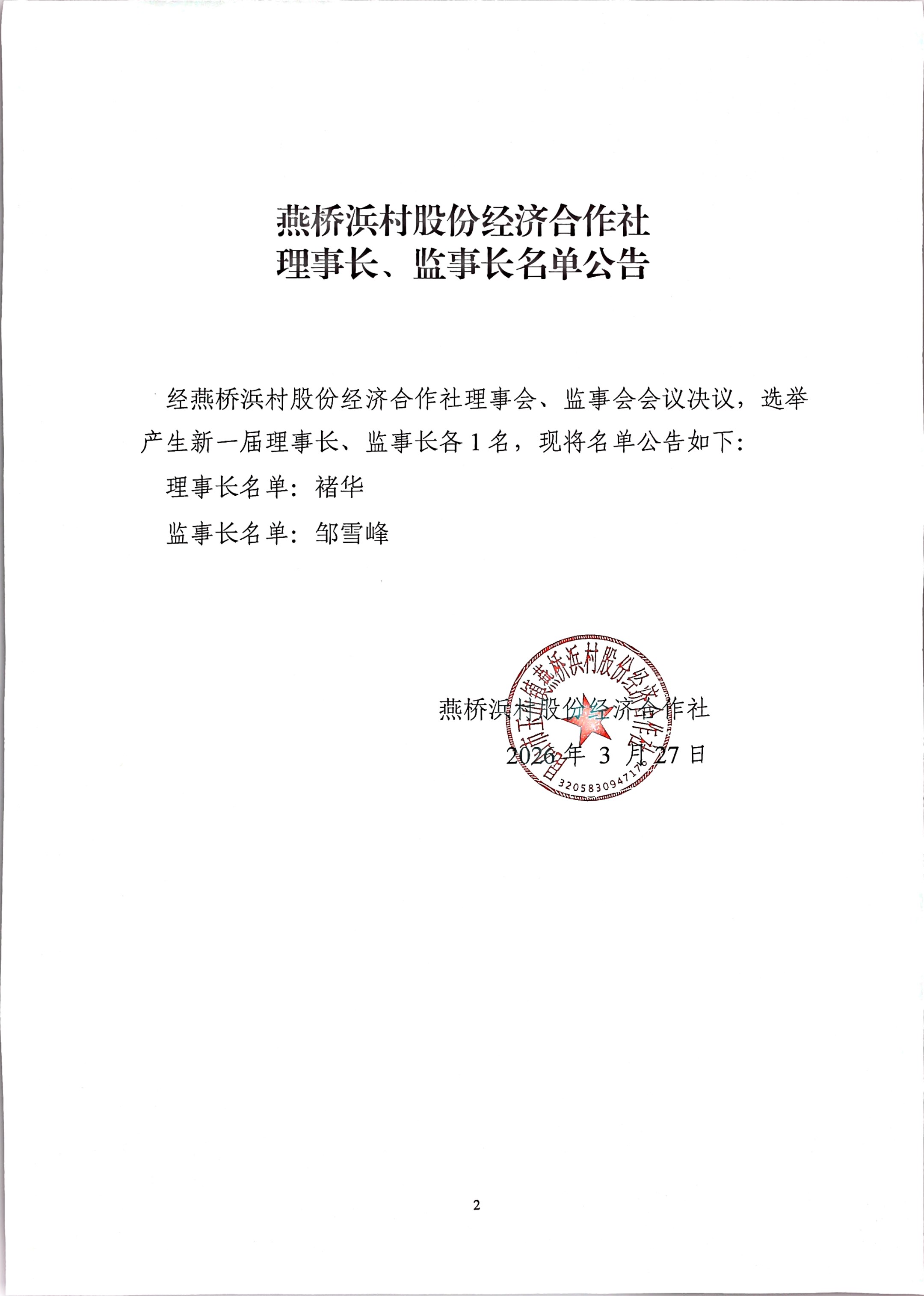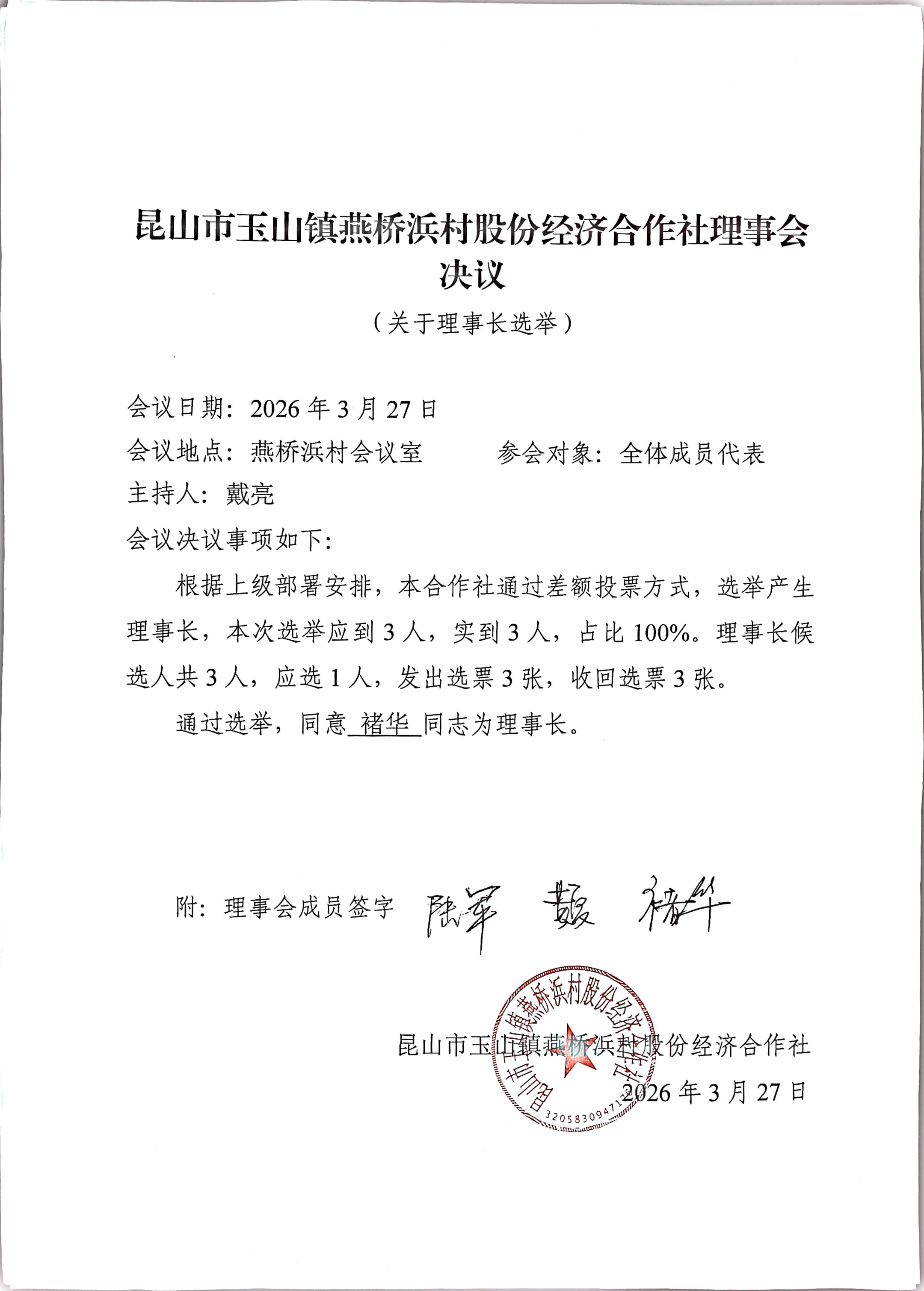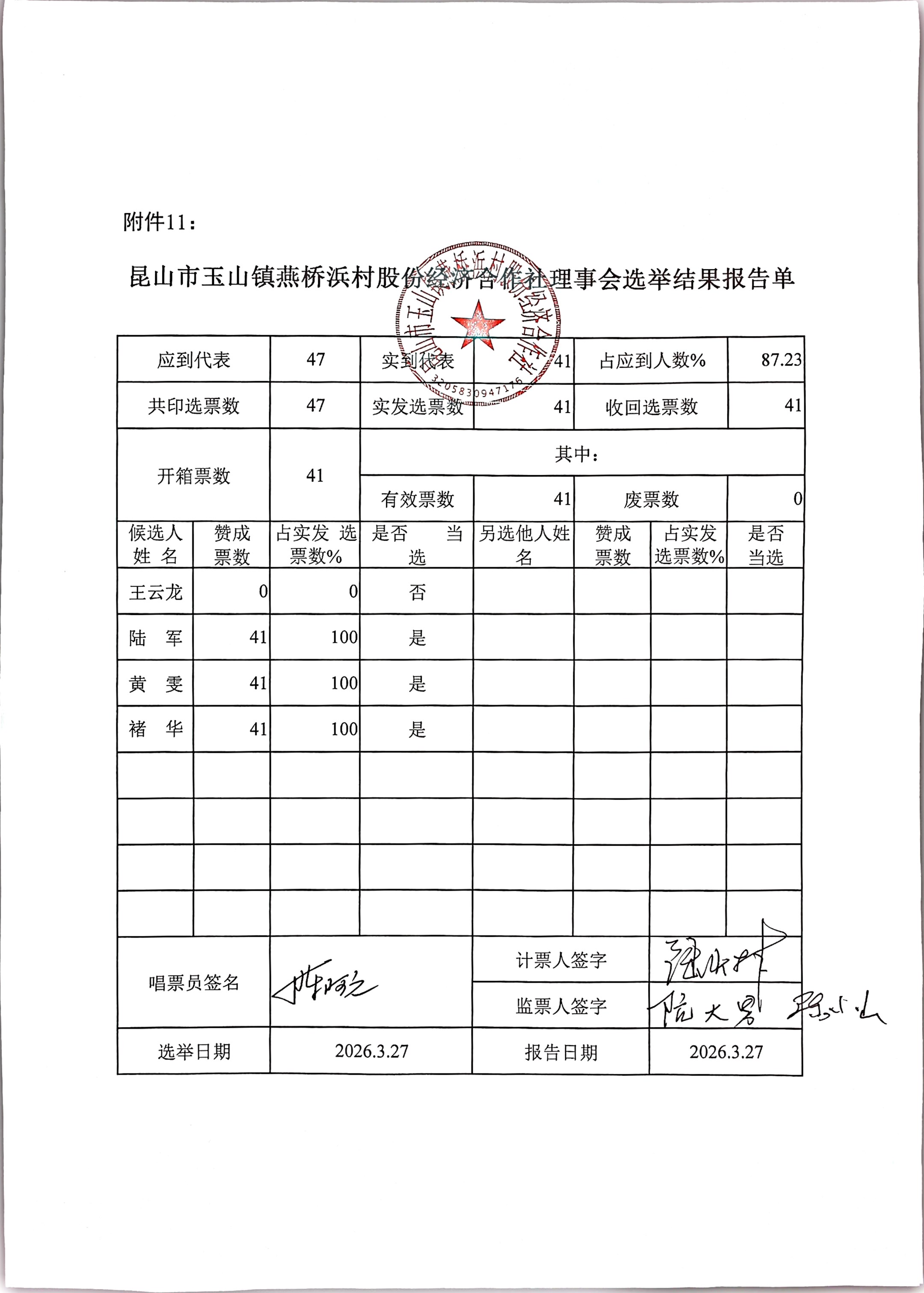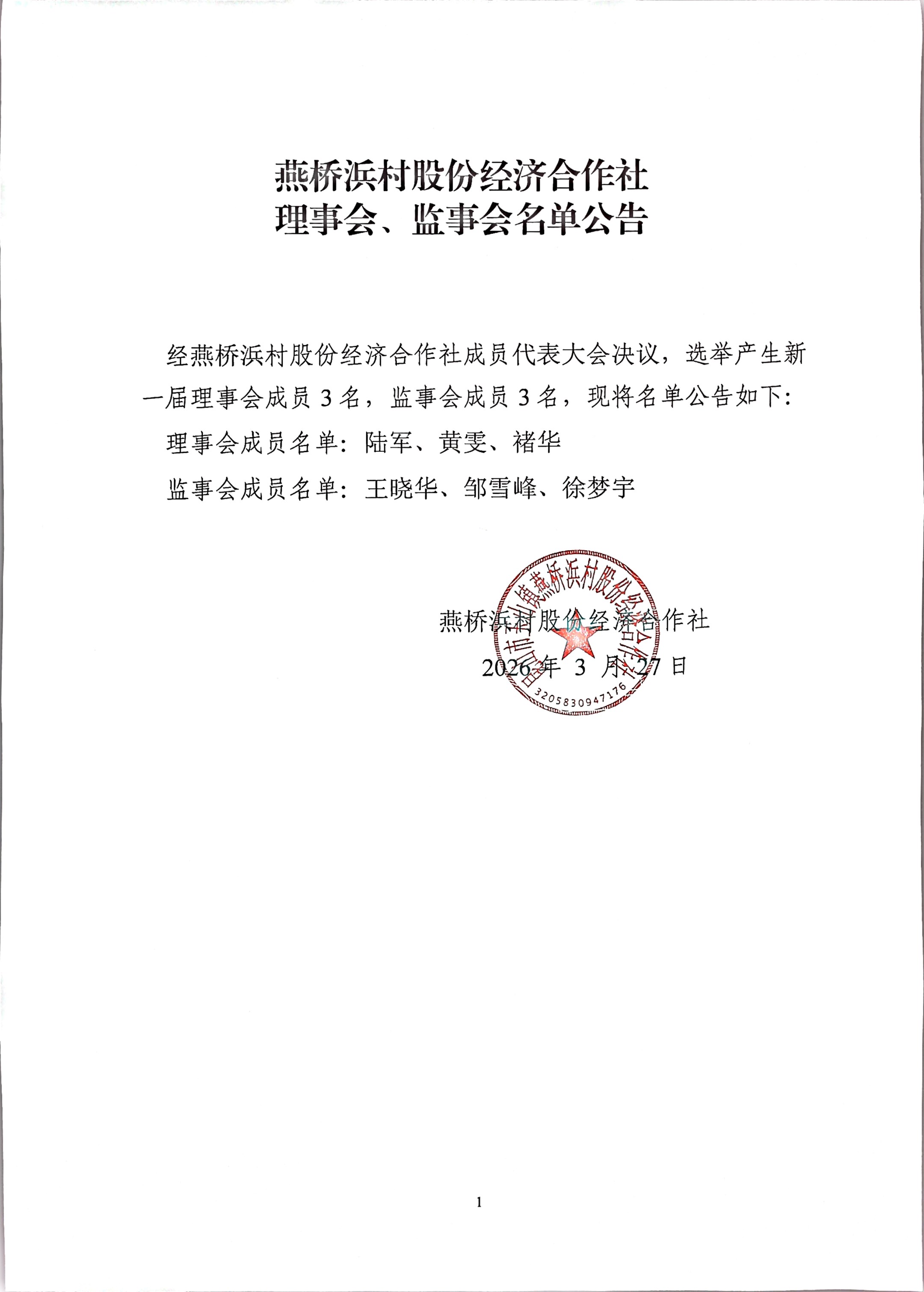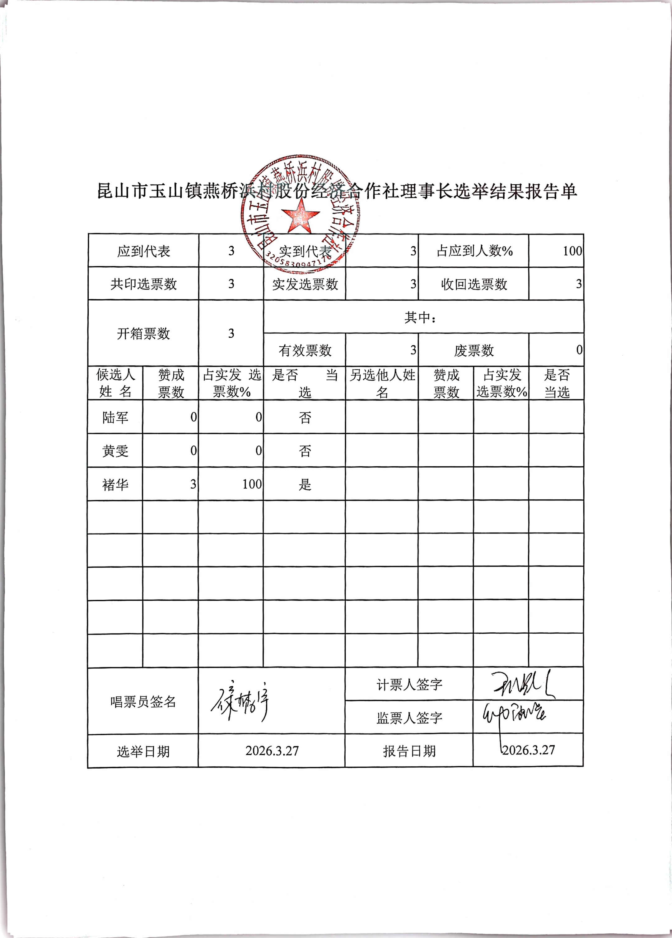 昆山市玉山镇燕桥浜村股份经济合作社选举理事会、监事会、理事长、监事长选举结果公告