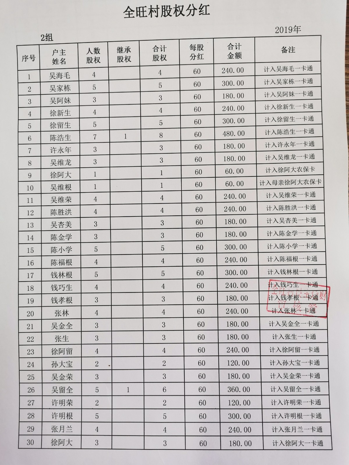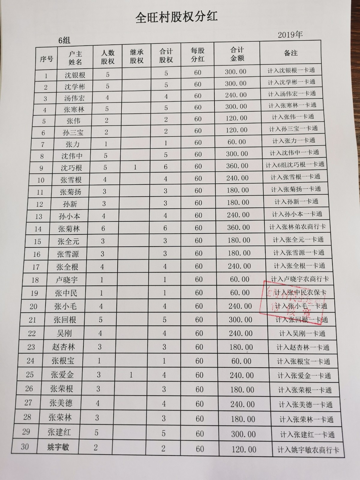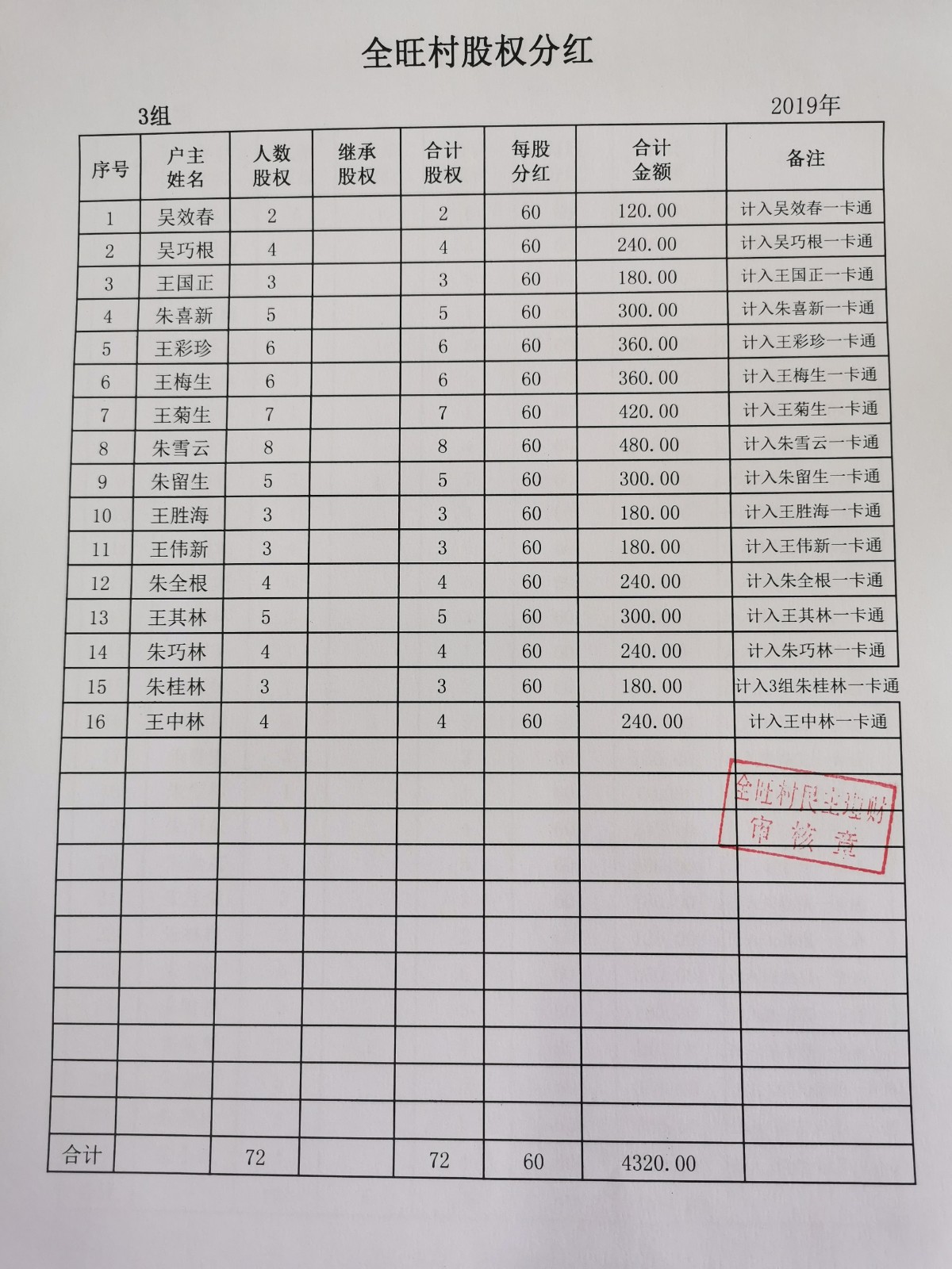 全旺村2019年度股份分红