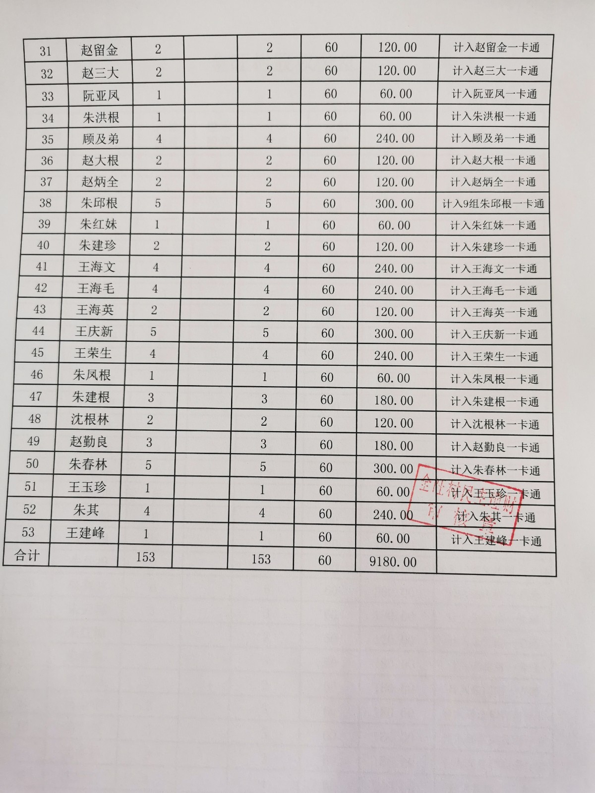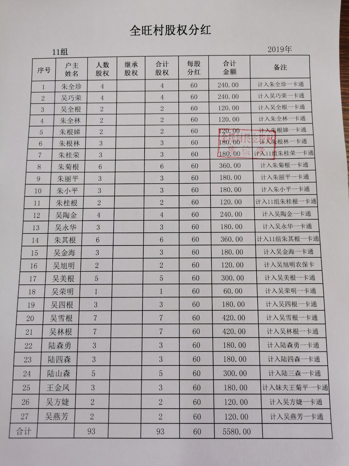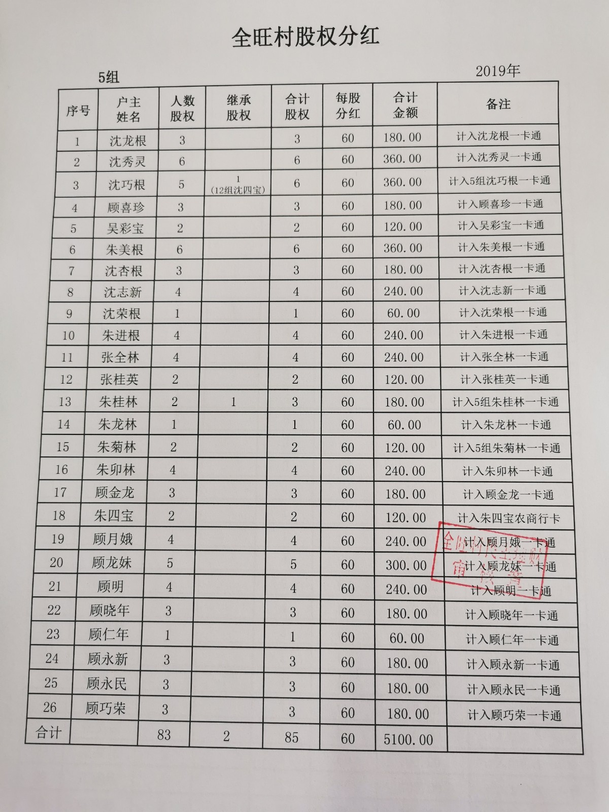 全旺村2019年度股份分红