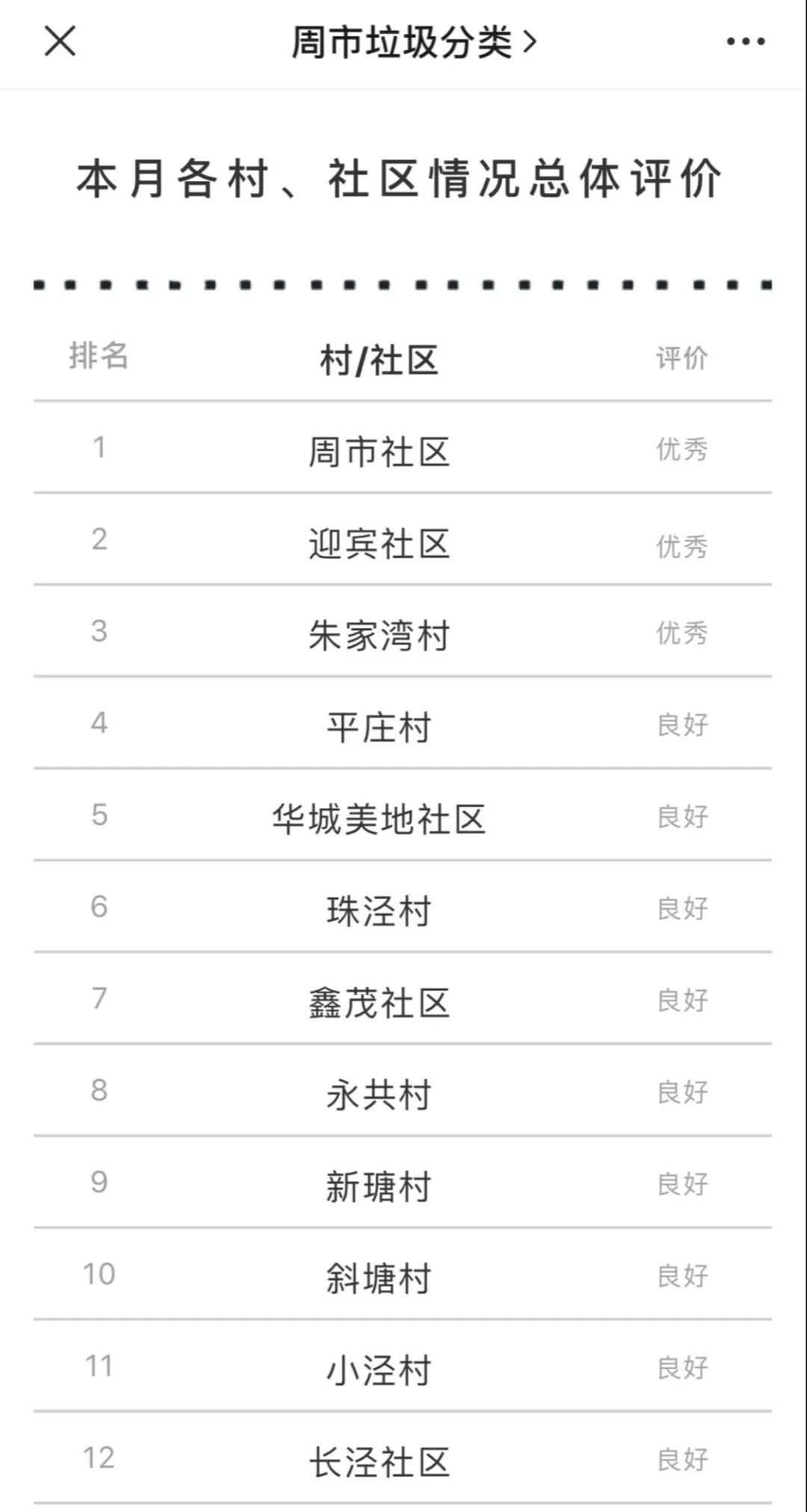 按照党建引领、政府推动、部门联动、全面发动、全民互动“一领四动”基本工作原则,制定生活垃圾分类制度实施方案,成立生活垃圾分类工作领导小组,建立健全保障机制,确保垃圾分类组织管理体系落地生根。 目前,我镇48个小区全部开展垃圾“定时定点”分类,街面全部实现“道路撤桶”,实行定时上门分类收运;共建成小区分类房39间、分类亭141座,配备各类分类收集运输车71辆,建设完成1个再生资源分拣中心和1个垃圾分类宣教中心;易腐垃圾日处理能力达43.1吨(含农村处置站),构建起全镇生活垃圾“大分流、细分类”的分类处理体系。 ▲再生资源分拣中心 ▲垃圾分类宣教中心 依托垃圾“大分流、细分类”体系,以“点、站、场、中心”环卫基础设施建设为重心,因地制宜建设各类垃圾分类处置系统,以后端设施倒逼前端分类,实现了闭环化管理。 投 建好用好各类基础设施,并配置垃圾分类志愿者、督导员360人,严格实施“三定一督”,进一步抓牢源头分类关。 收运 严格执行“四不同”标准,建立与生活垃圾分类相衔接的收运网络,确保分类后的生活垃圾实行分类运输。 处 依托园林绿化垃圾资源化处理站、建筑垃圾及大件垃圾循环利用中心、再生资源分拣中心等垃圾处置系统,实现生活垃圾分类处置闭环。 垃圾分类是项系统工程,没有捷径,唯有常抓细管久久为功方见成效。如何将居民们数十年养成的老习惯扭转过来,是件“虐心”但也有“幸福感”的事。我镇在广泛宣传搭建载体的基础上,全面提升居民参与率,将垃圾分类变为“全民动作”。 ▲广泛宣传动员 制定生活垃圾分类业务指导和知识手册,加强垃圾分类专员、宣讲员、志愿者及督导员培训工作,组建一支由“十人讲师团、百人督导团、千人志愿者”组成先锋队伍。深入开展垃圾分类宣传示范活动,引导全民参与垃圾分类,共树文明新风。仅2019年,我镇开展垃圾分类进村(社区)、学校、广场宣传活动百余次。 同时,进一步深化党员先锋、居民榜样示范垃圾分类的“乘积效应”,通过以点带面,形成带动邻里、影响楼组、辐射村(社区)的榜样效应。 ▲以点带面,全面发动 把生活垃圾分类工作作为对各村(社区)的重要考核内容,每月形成督查通报并对外公示“红黑榜”,对排名末尾的村(社区)将根据上级要求启动约谈程序。 结合《周市镇小区物业垃圾分类“以奖代补”管理办法(试行)》、借好《苏州市生活垃圾分类管理条例》的东风,完善物业考核制度,督促物业做好日常撤桶与保洁工作,做到小区内垃圾不遗漏、环境保洁有质量。 依据《周市镇农村生活垃圾分类考核办法》,各村以处理站收运可堆肥垃圾二维码扫描的评定为准,根据收运时的垃圾分类情况和数量分为好、中、差三个等级,每季度按照以价值40、30、20元的实物奖励给农户。 同时,各村社区根据实际情况,积极开展垃圾分类积分兑换等活动,进一步调动广大居民参与垃圾分类的积极性与正确率,使垃圾分类工作深入民心。