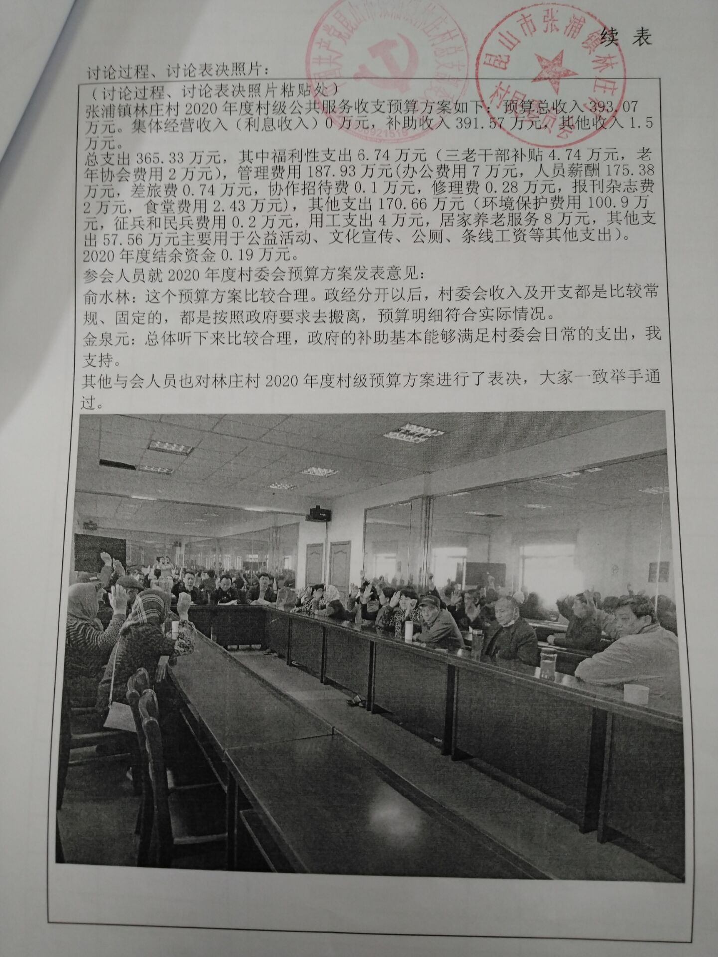 张浦镇林庄村2020年度村级公共服务收支预算方案如下:预算总收入393.07万元。集体经营收入(利息收入)0万元,补助收入391.57万元,其他收入1.5万元。