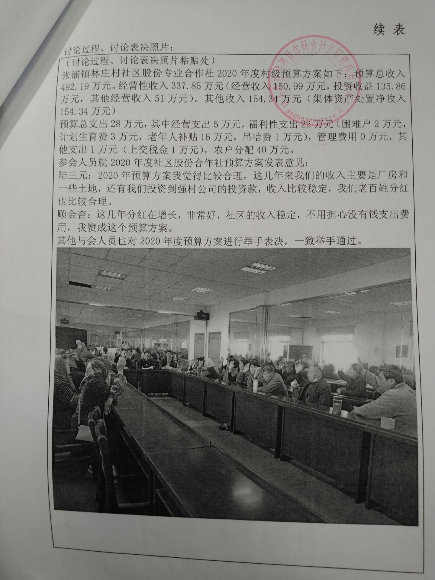 张浦镇林庄村社区股份专业合作社2020年度村级预算方案如下:预算总收入492.19万元。经营性收入337.85万元(经营收入150.99万元,投资收益135.86万元,其他经营收入51万元)。其他收入154.34万元(集体资产处置净收入154.34万元)