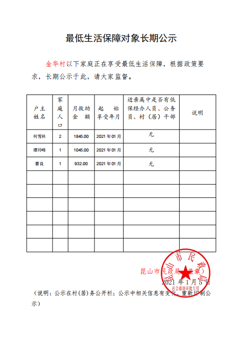 2021年最低生活保障对象长期公示: