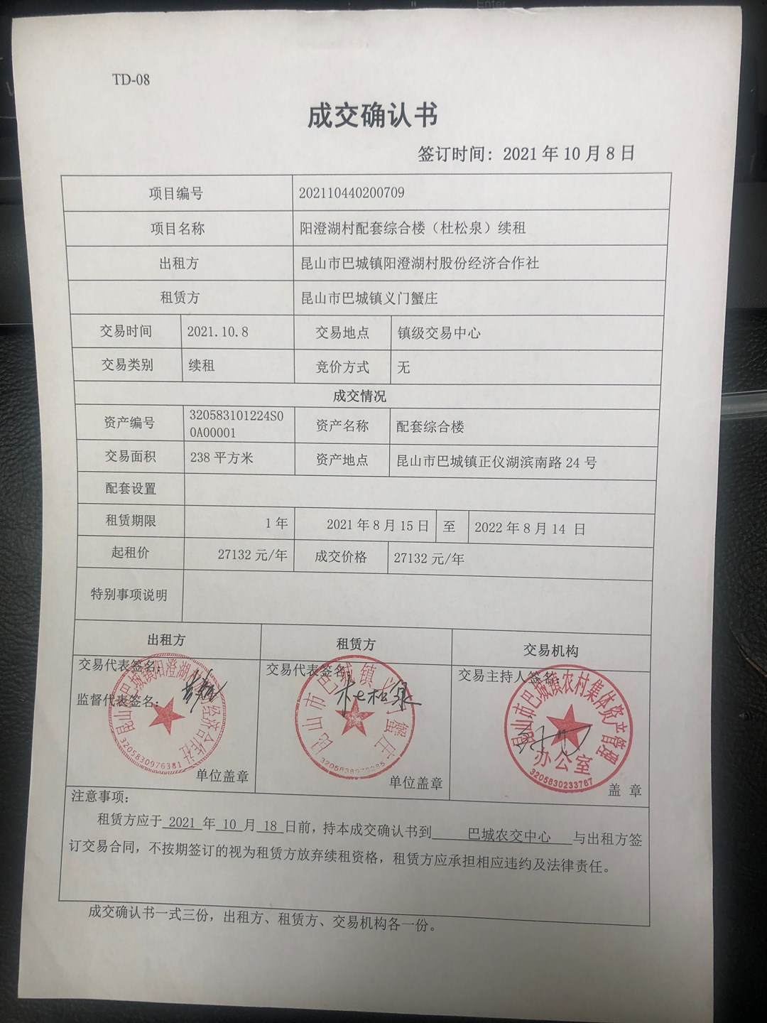 阳澄湖村配套综合楼(杜松泉)续租交易结果