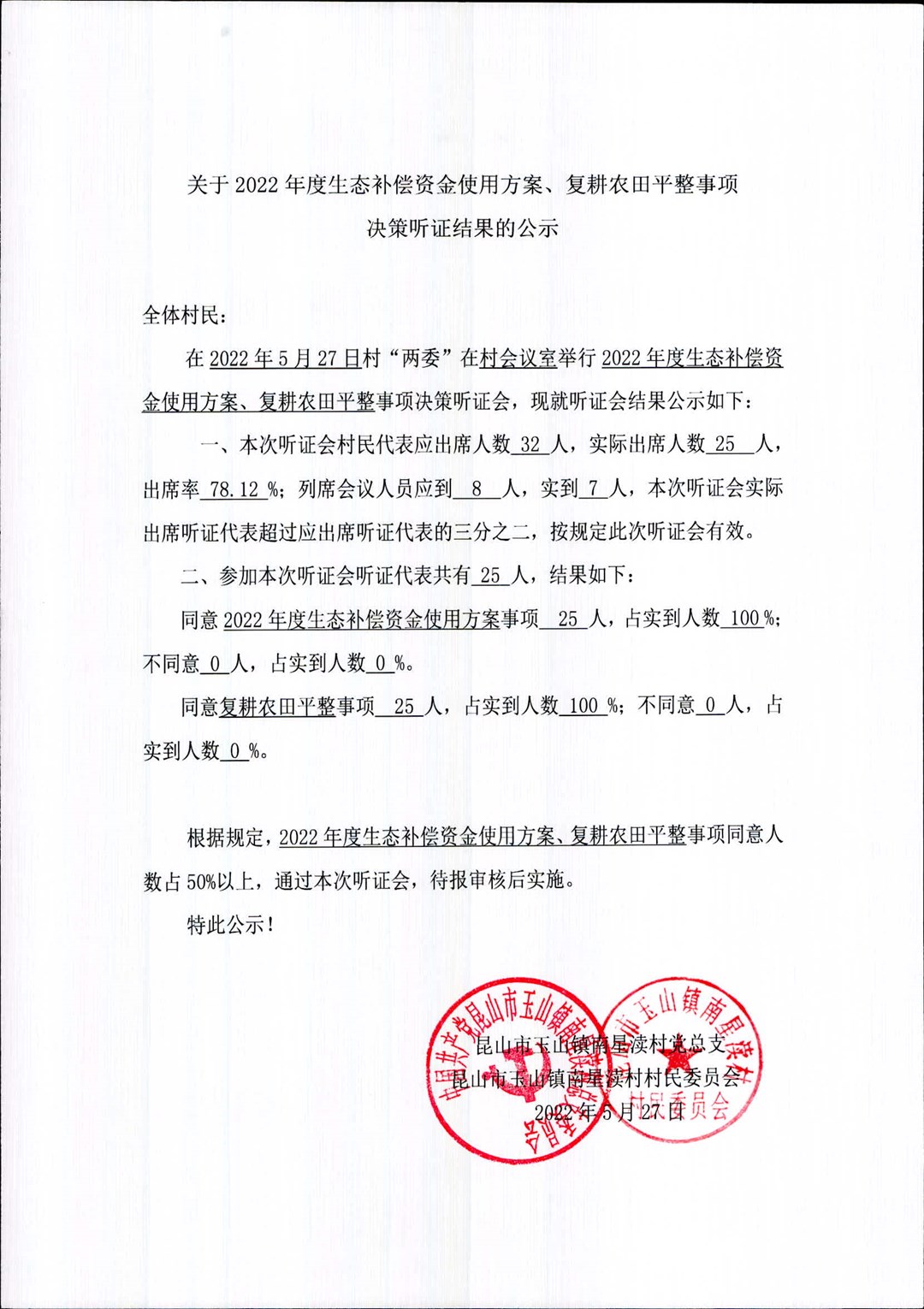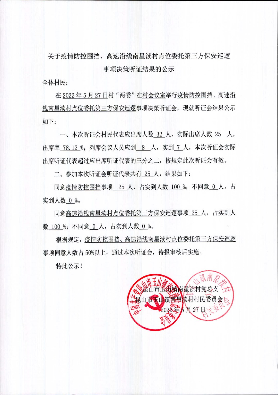关于南星渎村委会5月27日听证会结果的公示