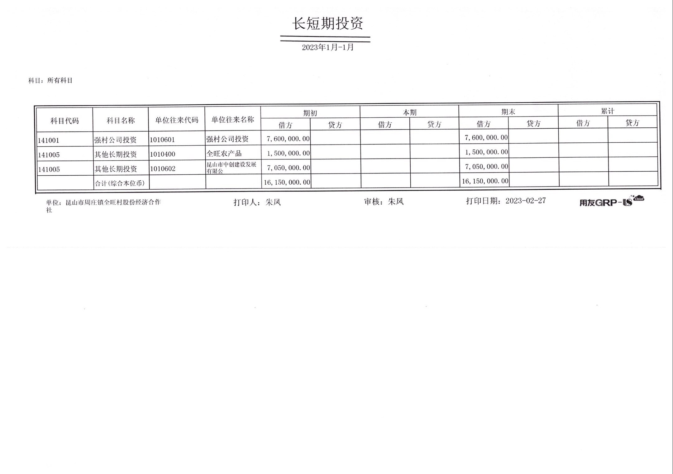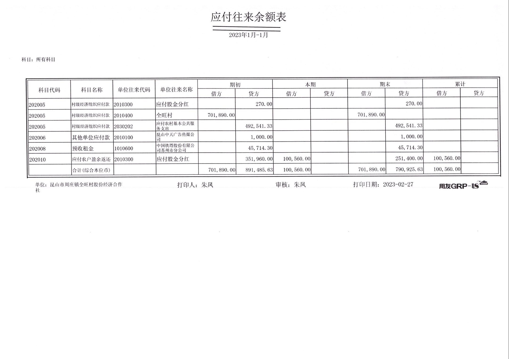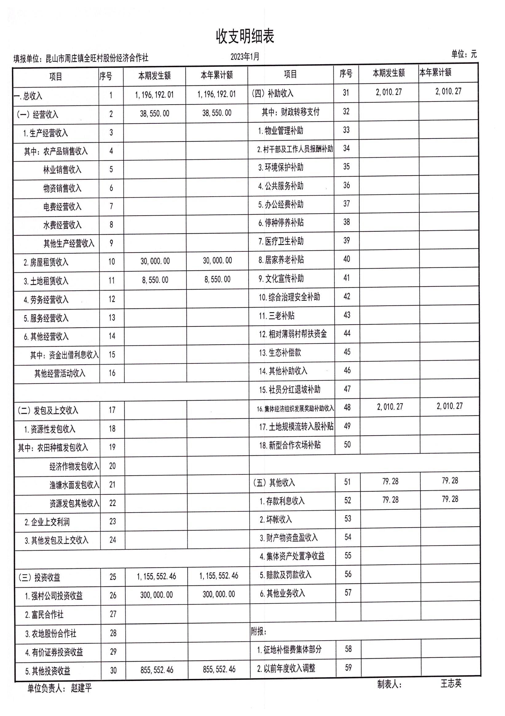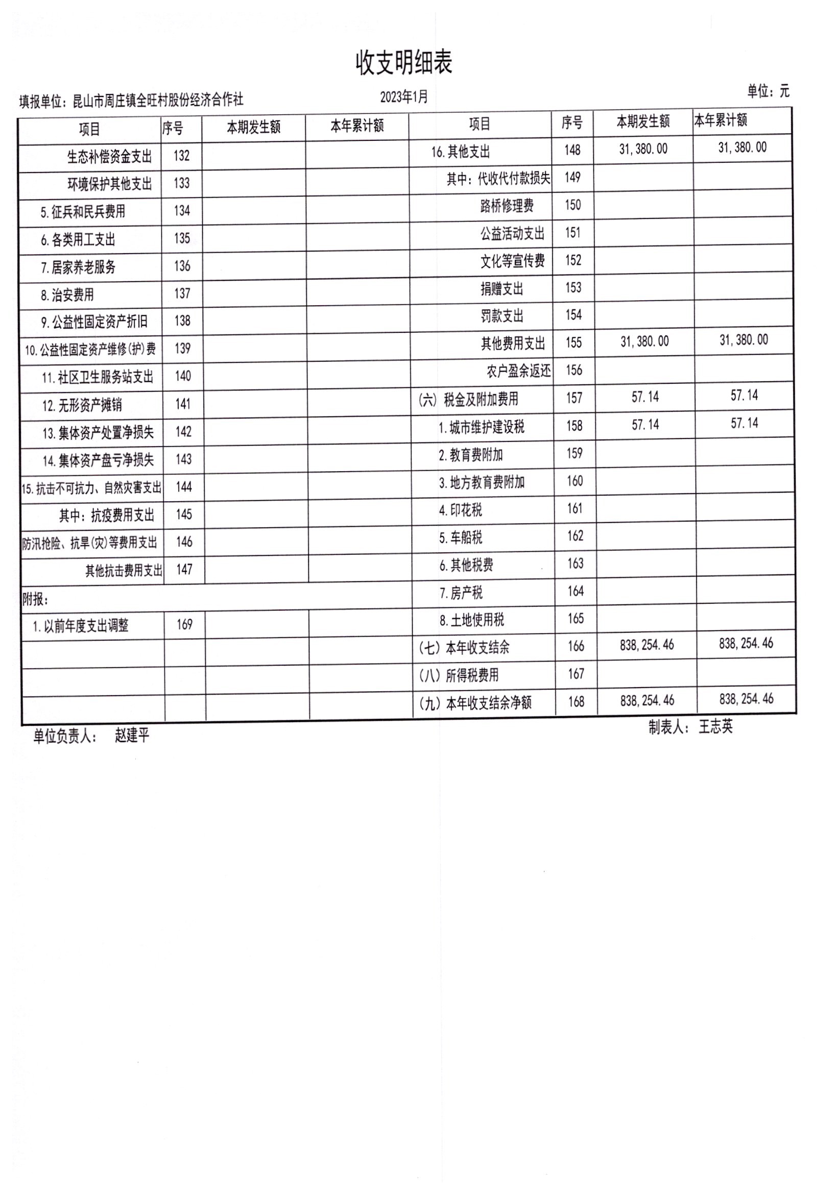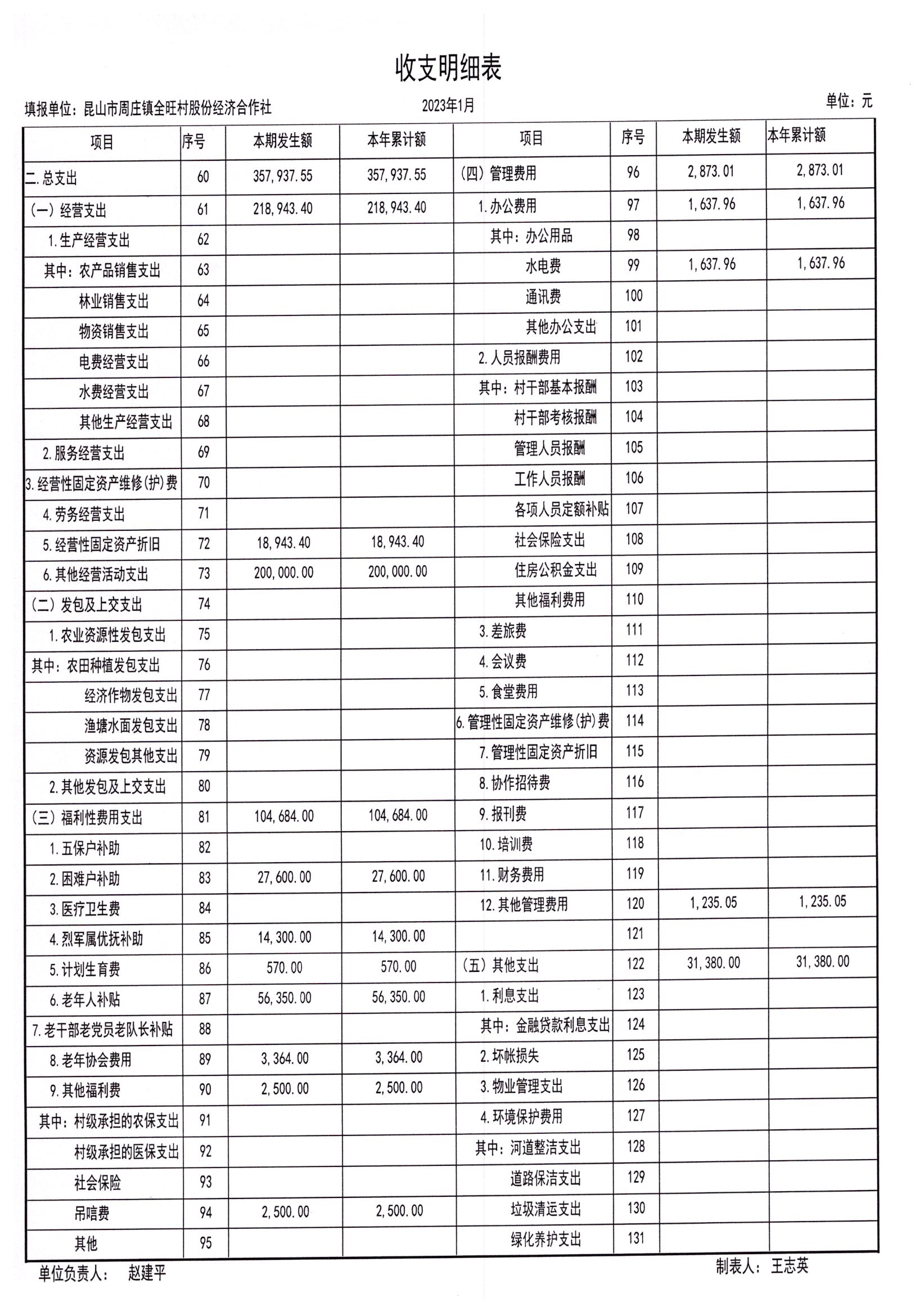 全旺村股份经济合作社2023年1月财务公开
