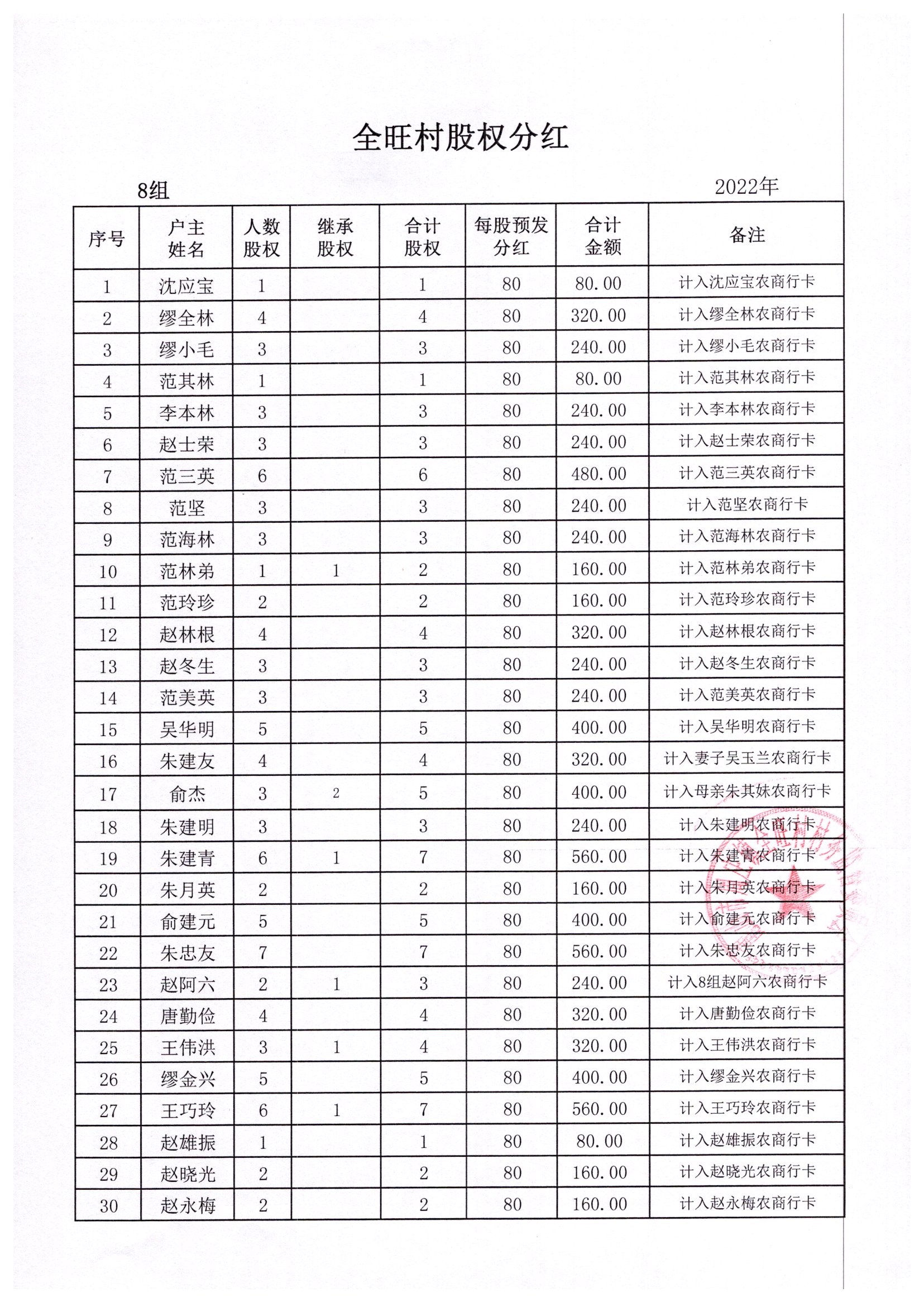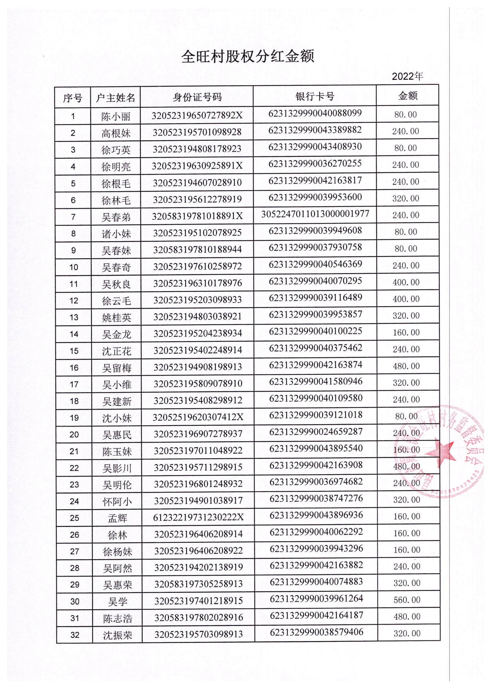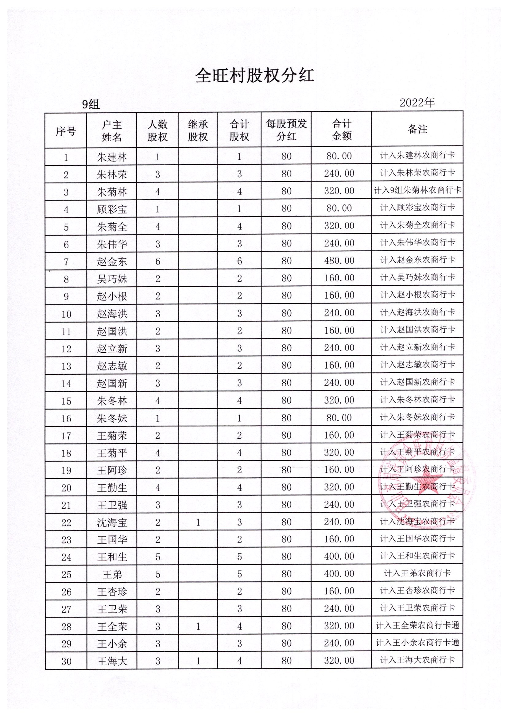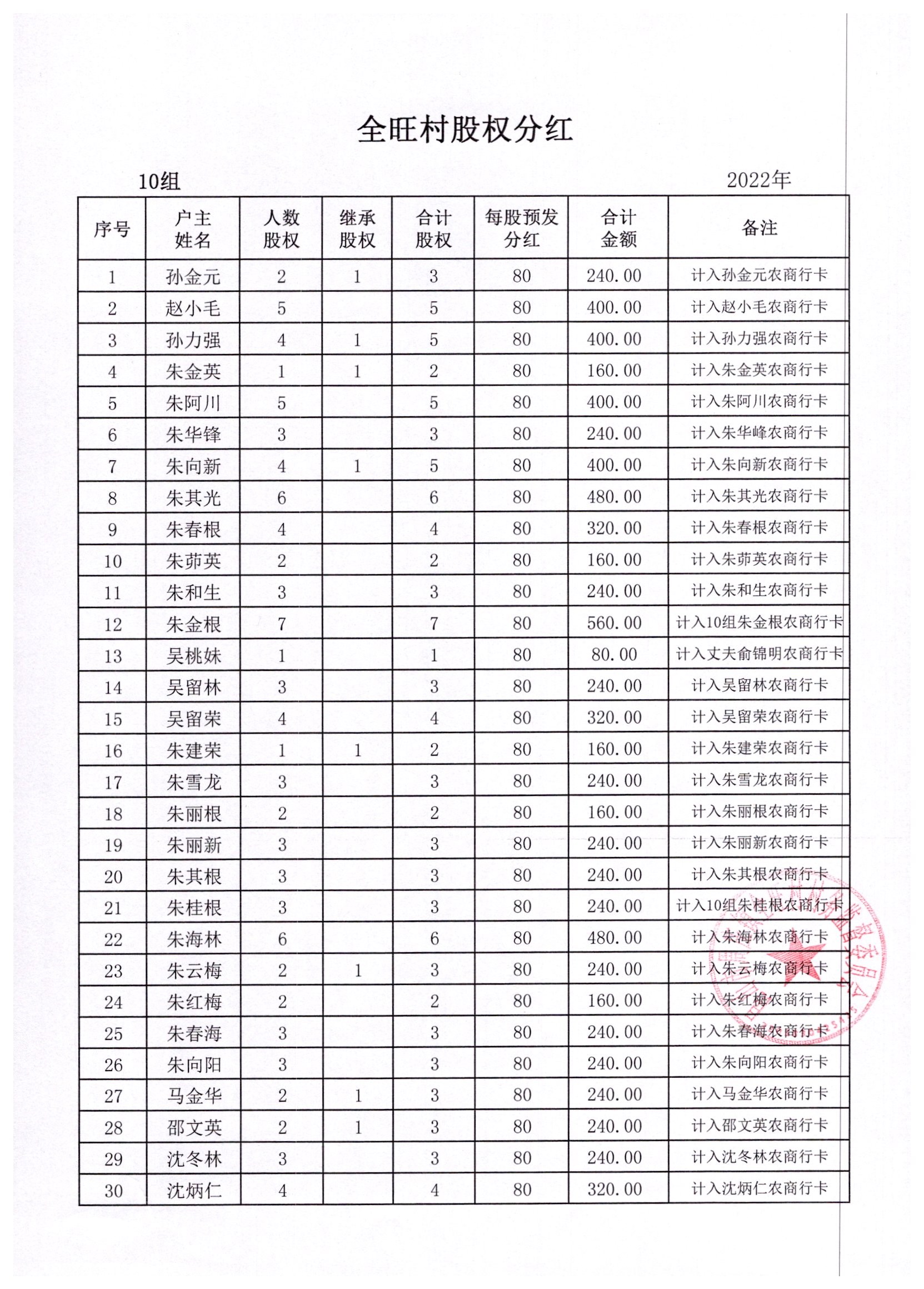 全旺村2022年股权分红明细