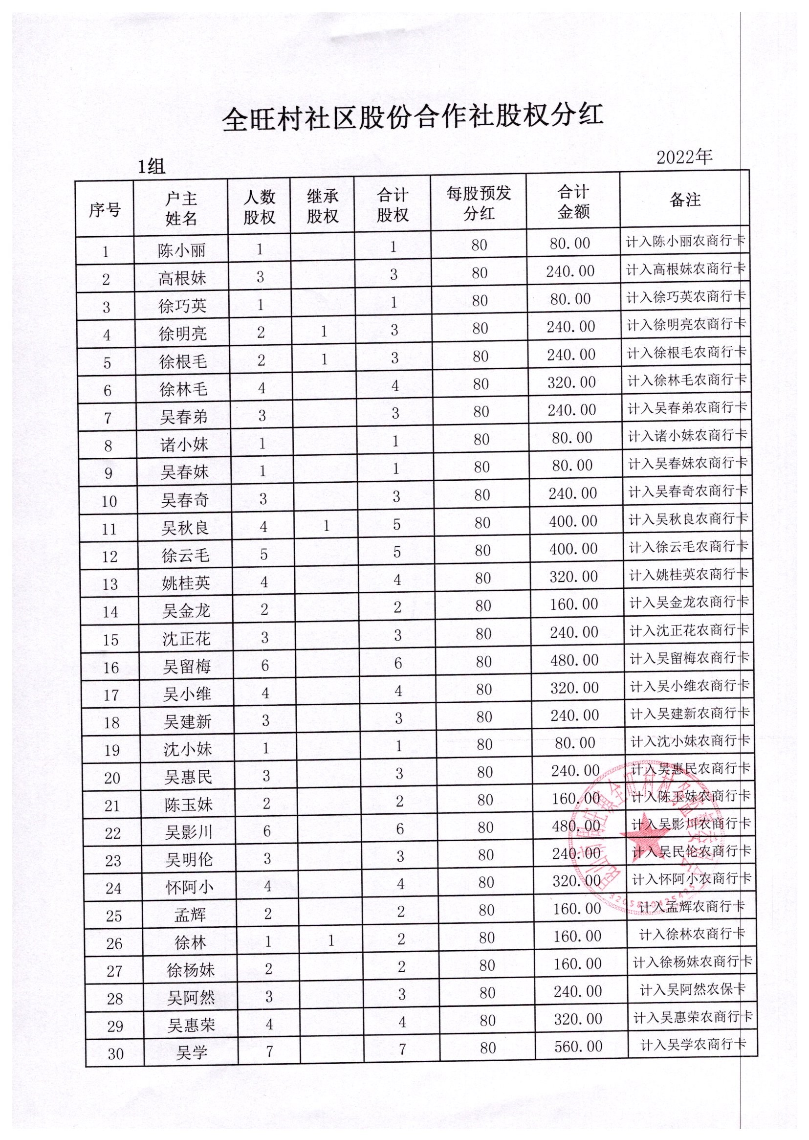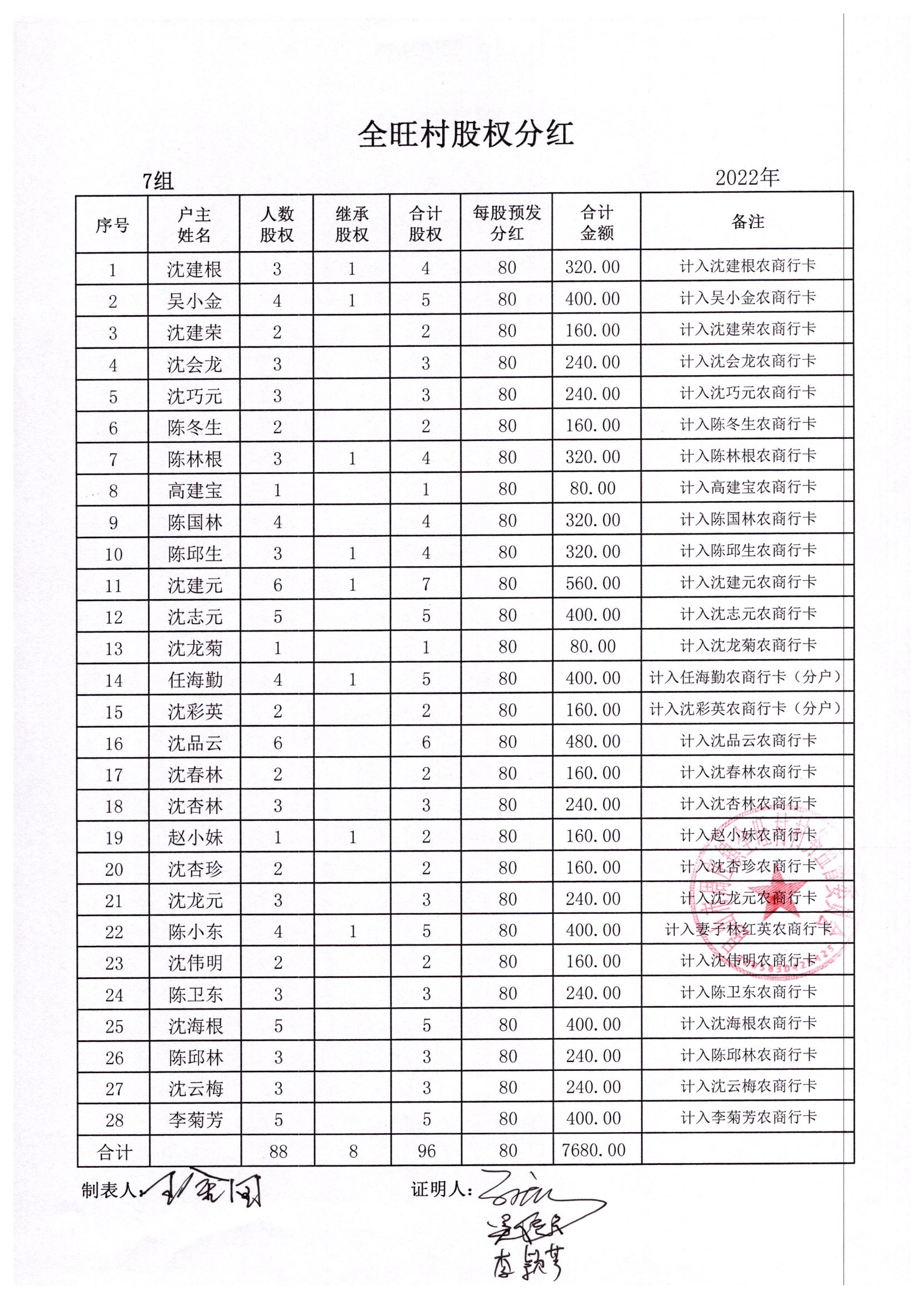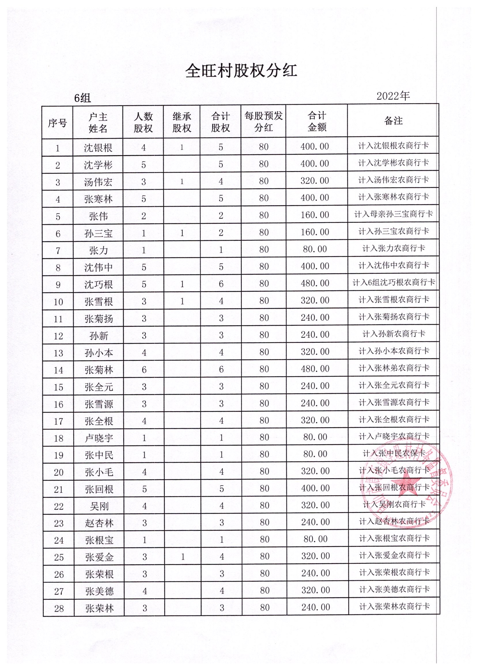 全旺村2022年股权分红明细