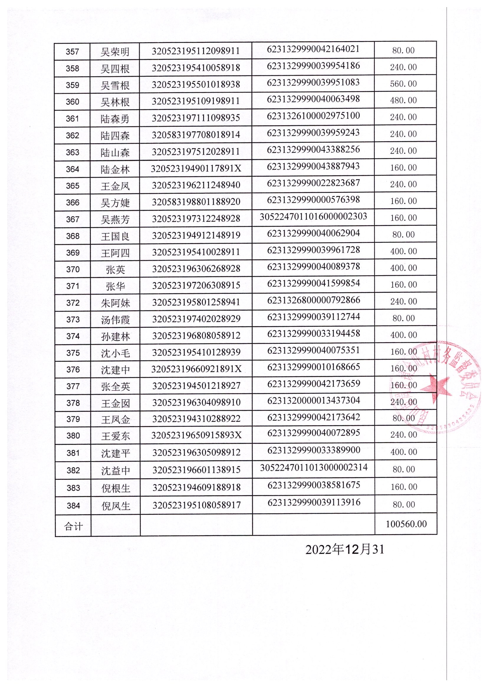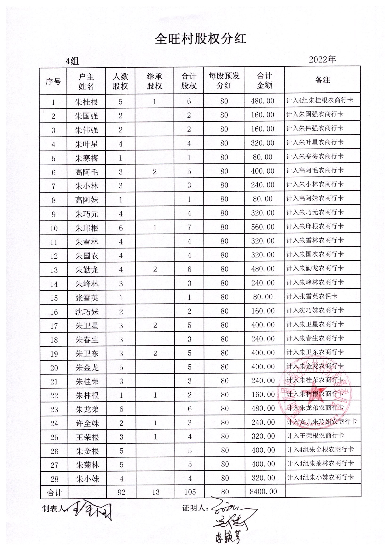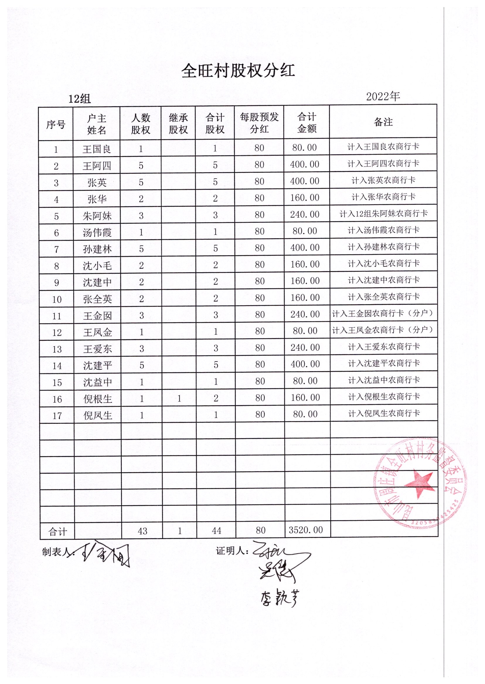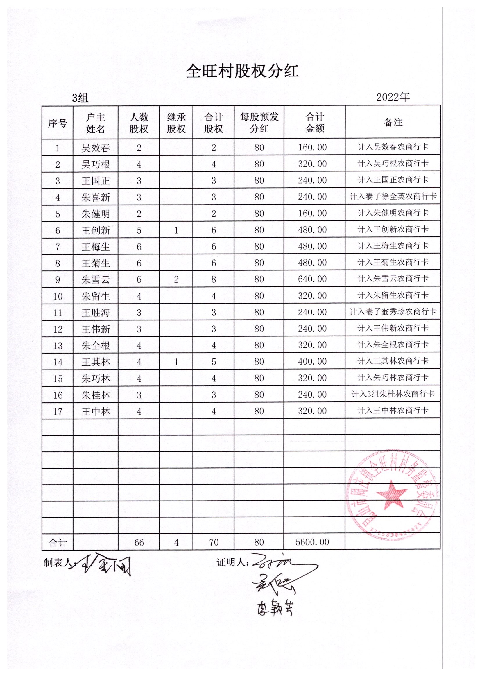 全旺村2022年股权分红明细