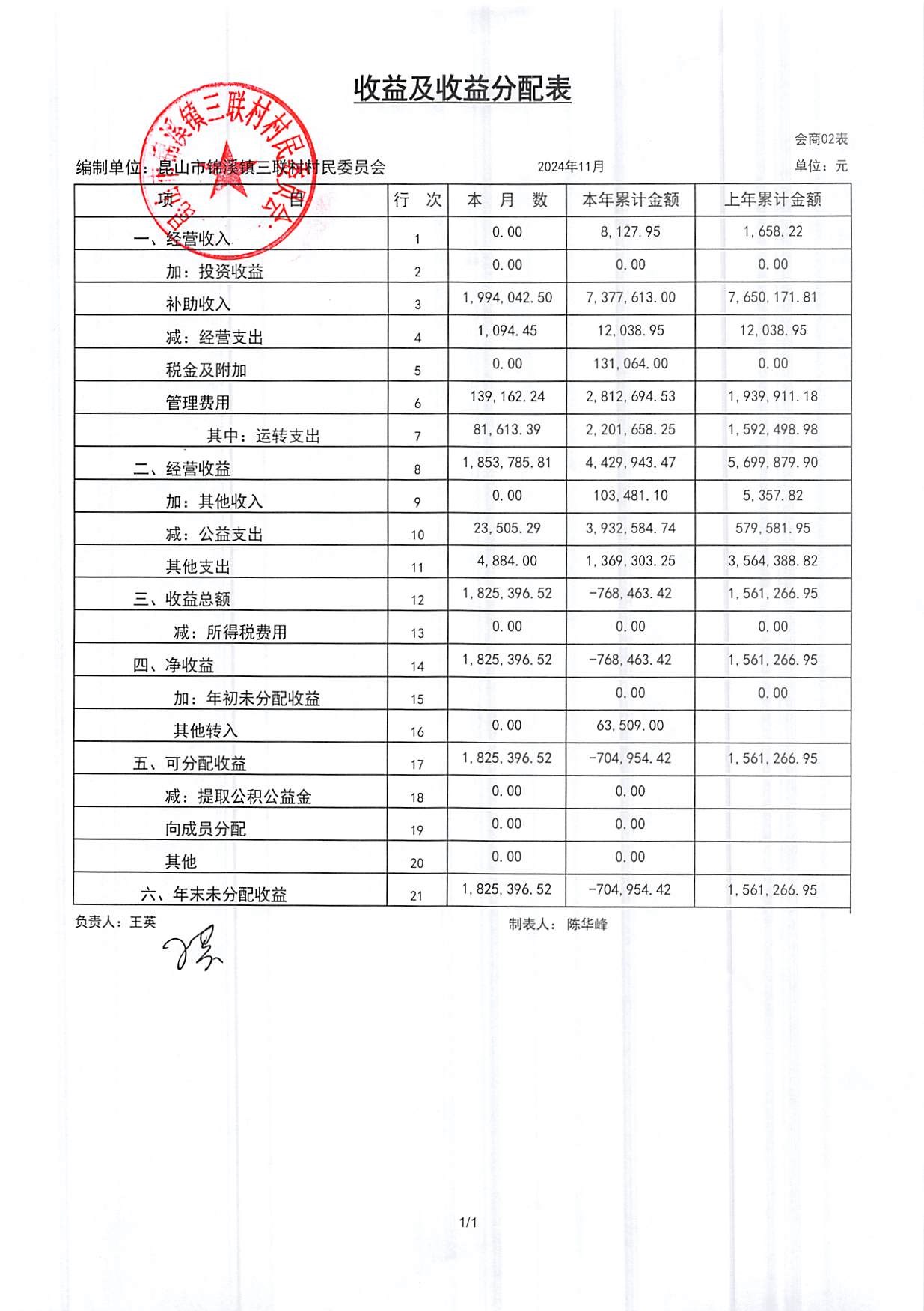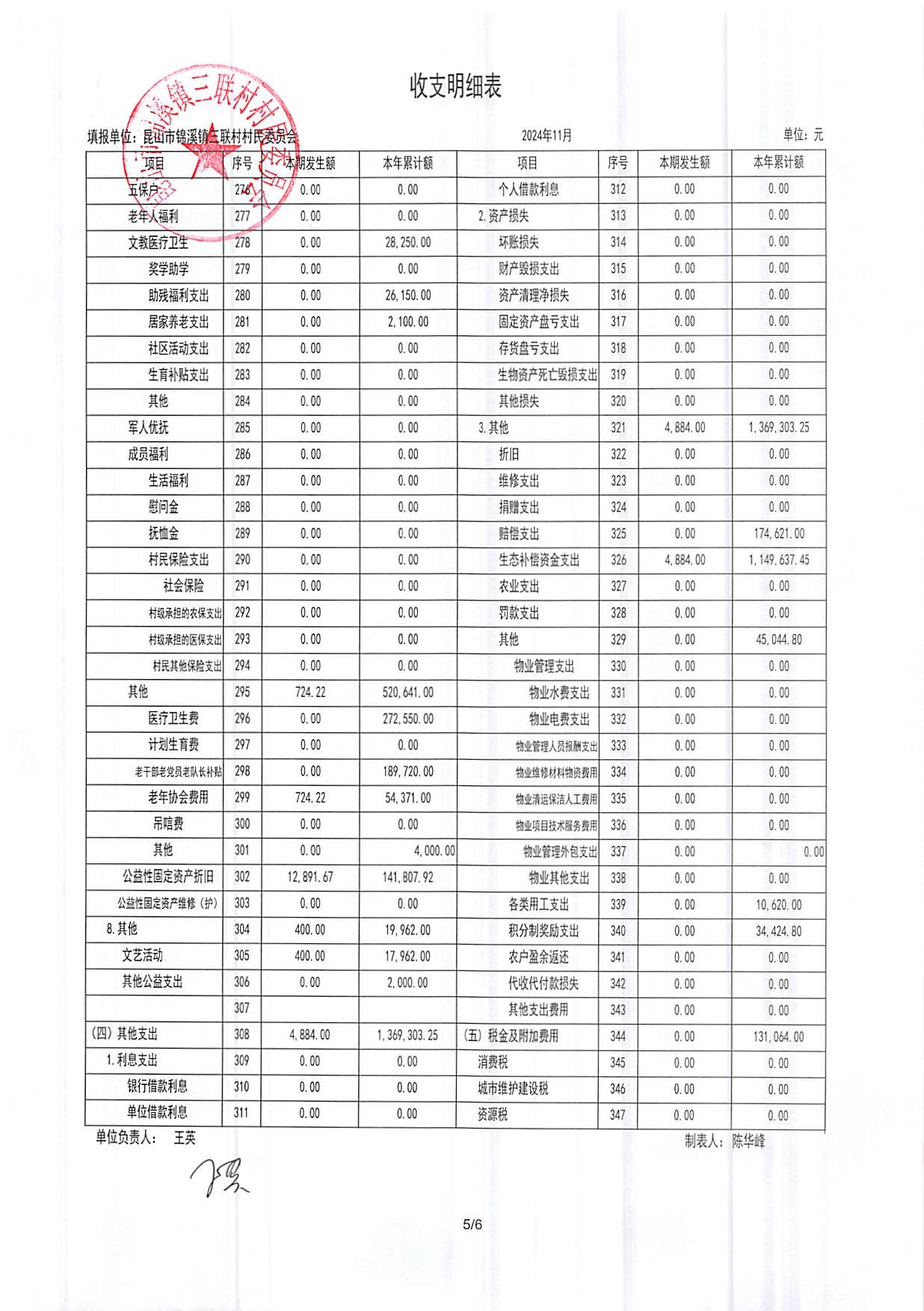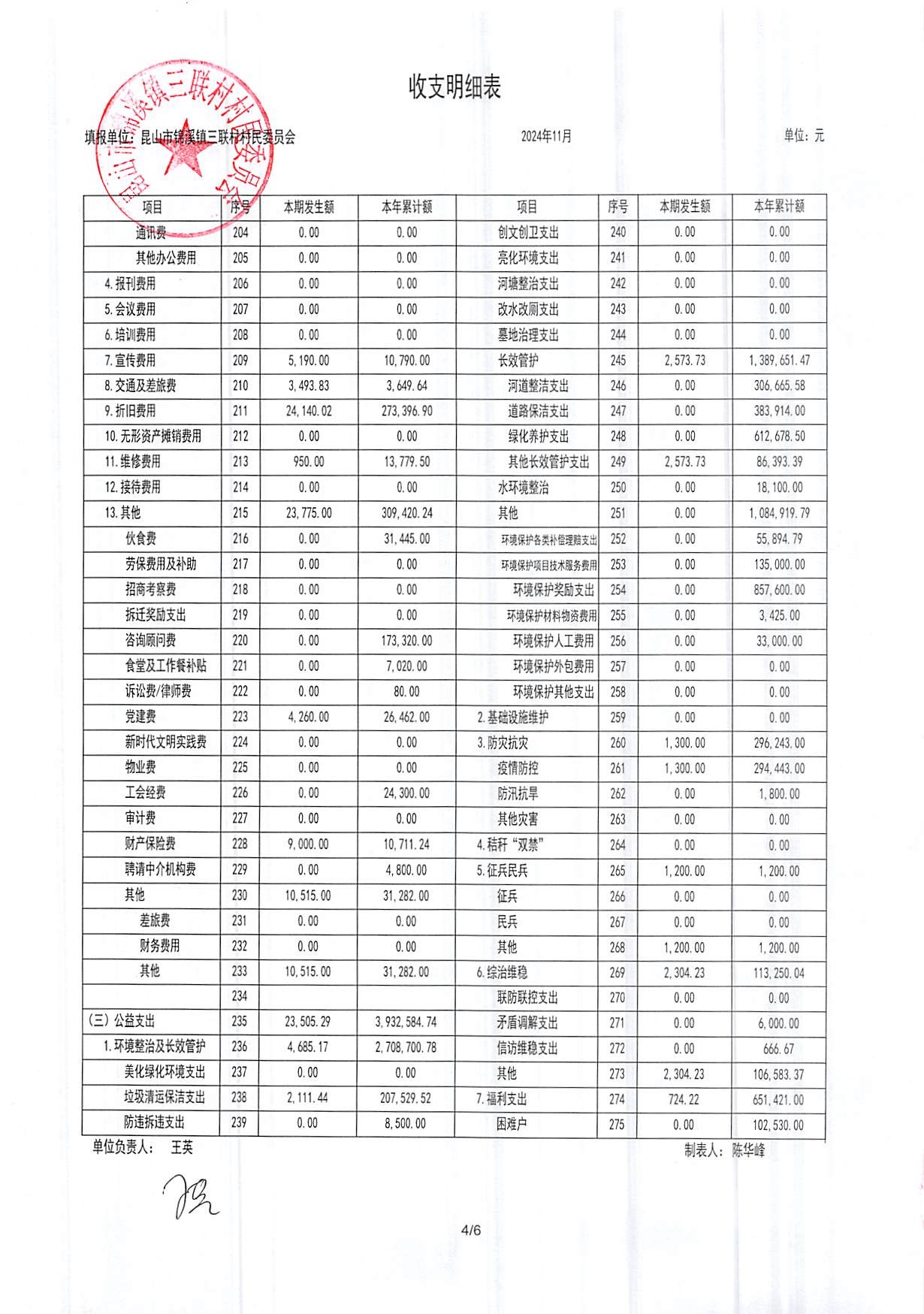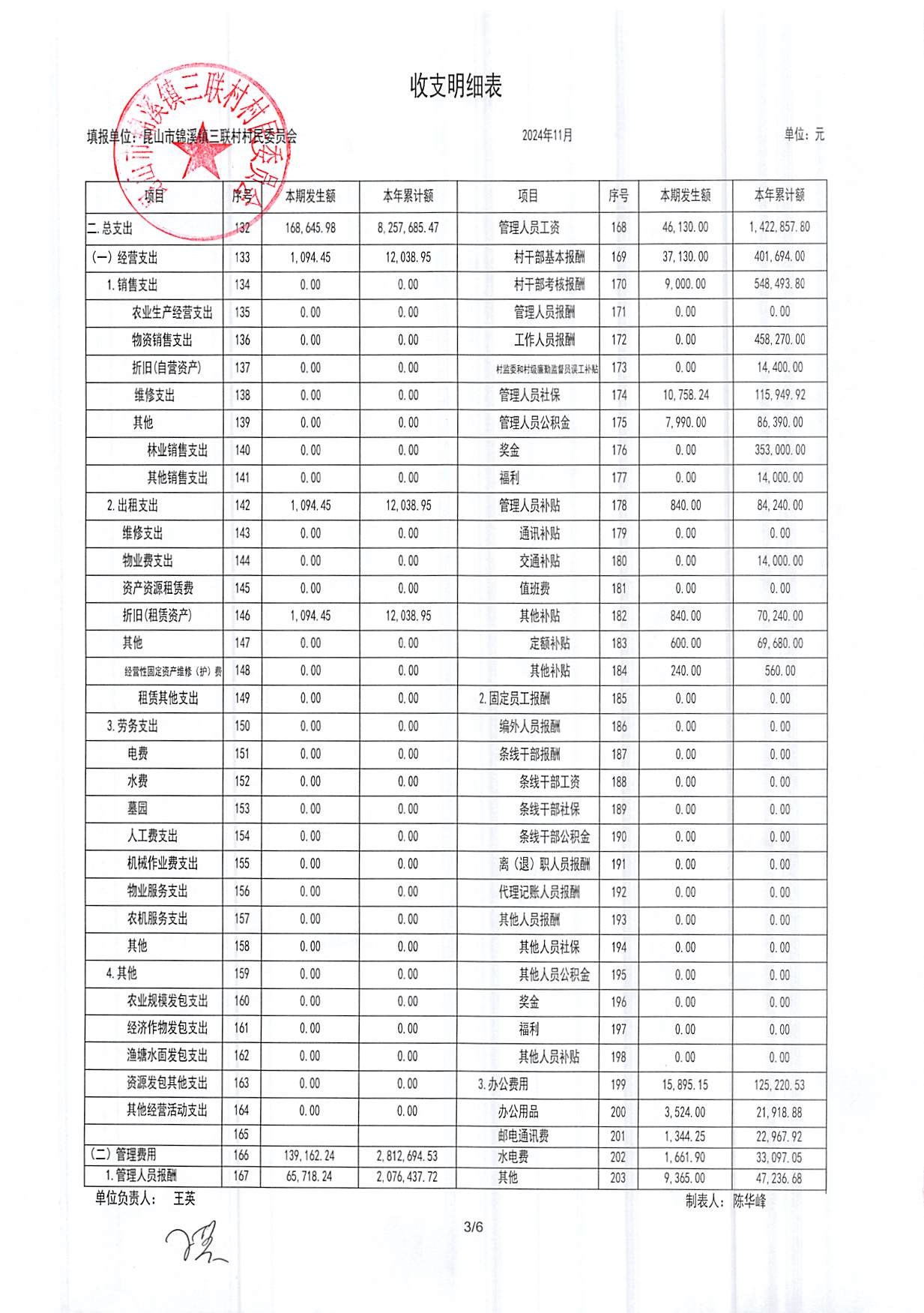 2024年三联村村委会11月份财务公开