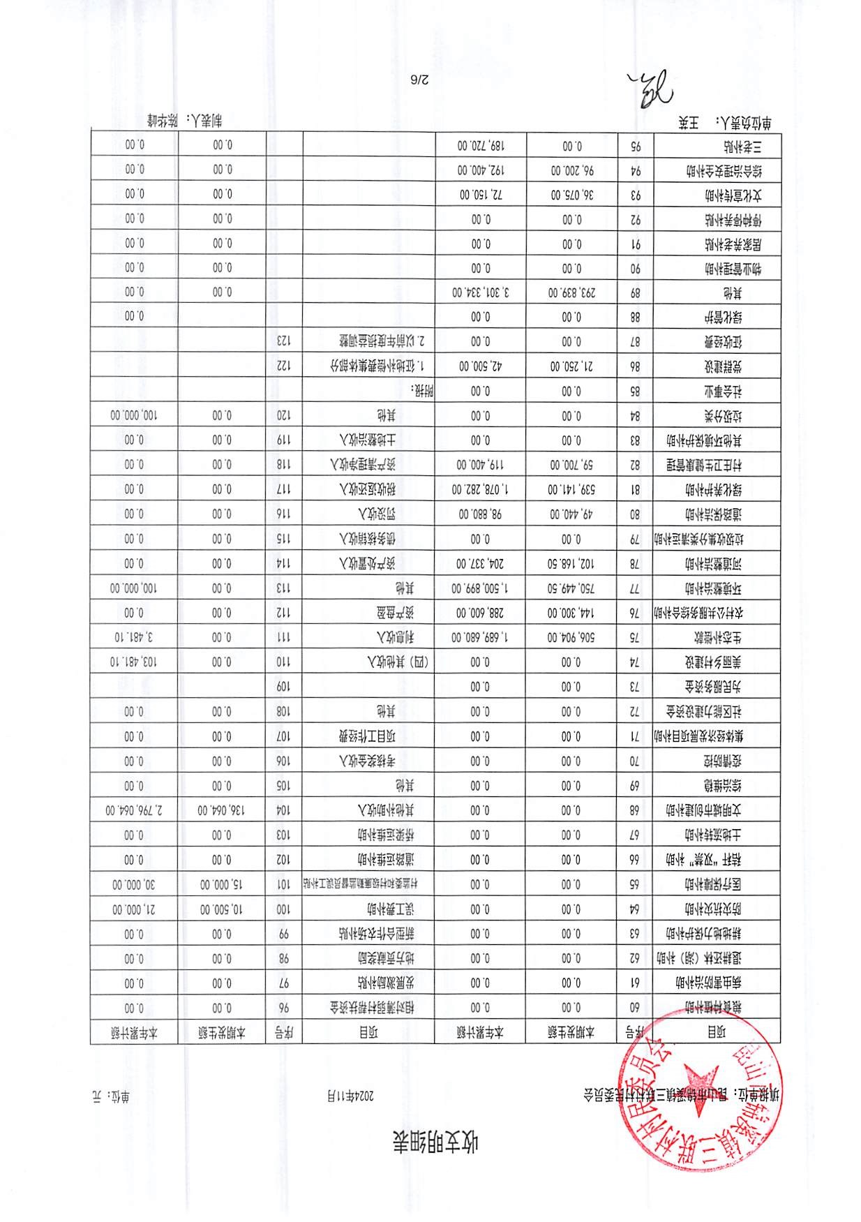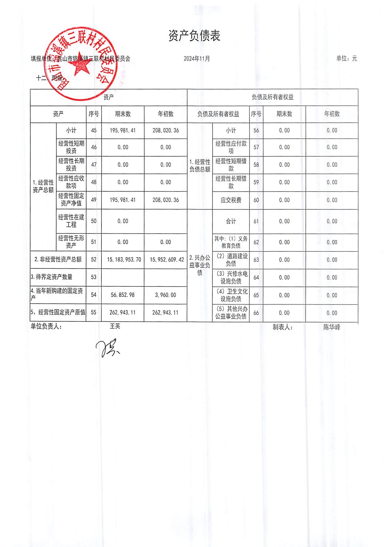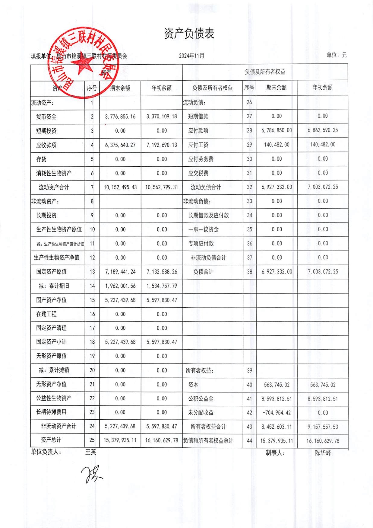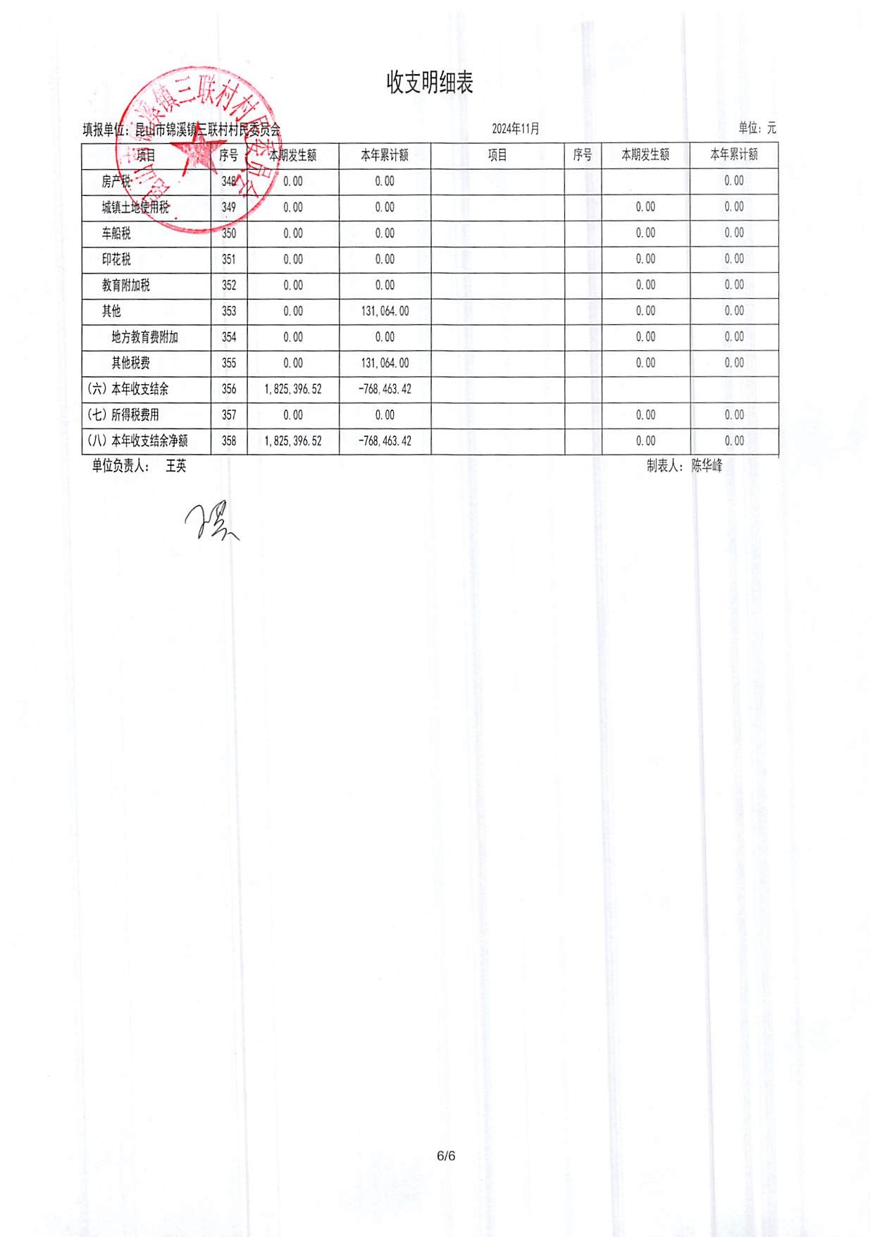 2024年三联村村委会11月份财务公开