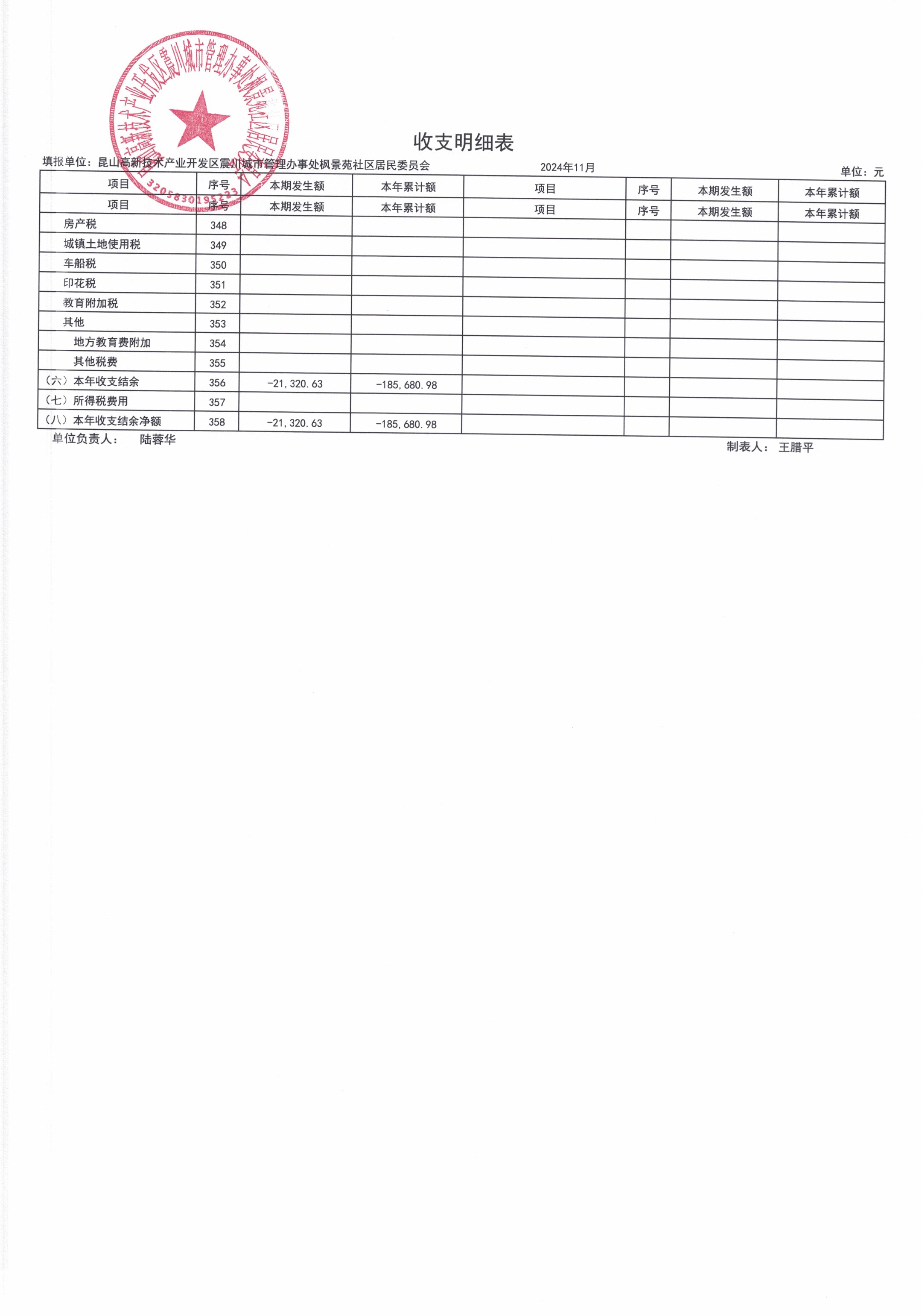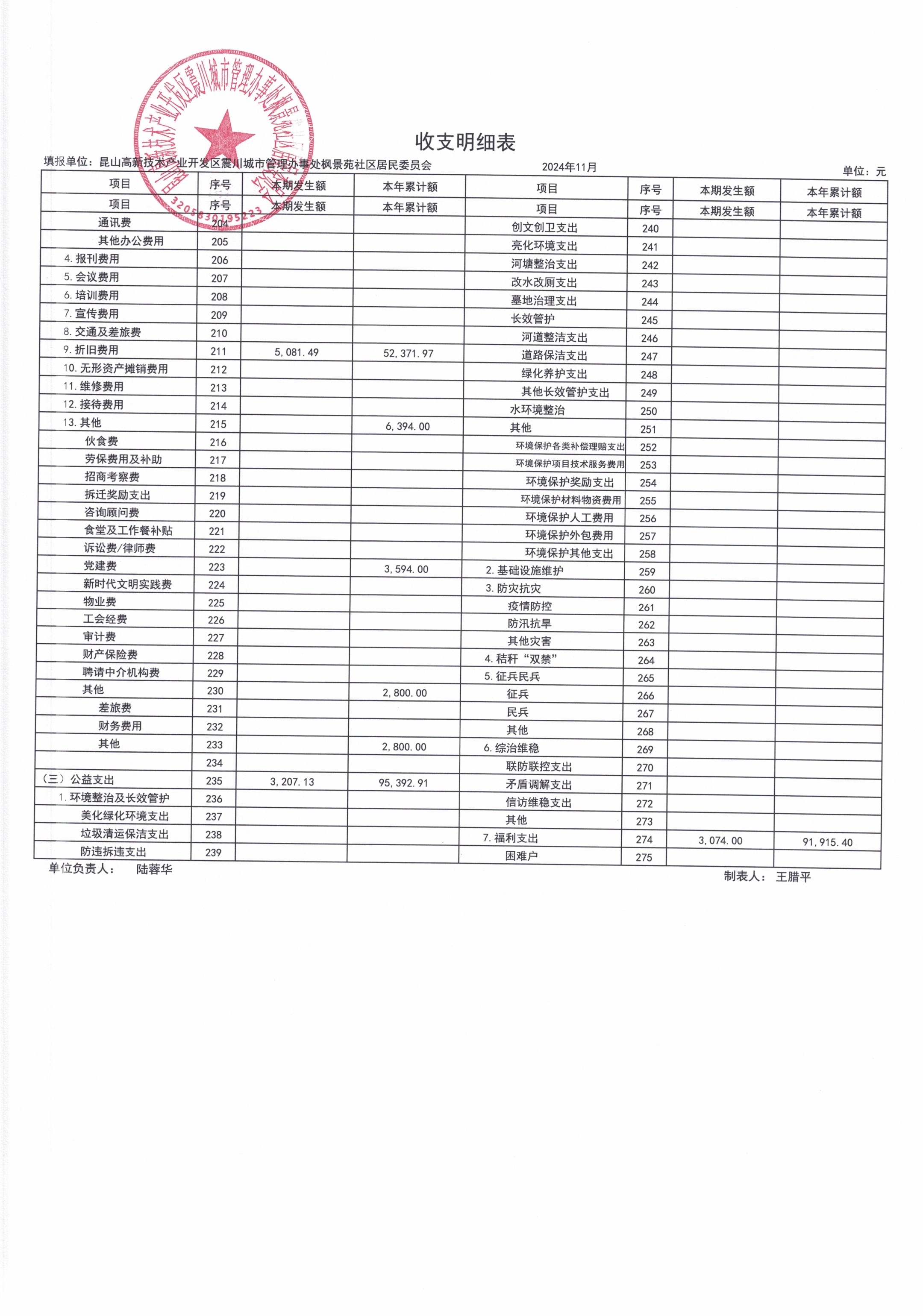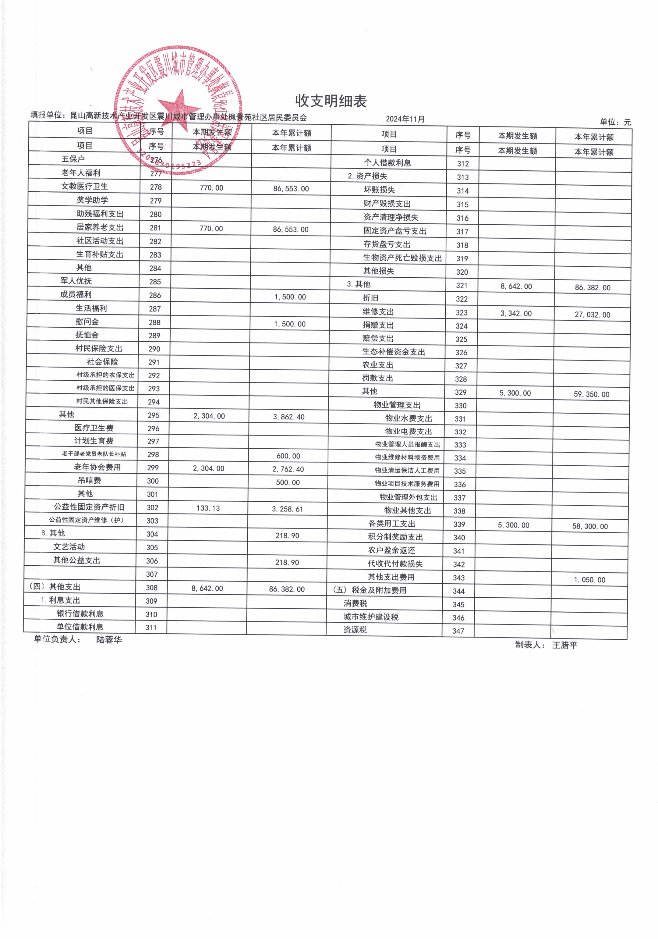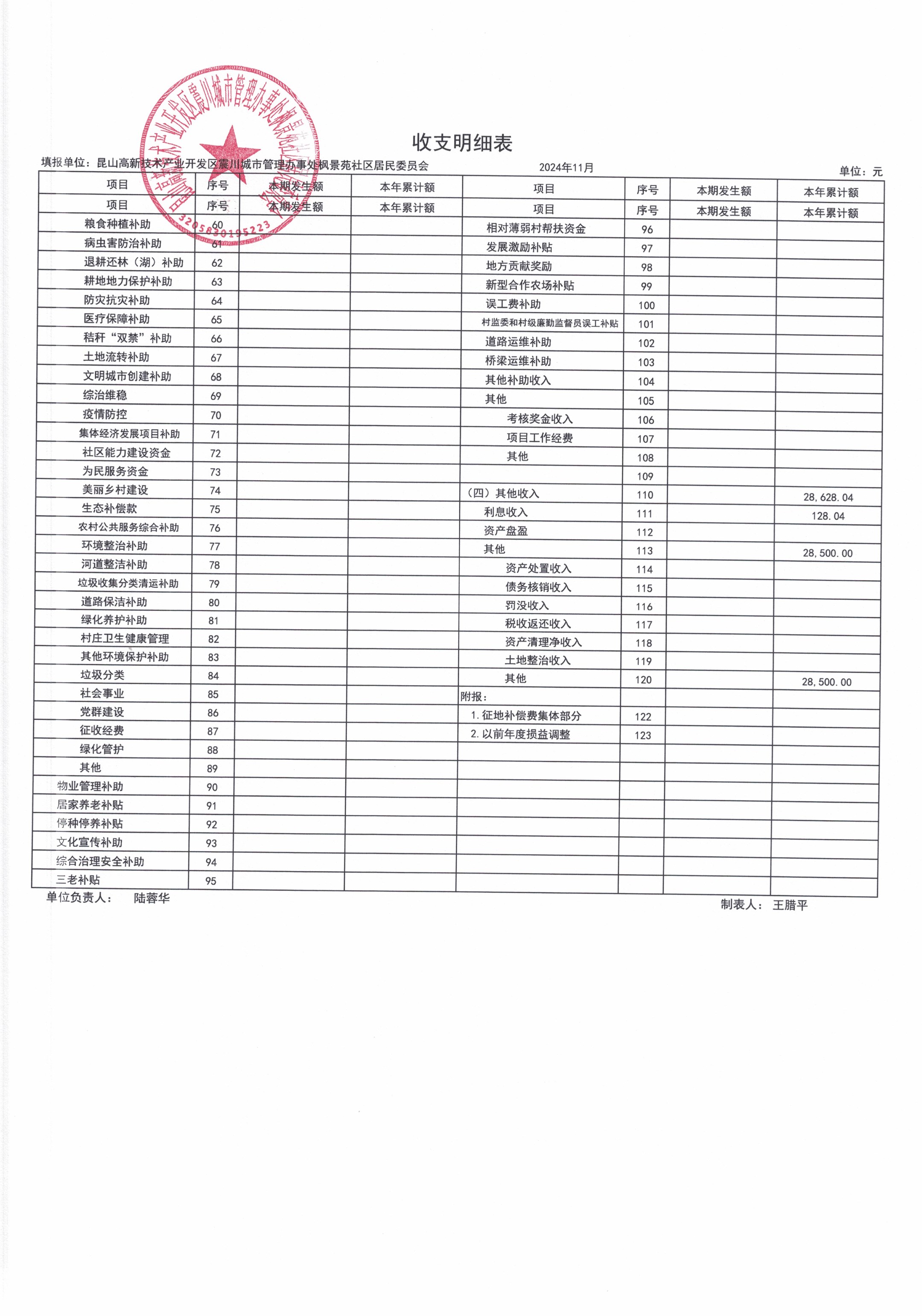 2024年11月枫景苑社区居委会财务公开