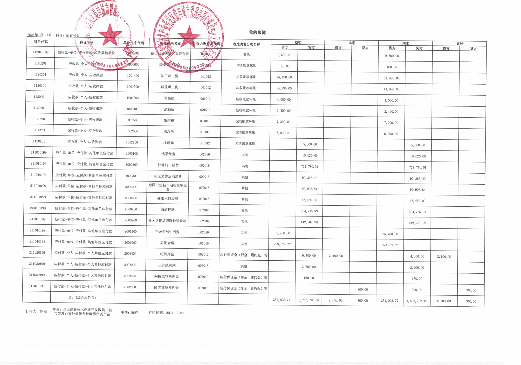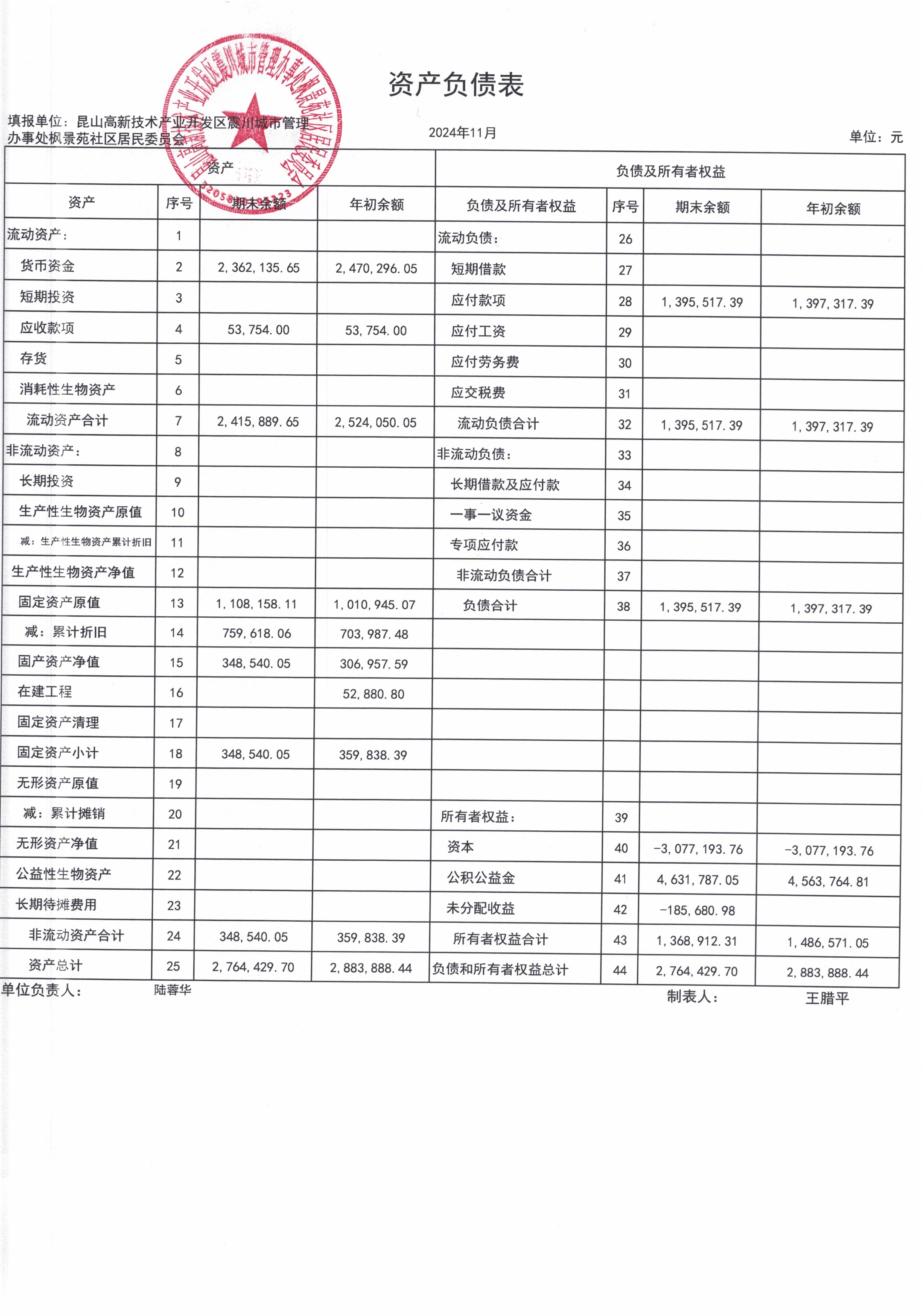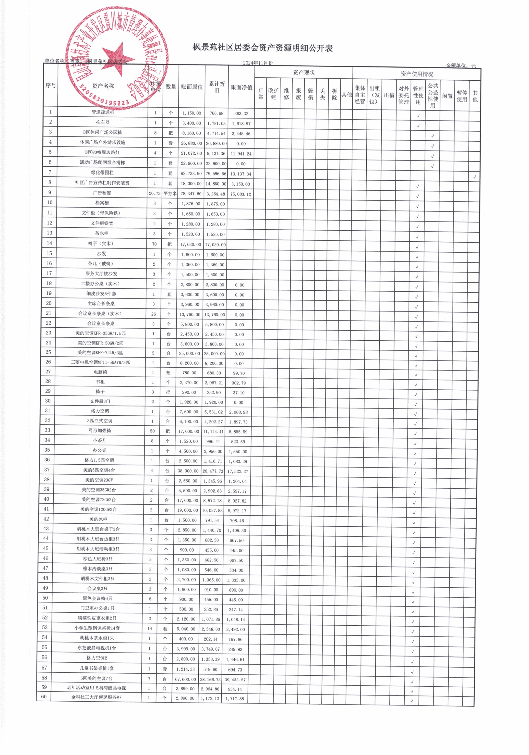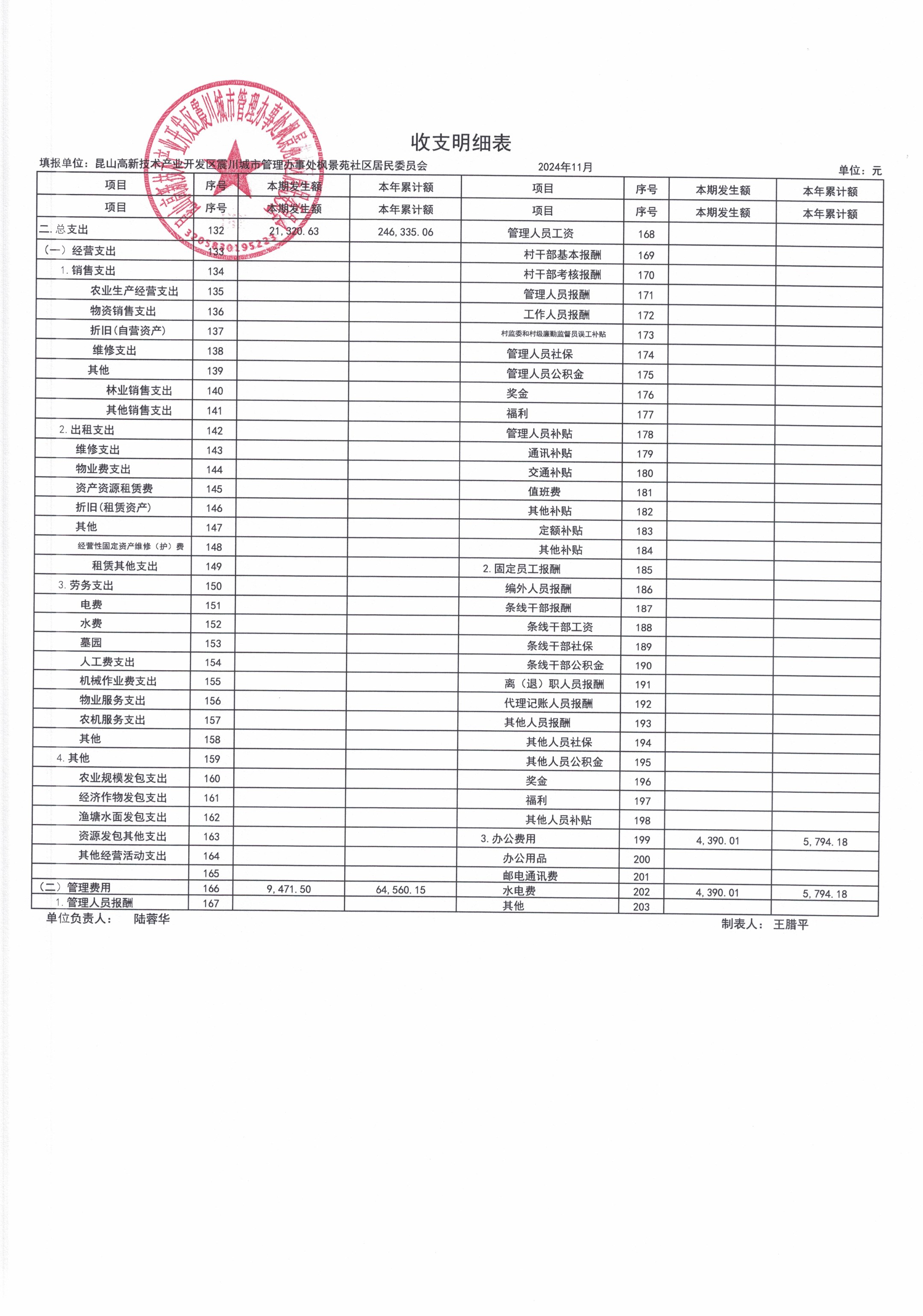 2024年11月枫景苑社区居委会财务公开