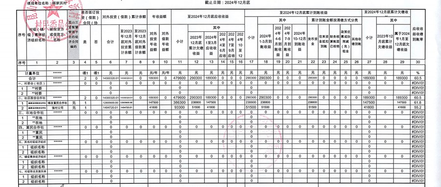 (截止日期2024年12月31日)农村集体资产、资源租赁发包经济合同执行进度明细表、投资收益清缴进度明细表