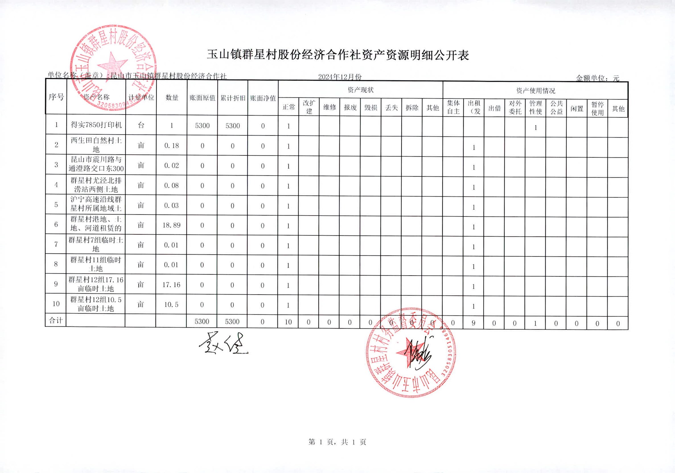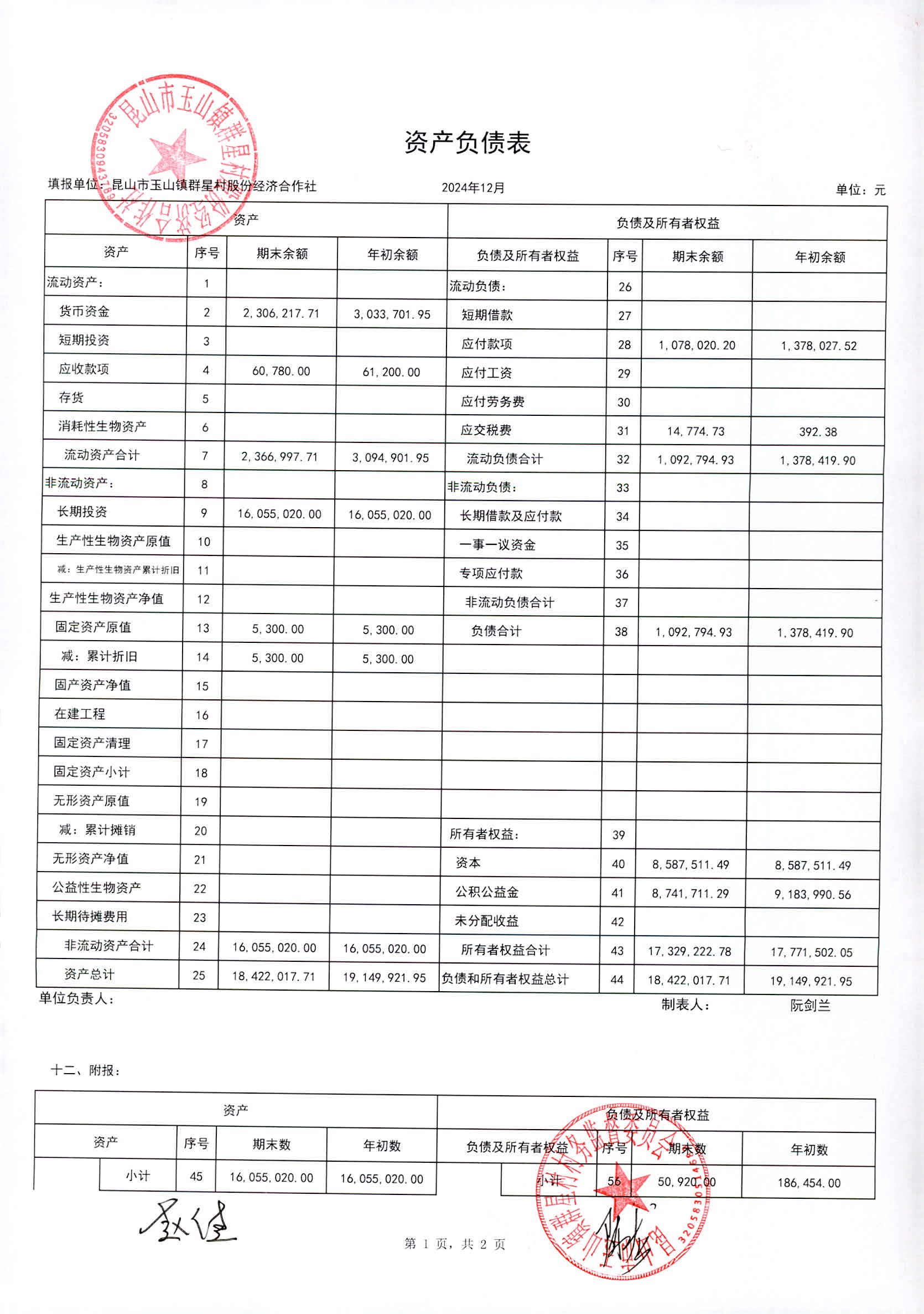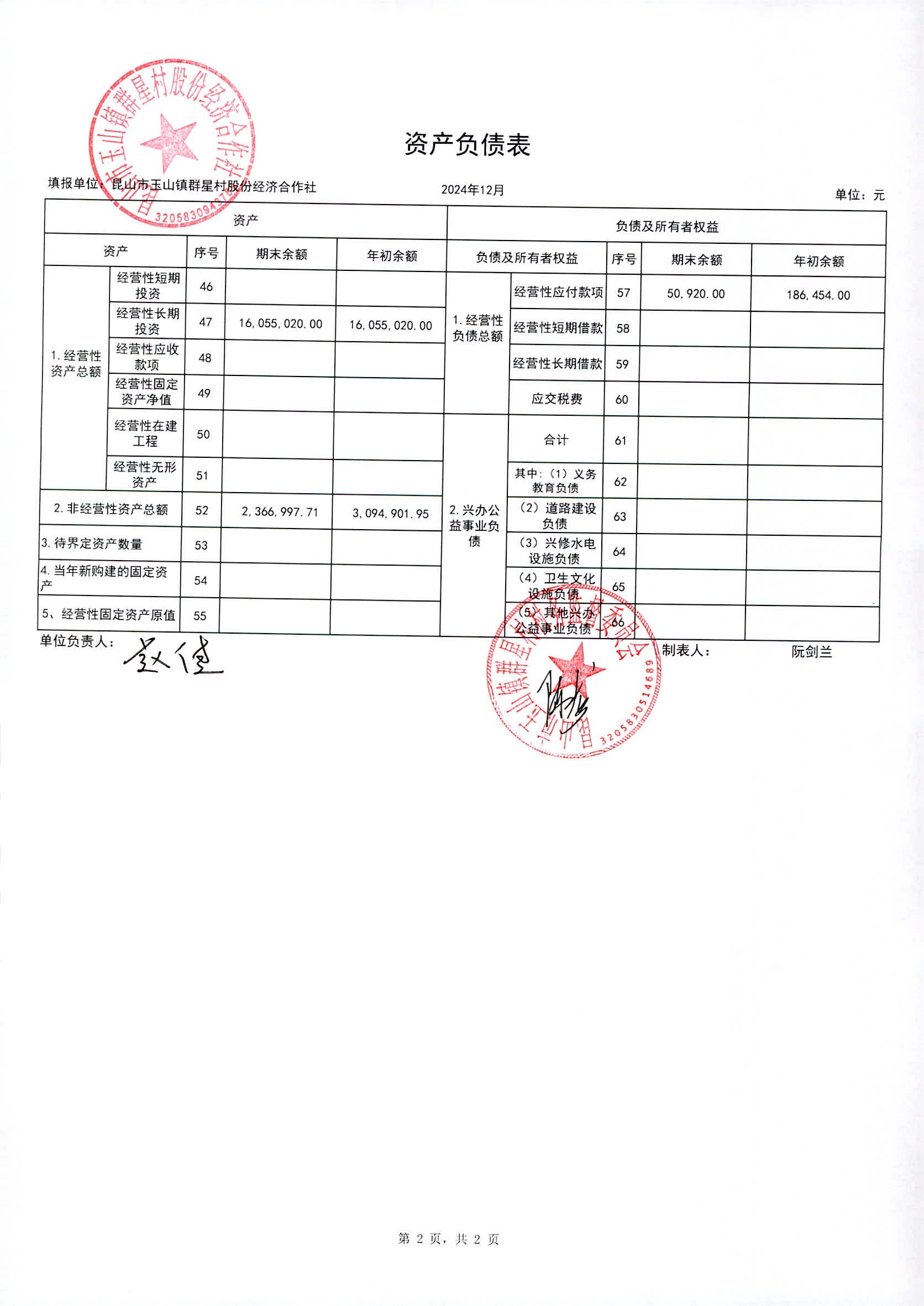 昆山高新区群星村2025年01月份公开股份经济合作社2024年12月财务信息