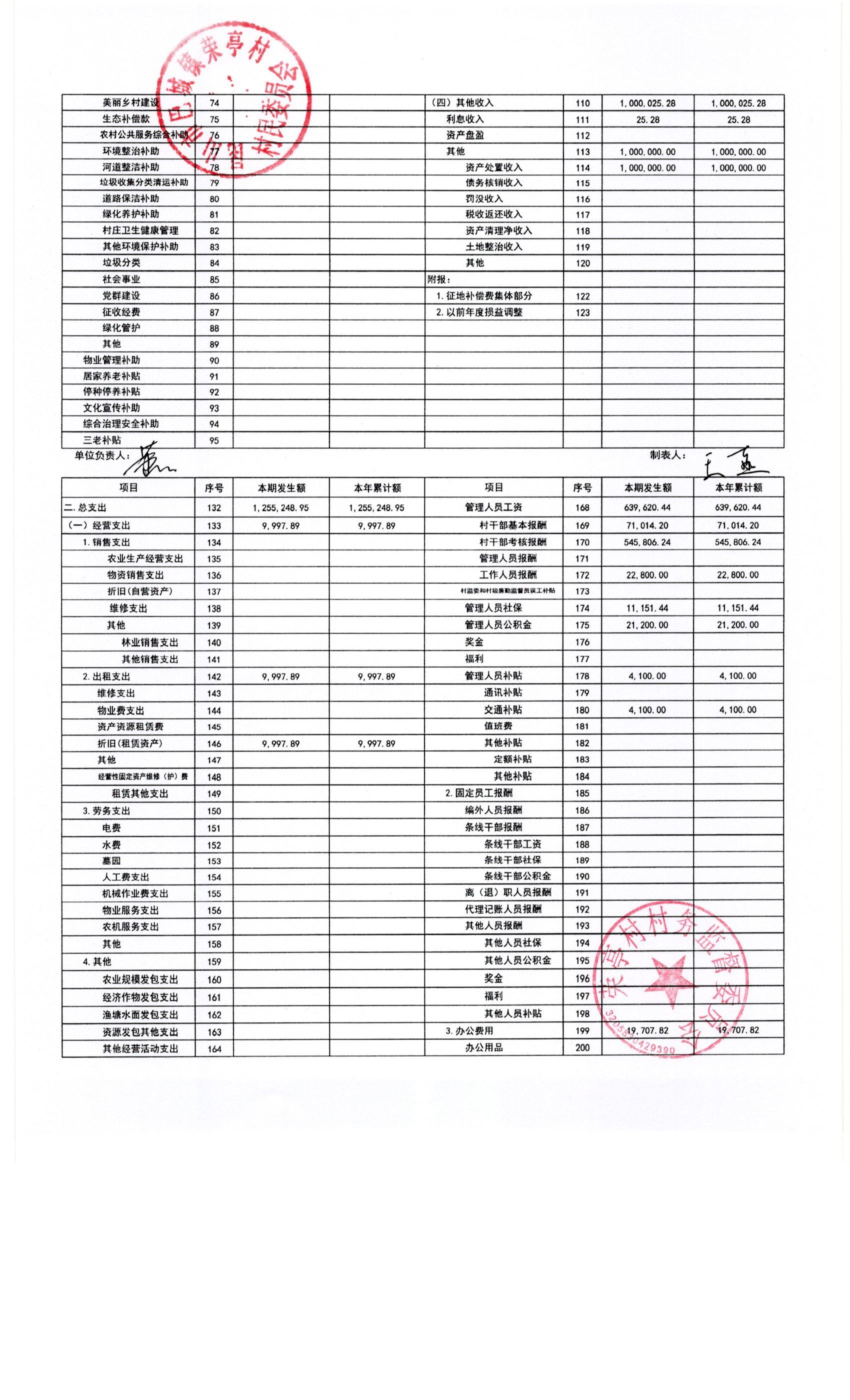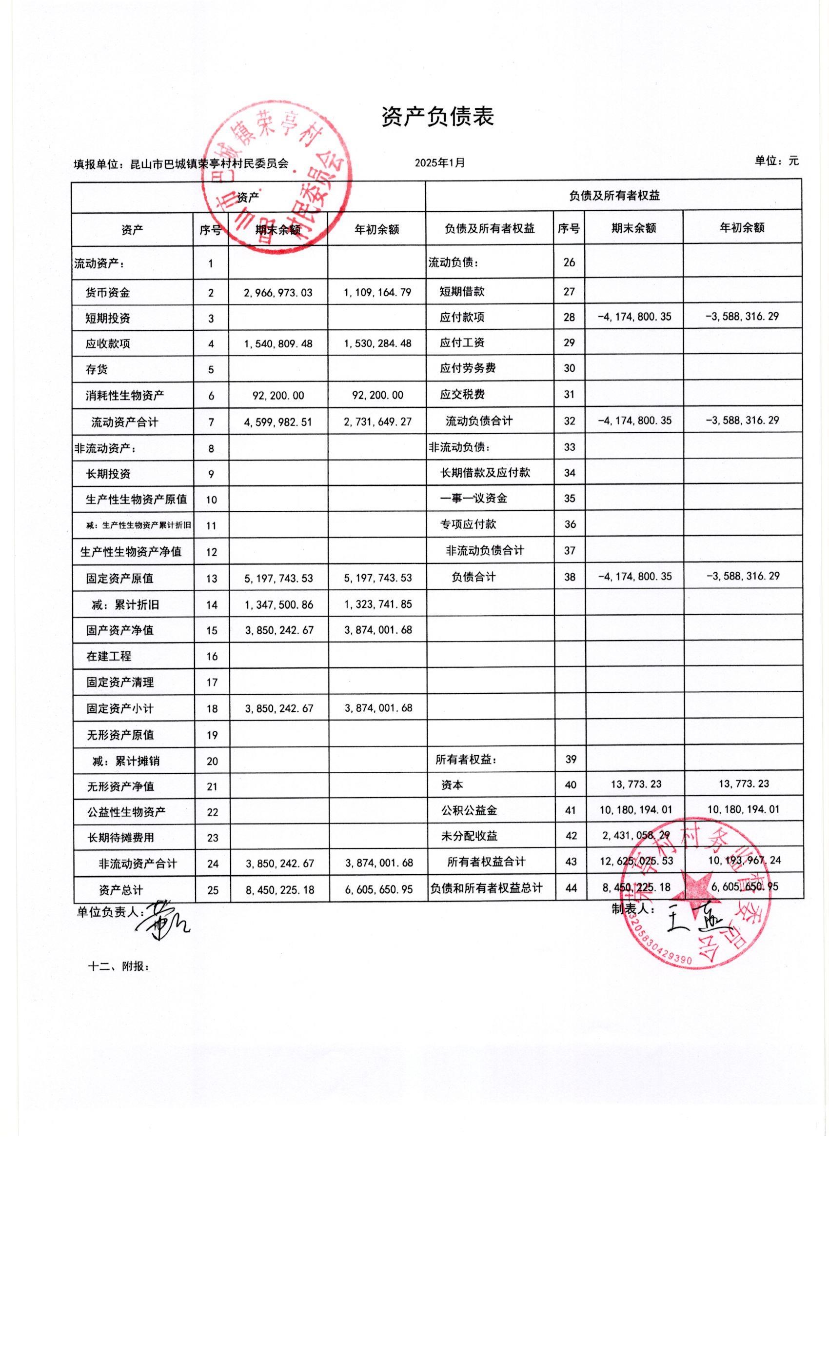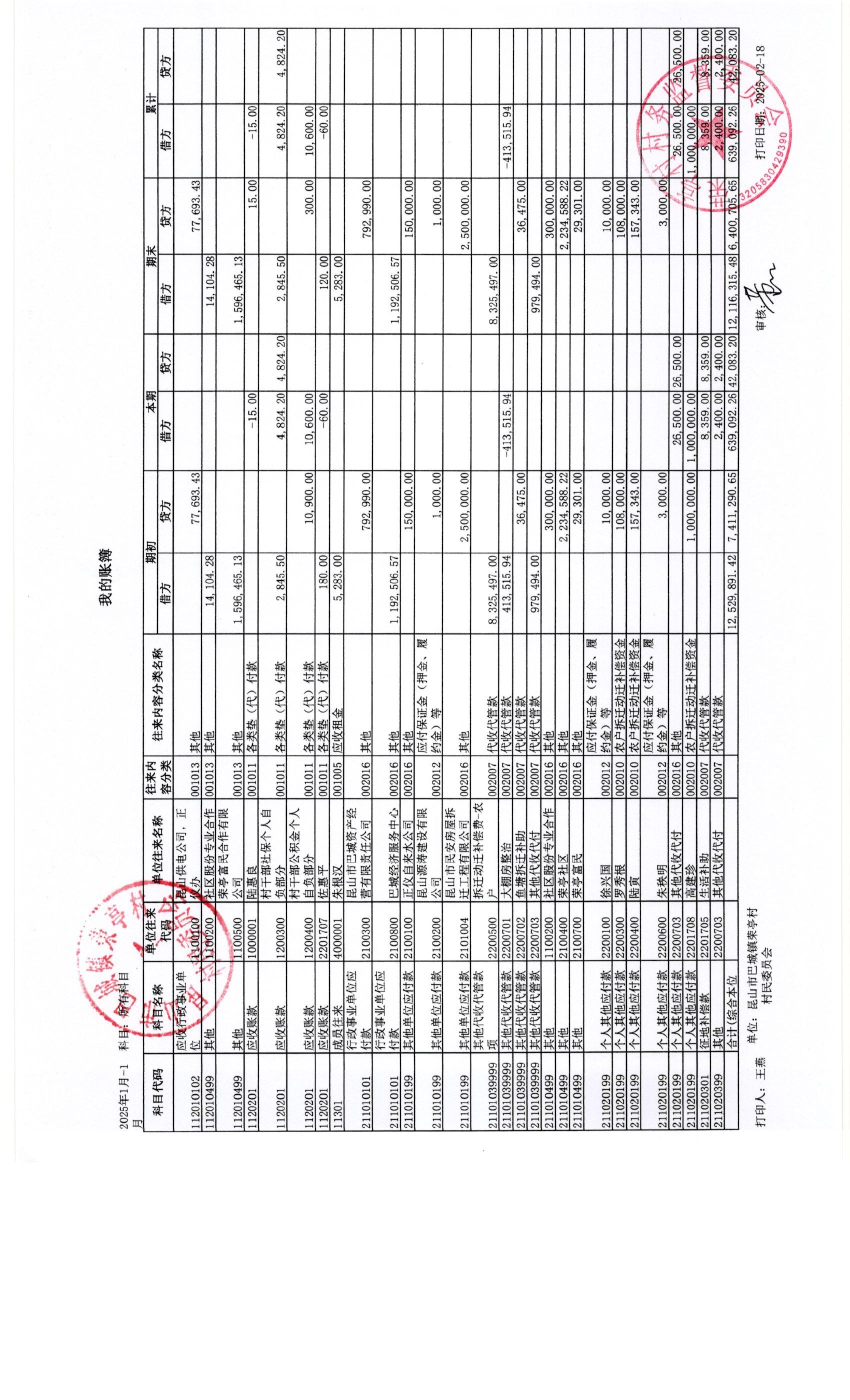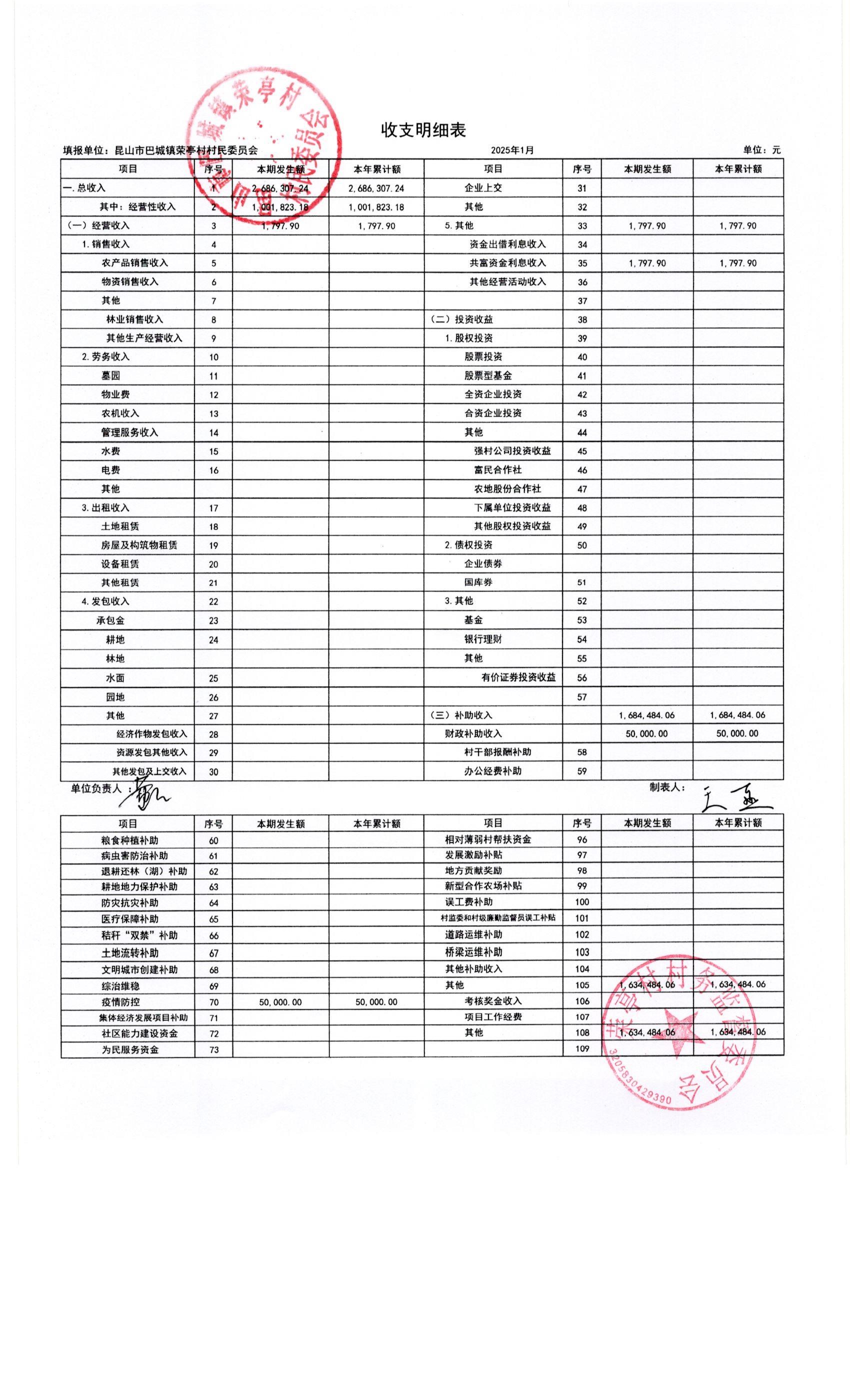 荣亭村2025年1月份财务公开