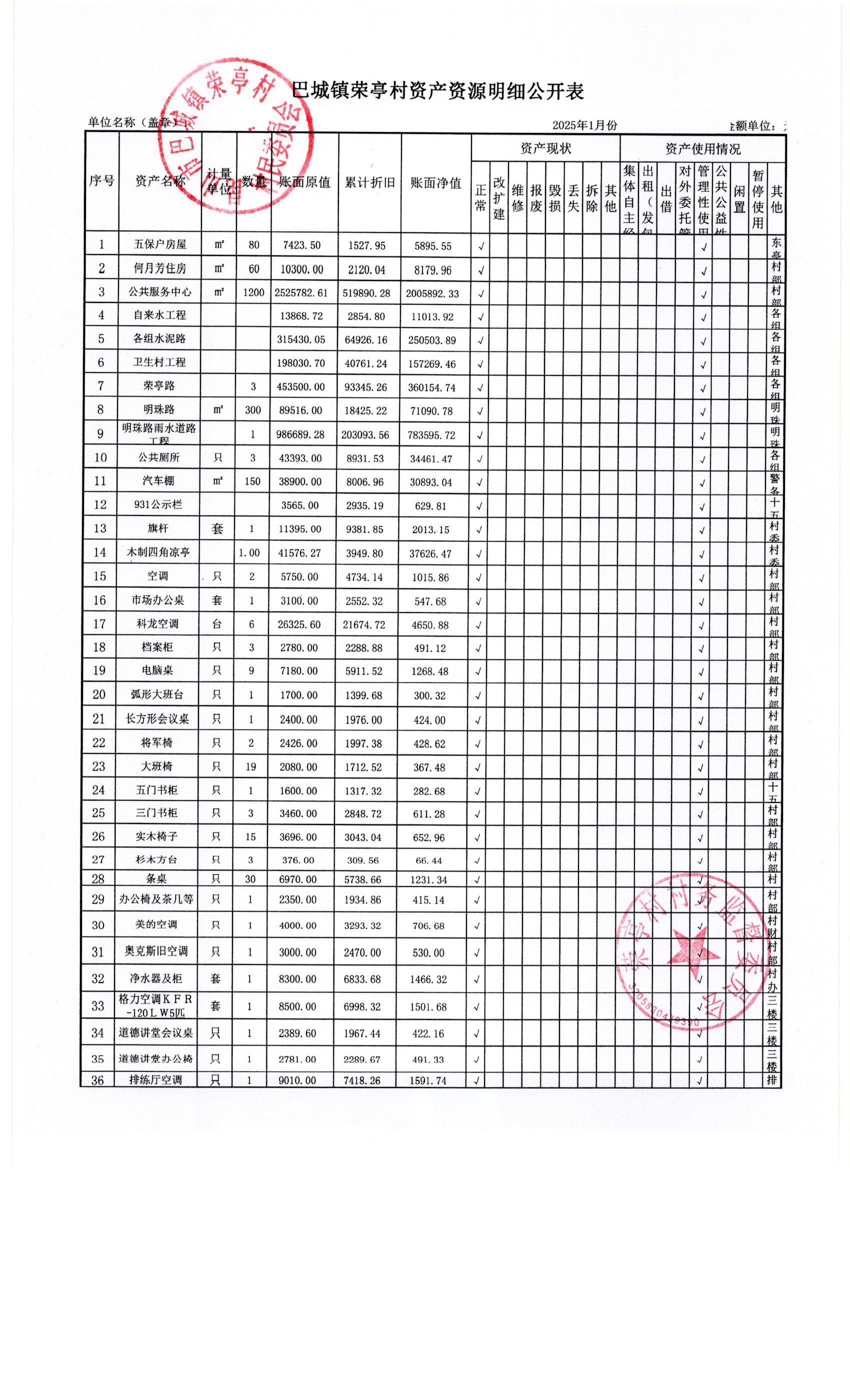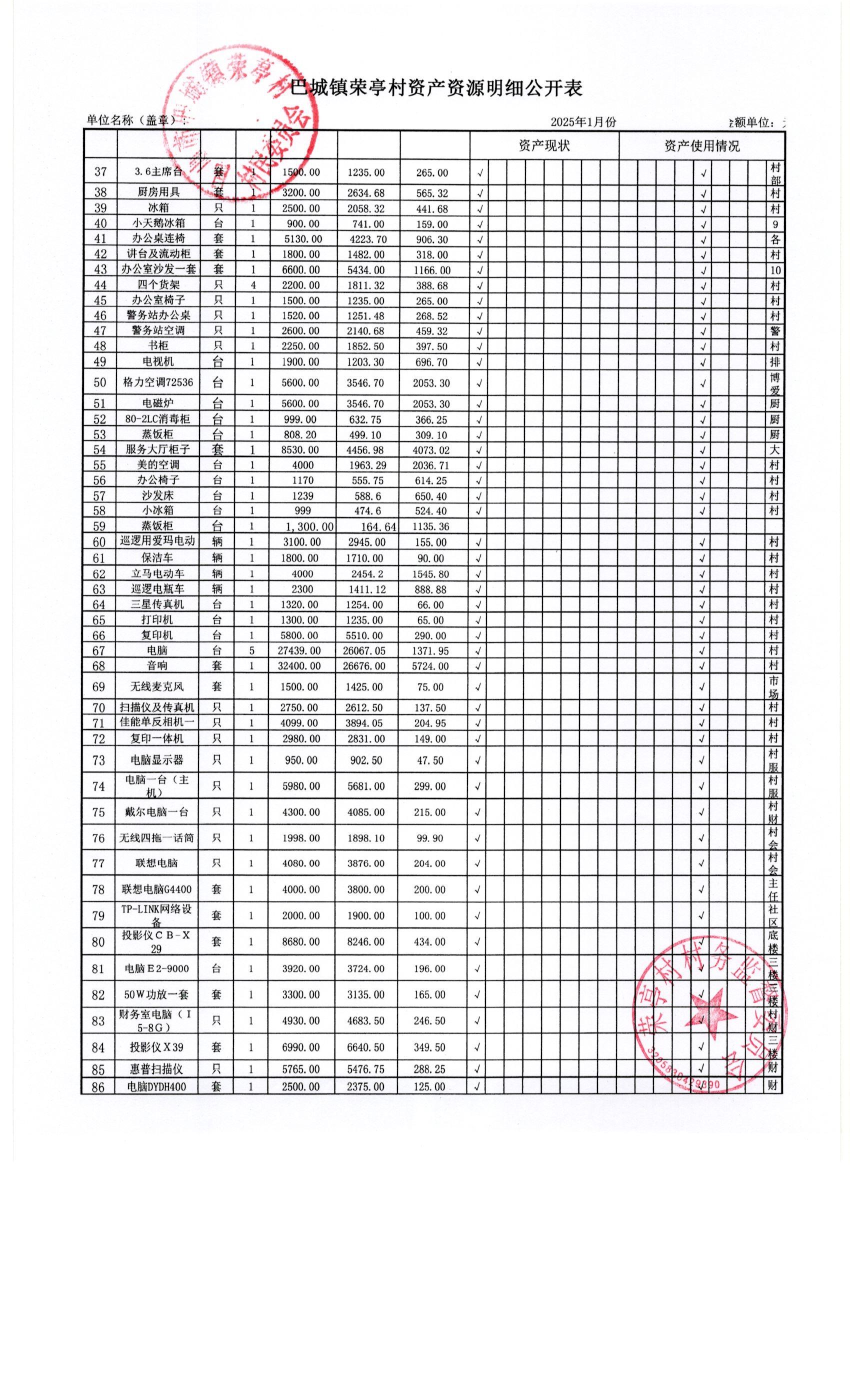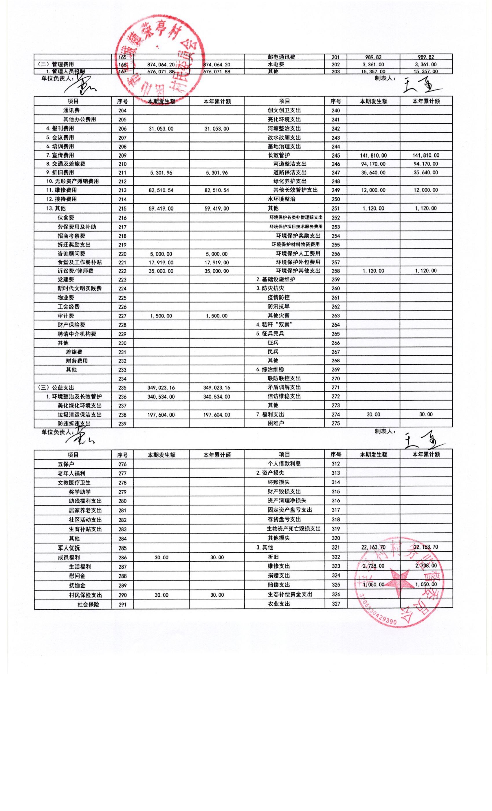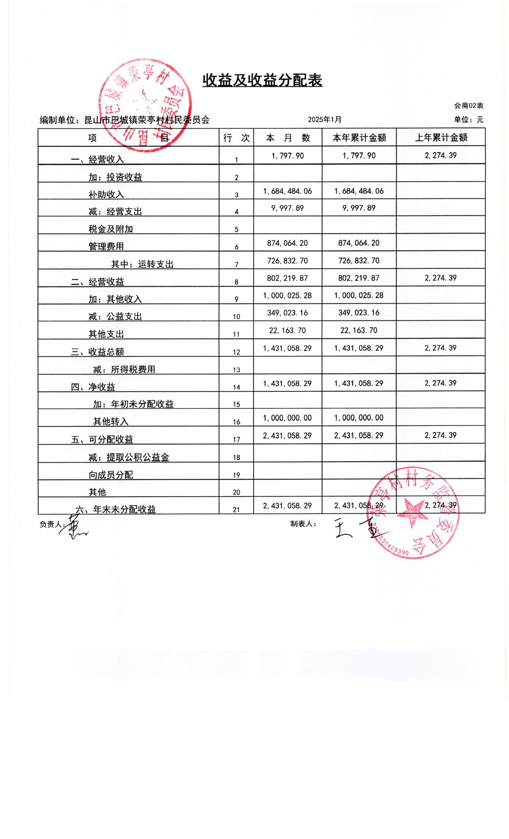 荣亭村2025年1月份财务公开