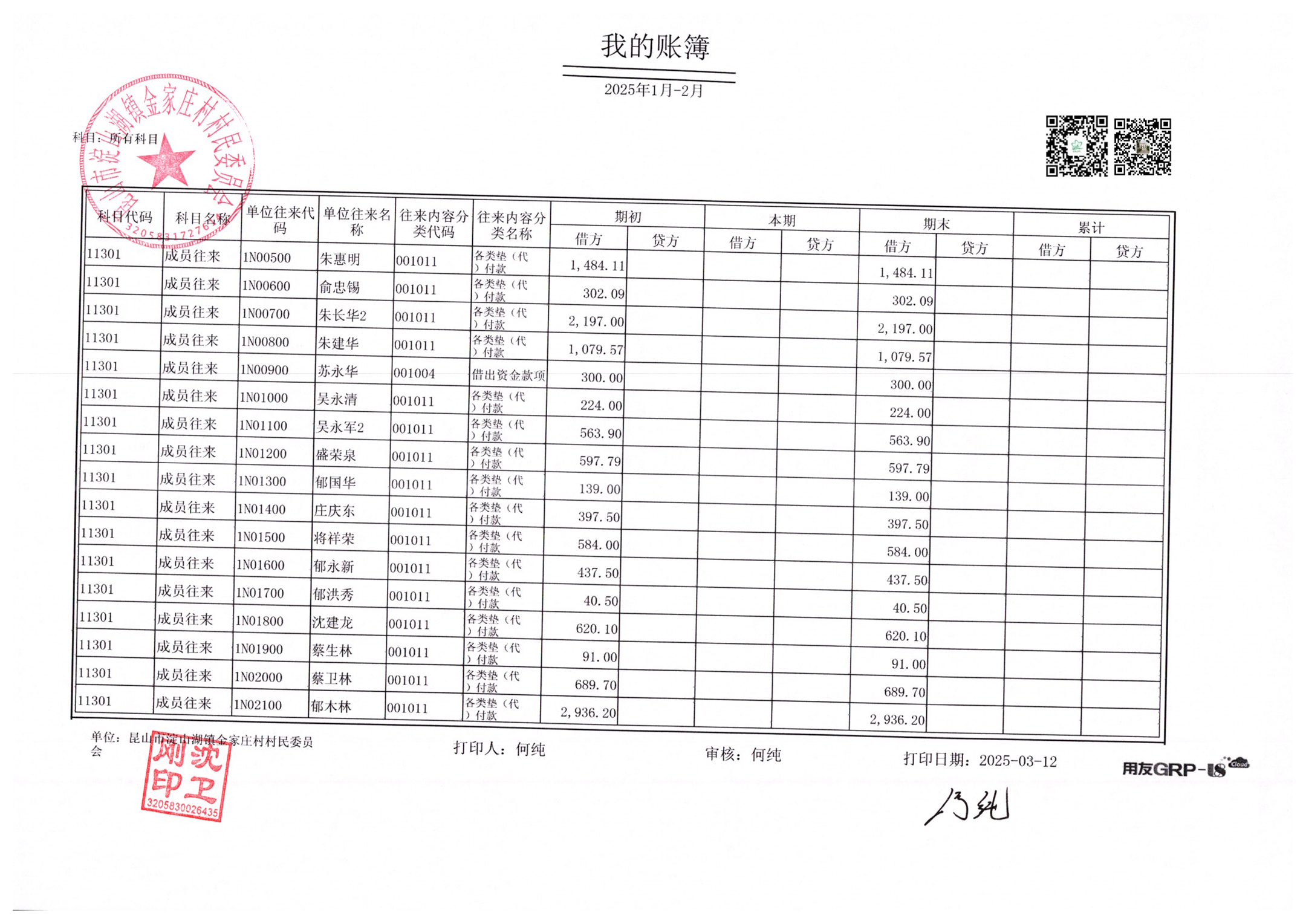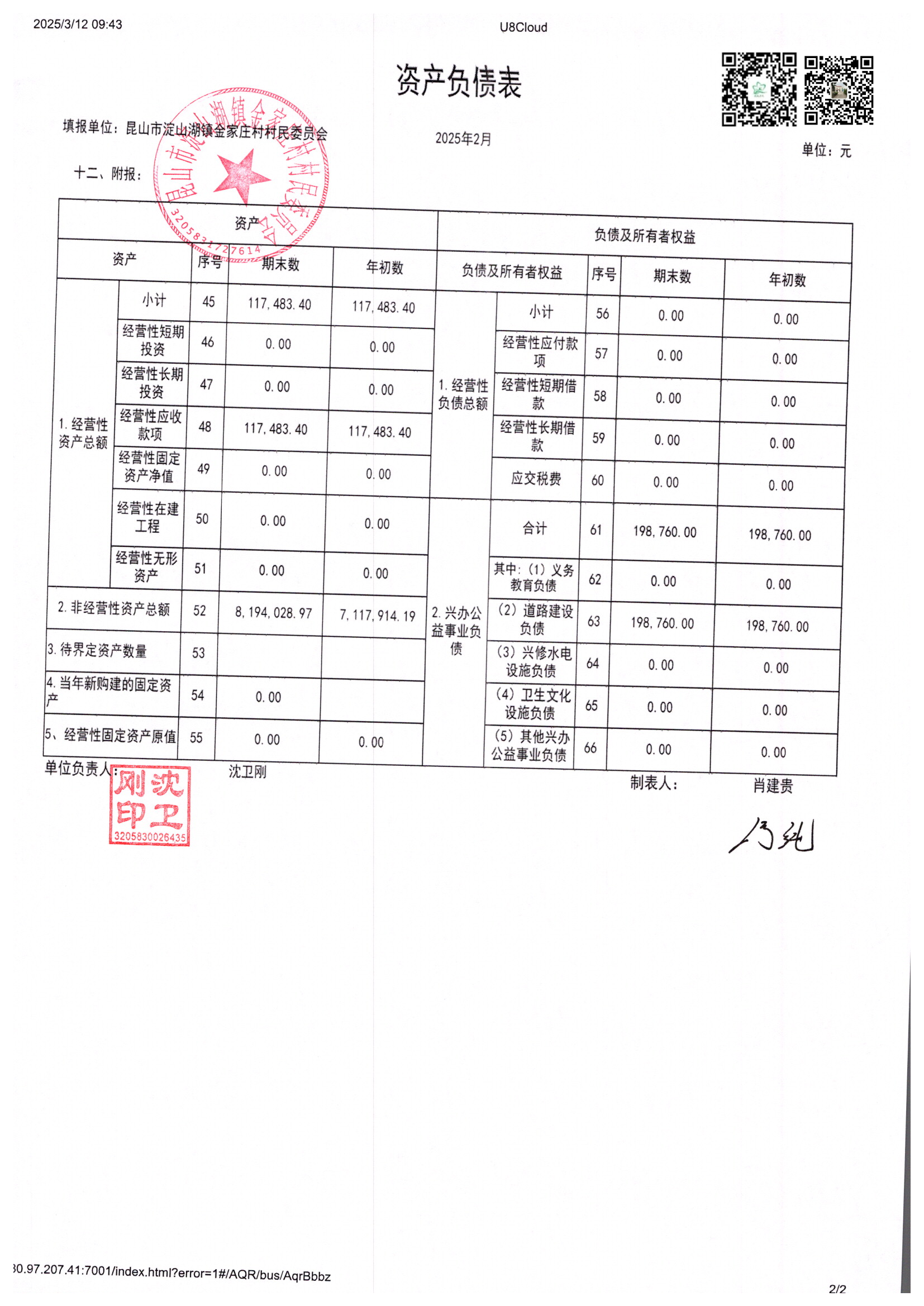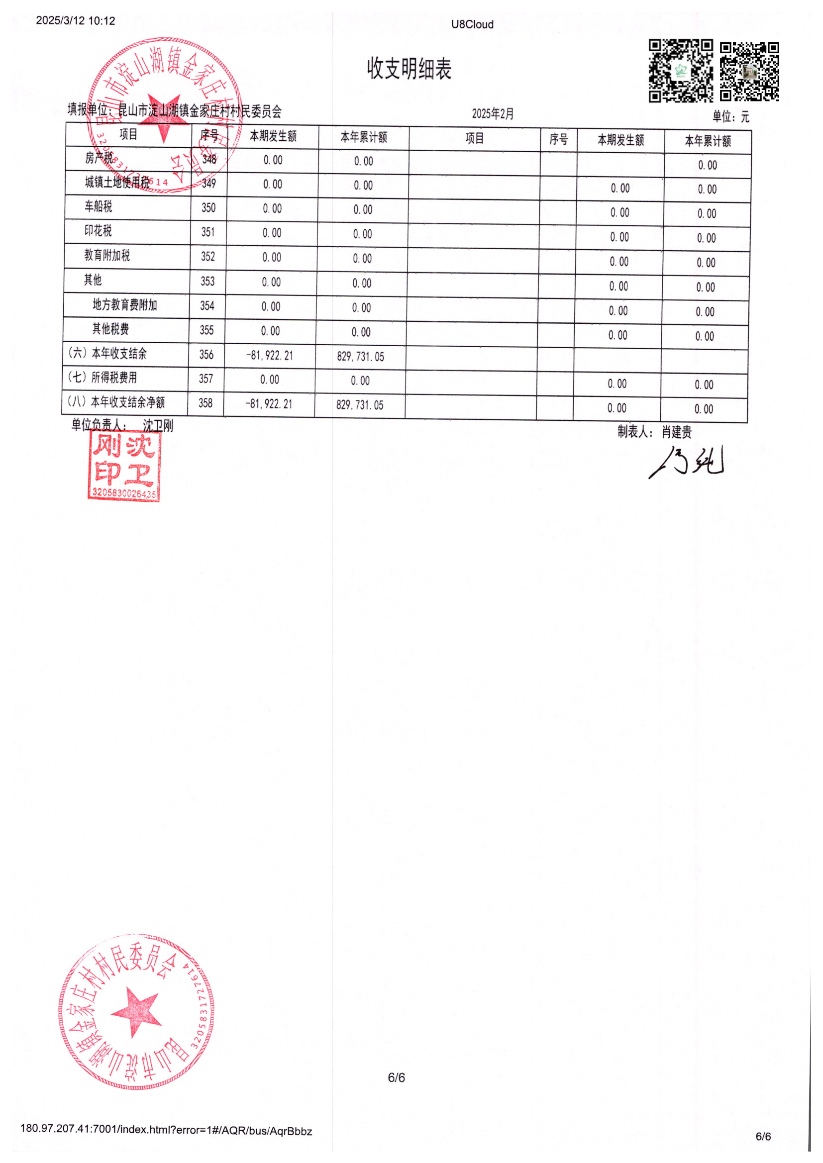 金家庄村村民委员会2025年2月财务公开