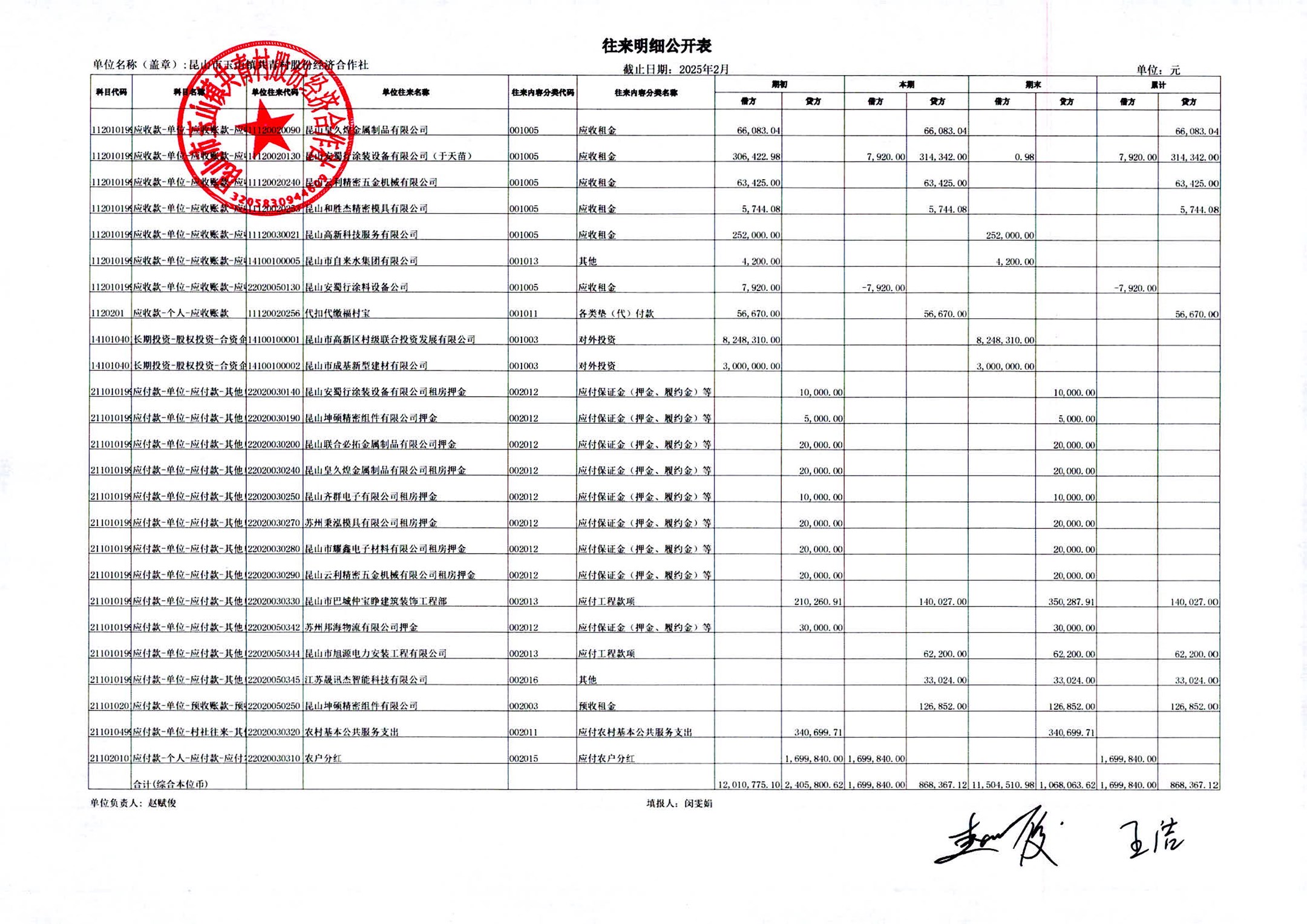 2025年2月共青村股份经济合作往来明细公开表
