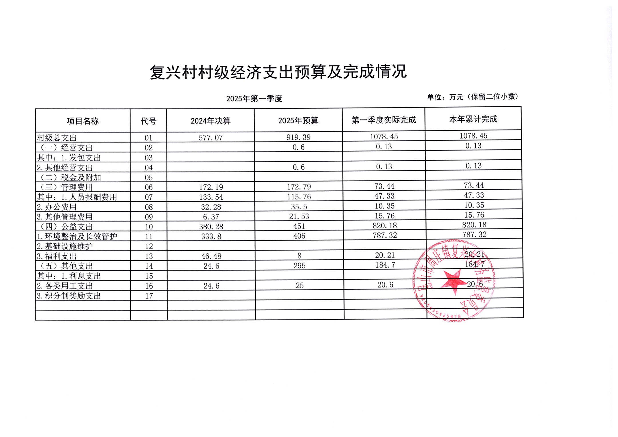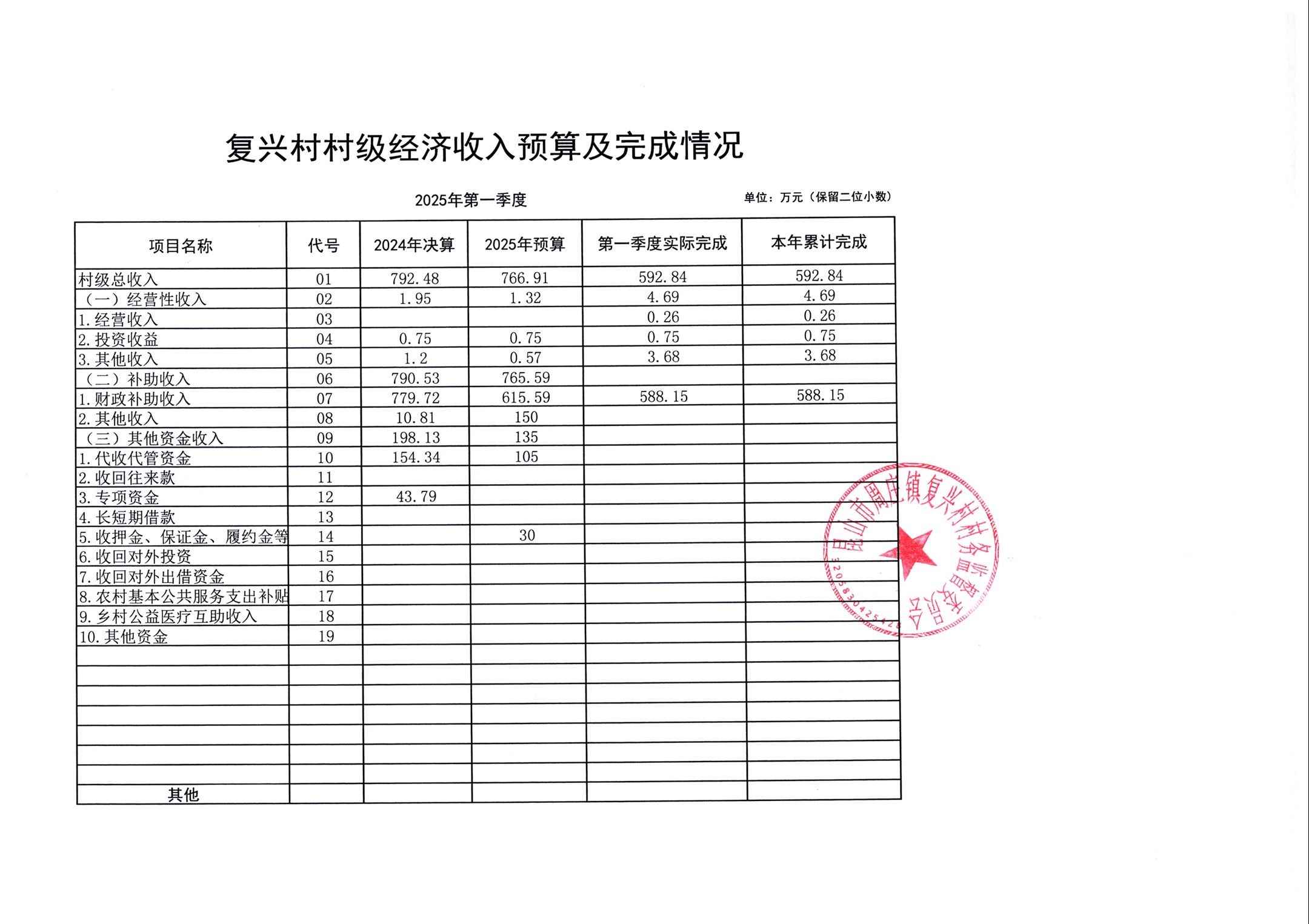 复兴村经济收入支出预算及完成情况(2025年一季度)