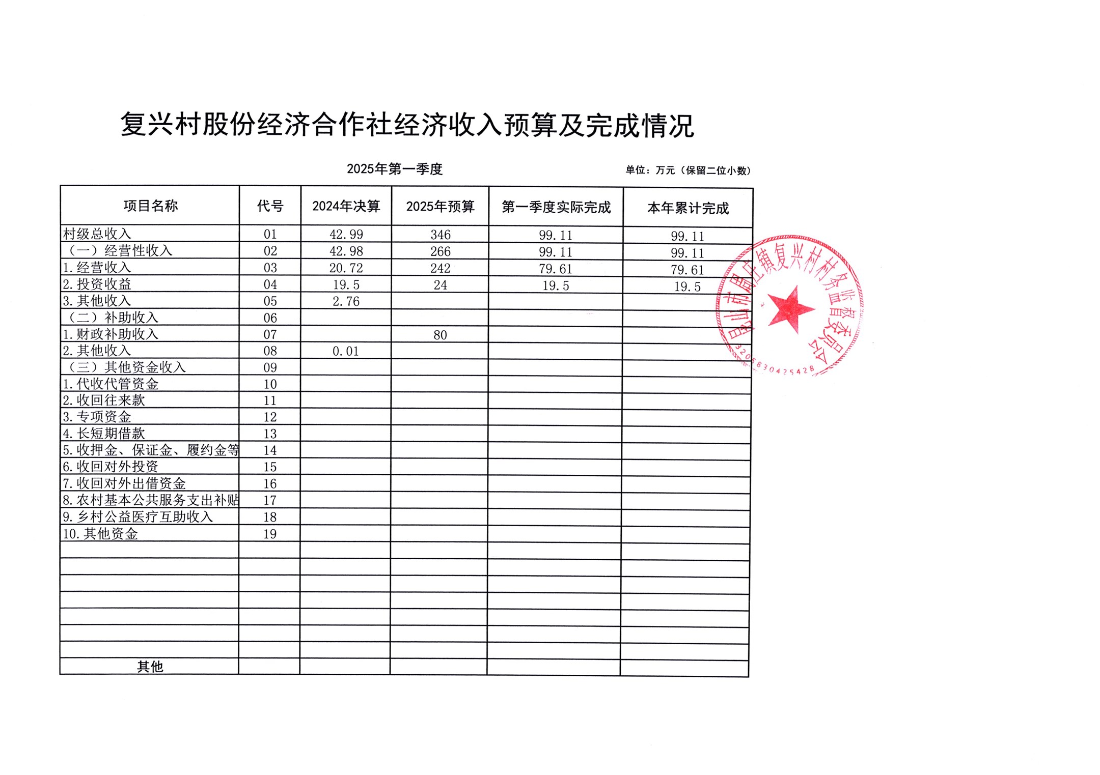 复兴村股份经济合作社经济收入支出预算及完成情况(2025年一季度)