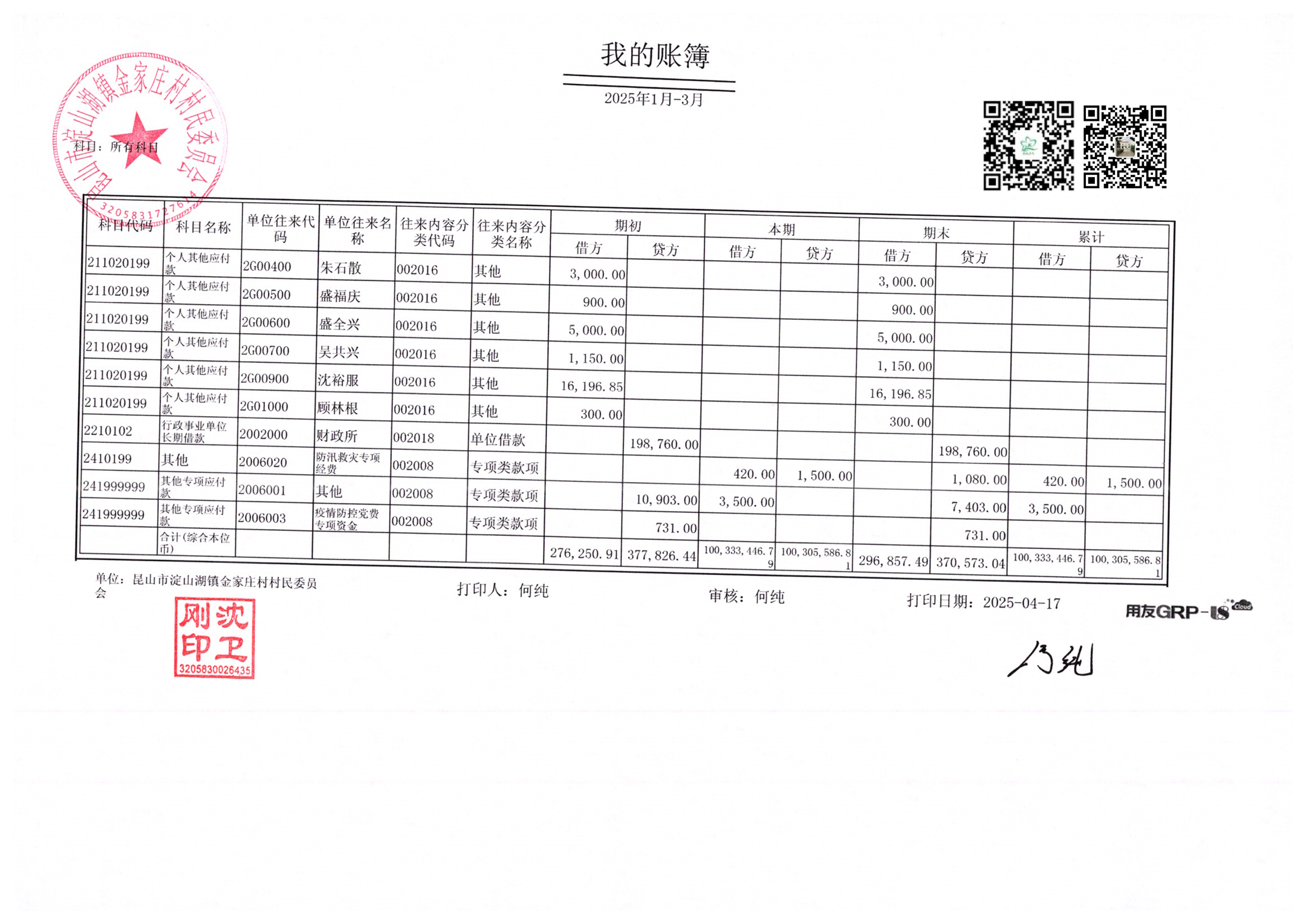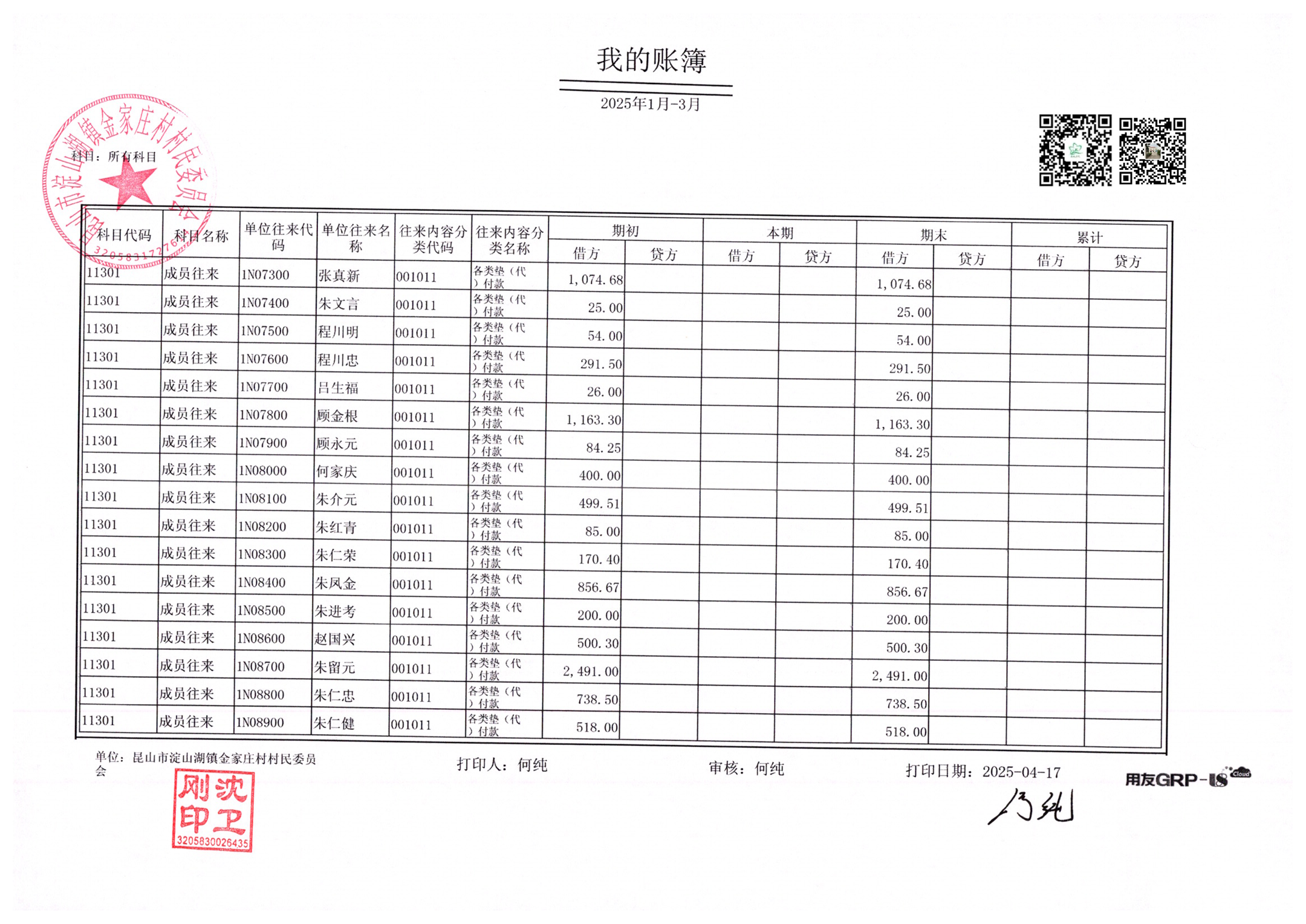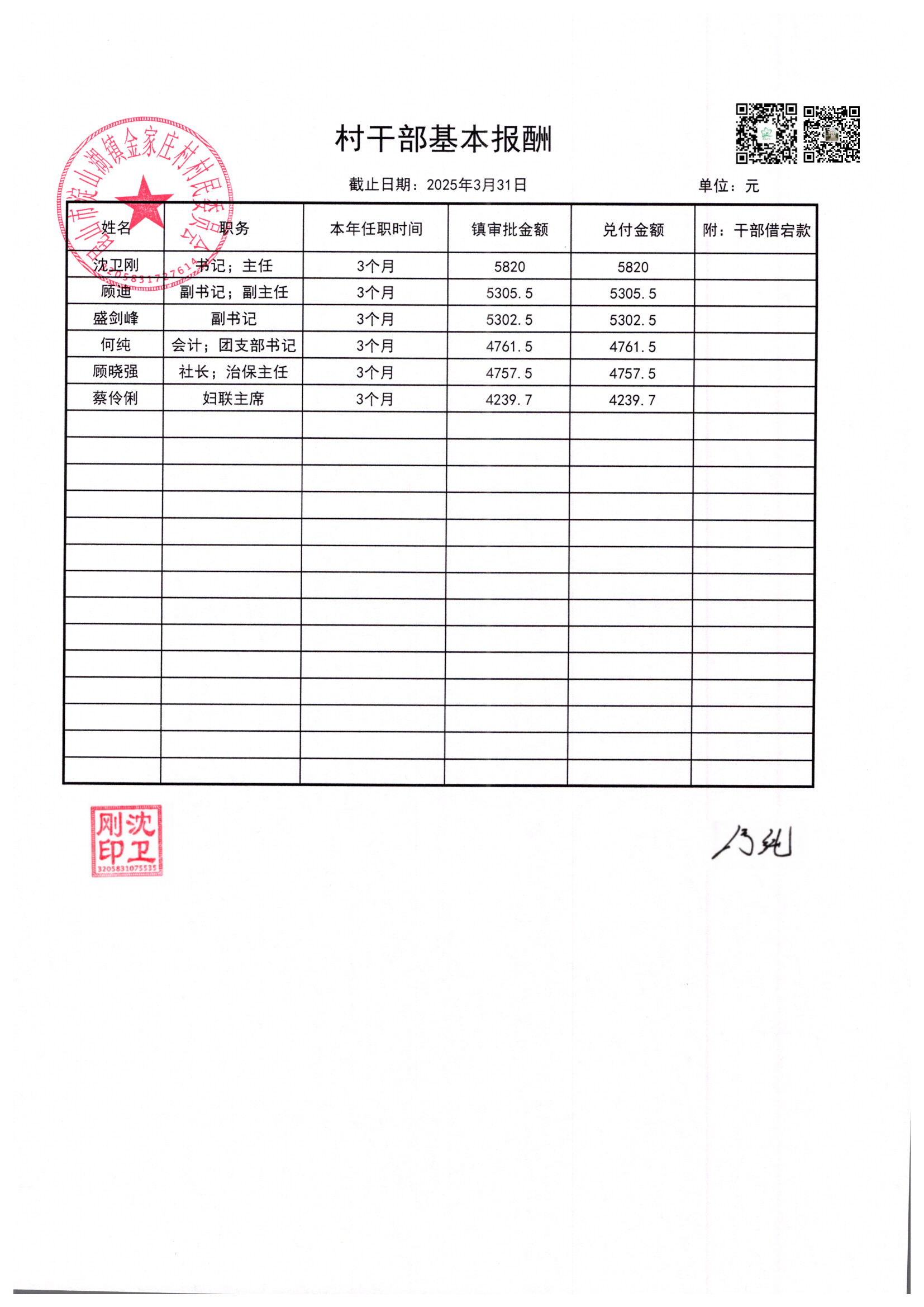 金家庄村村民委员会2025年3月财务公开