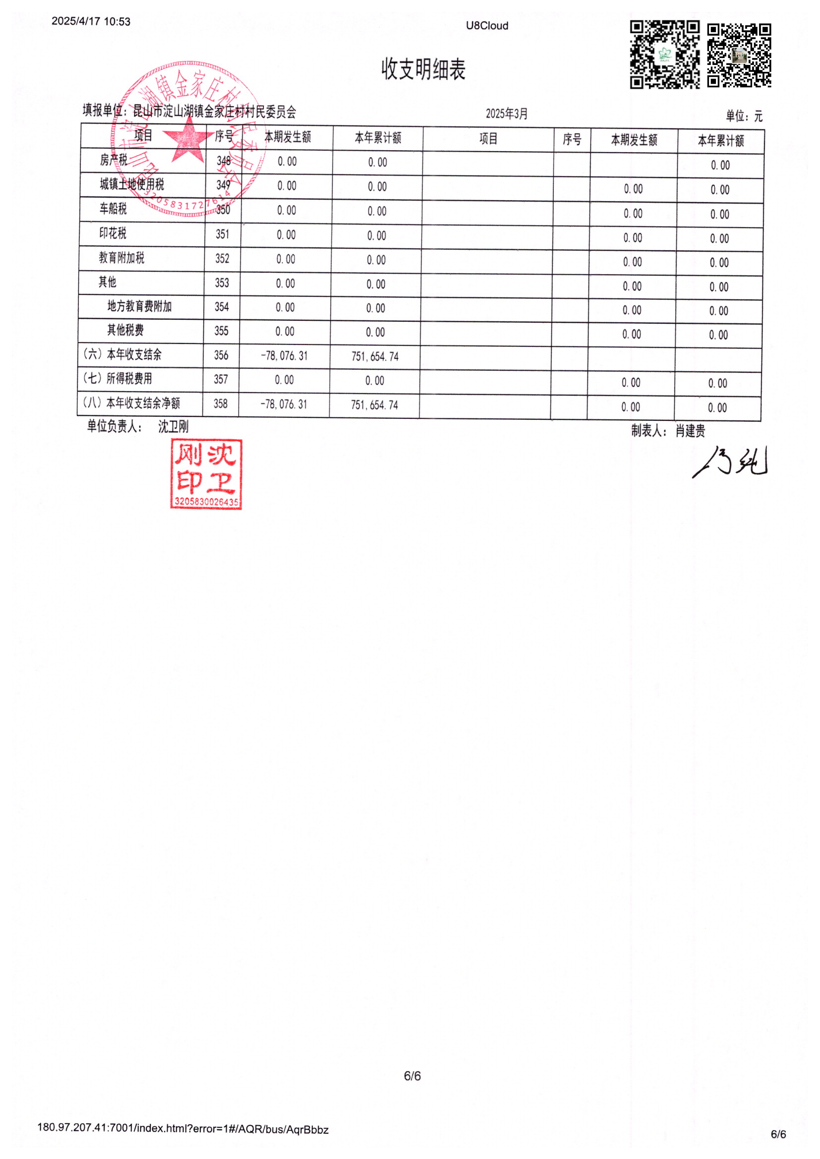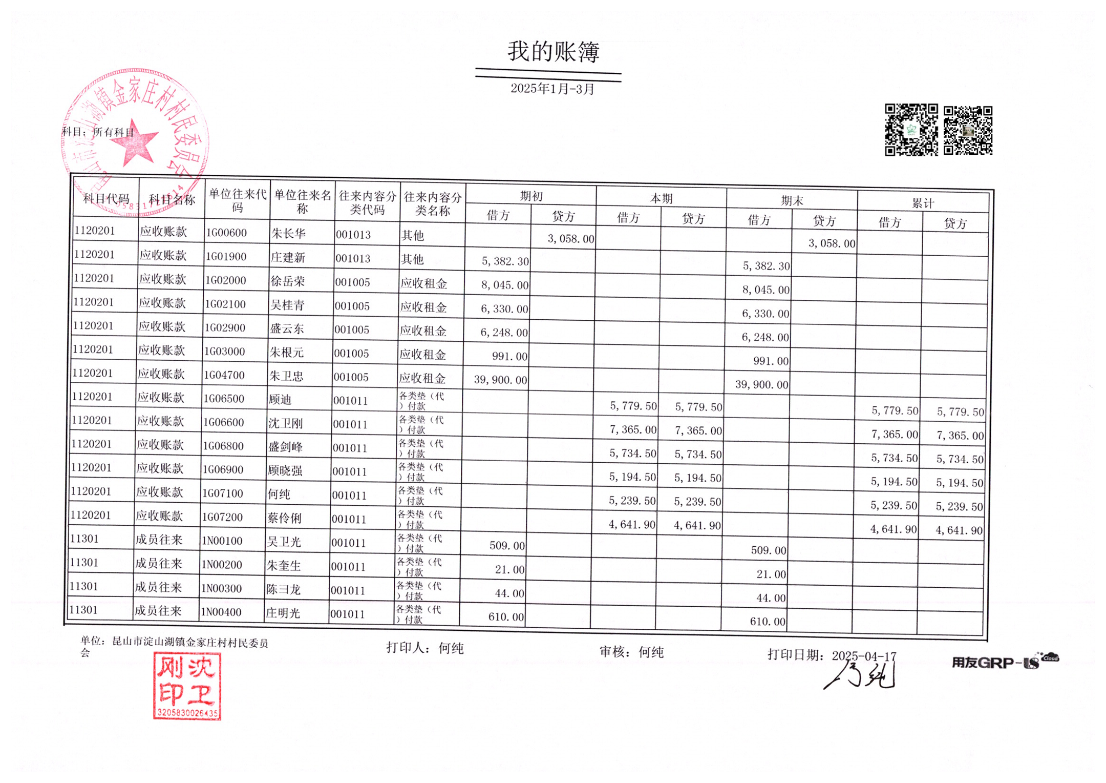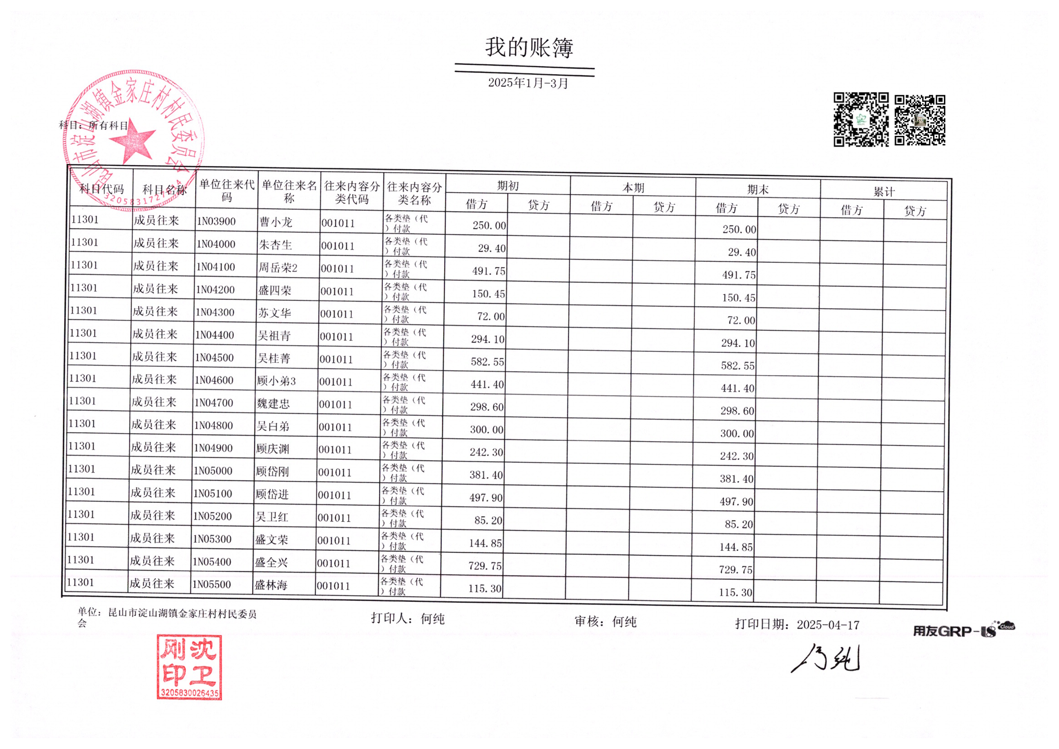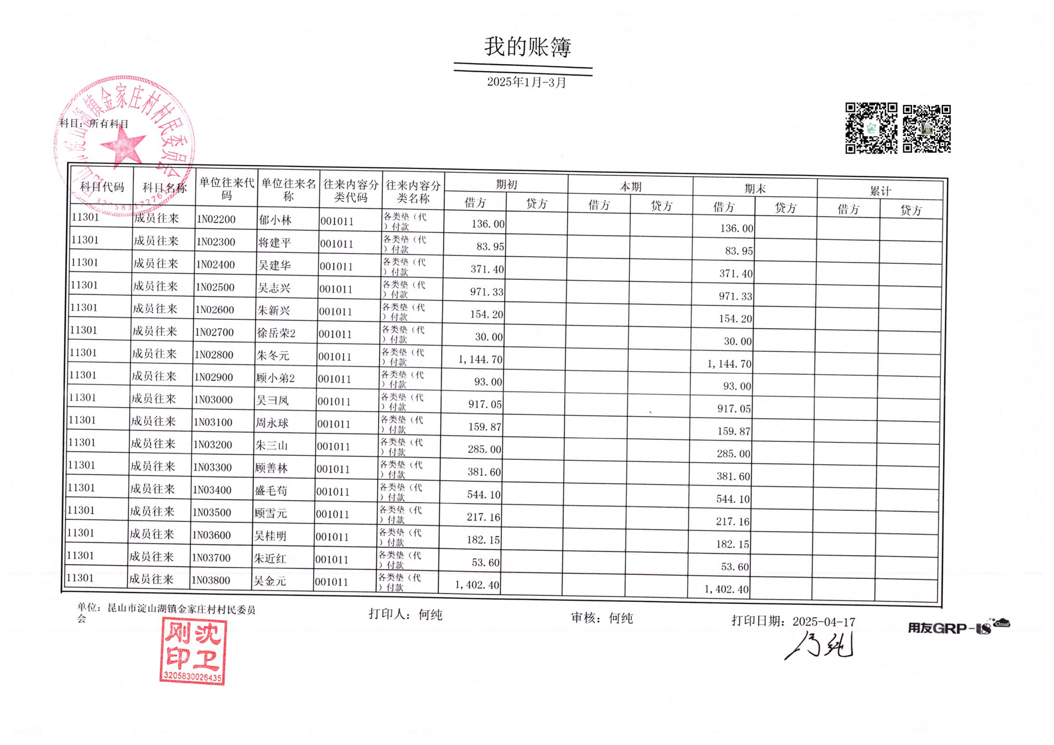 金家庄村村民委员会2025年3月财务公开