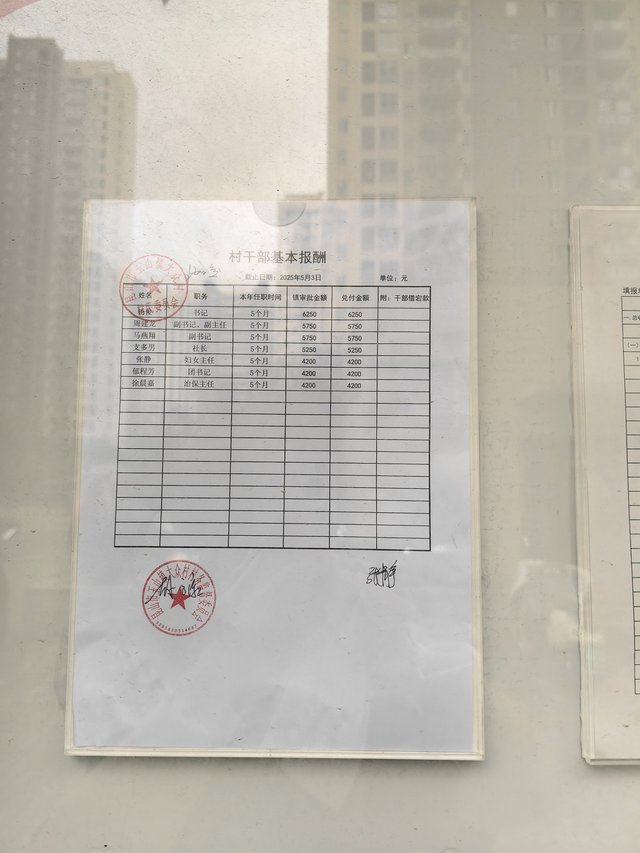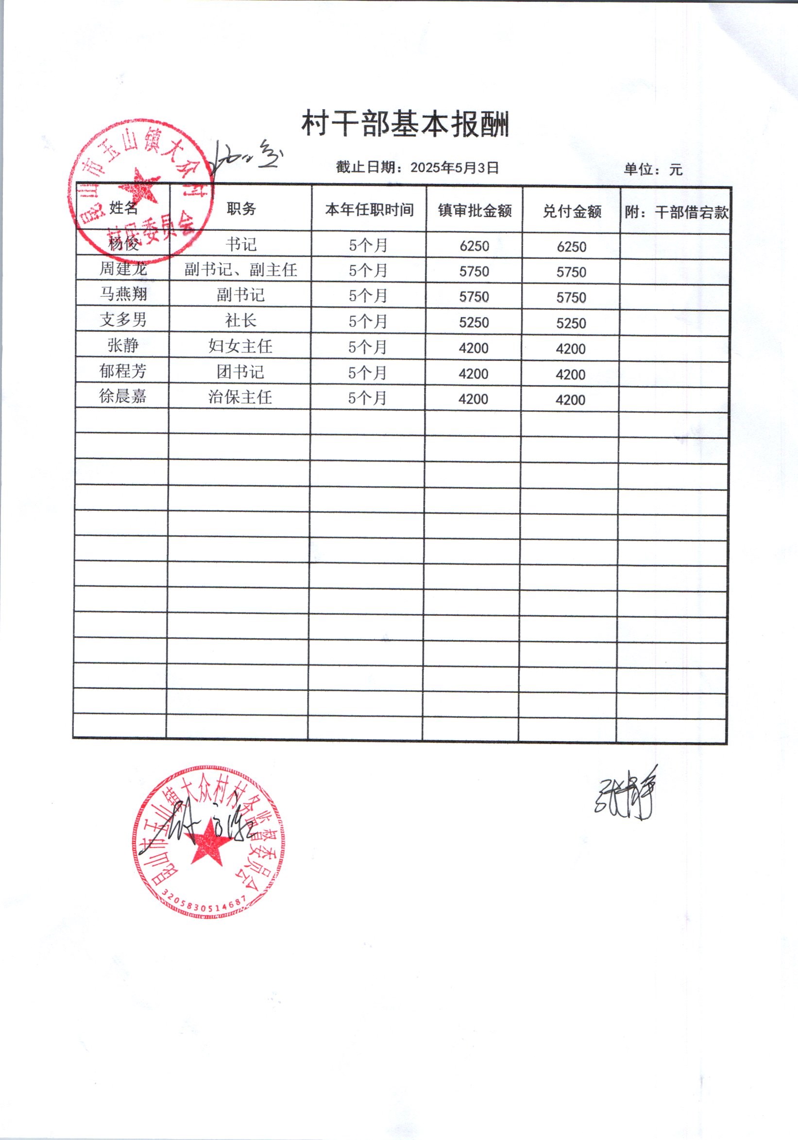 大众村2025年5月份村干部基本报酬公开