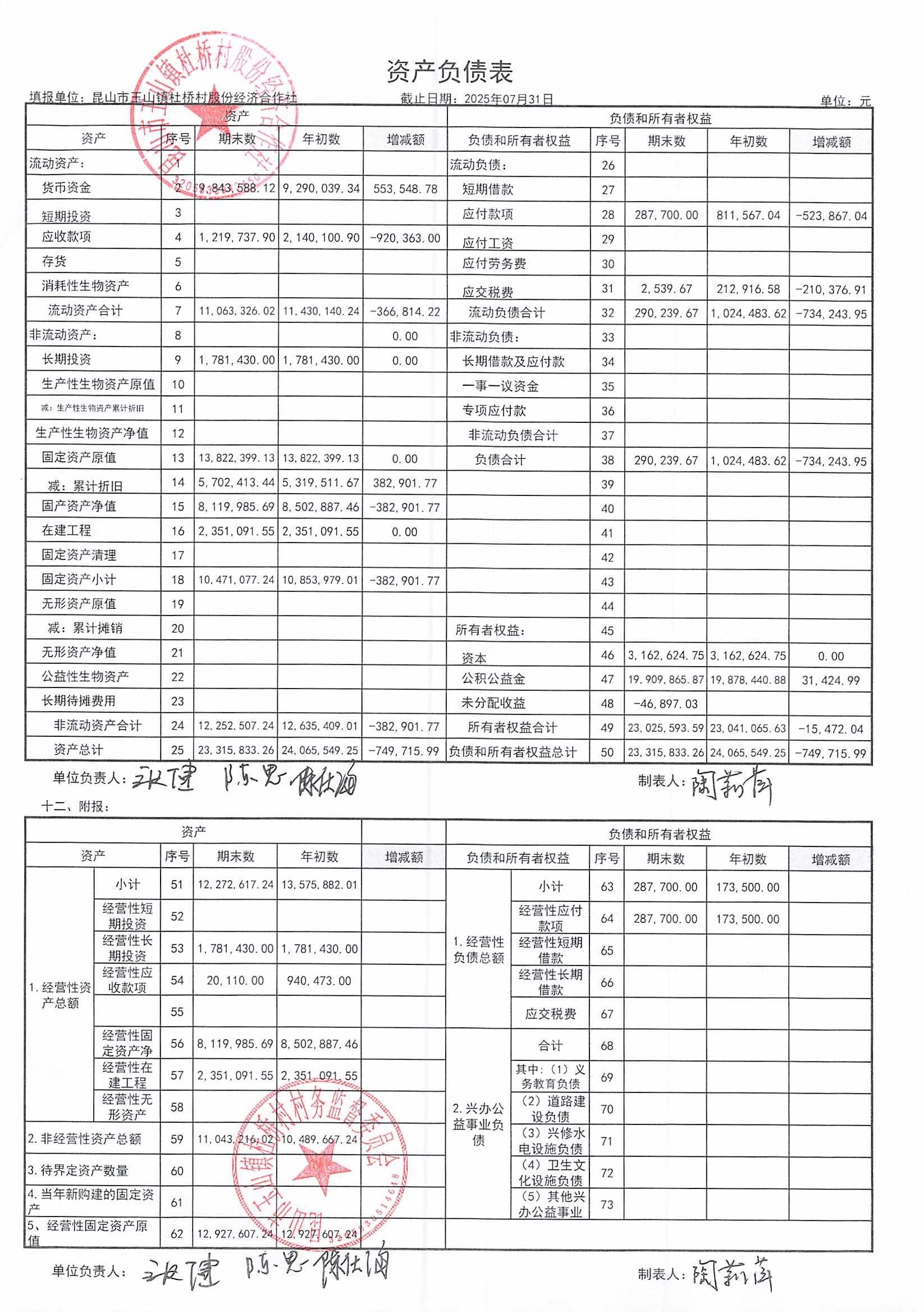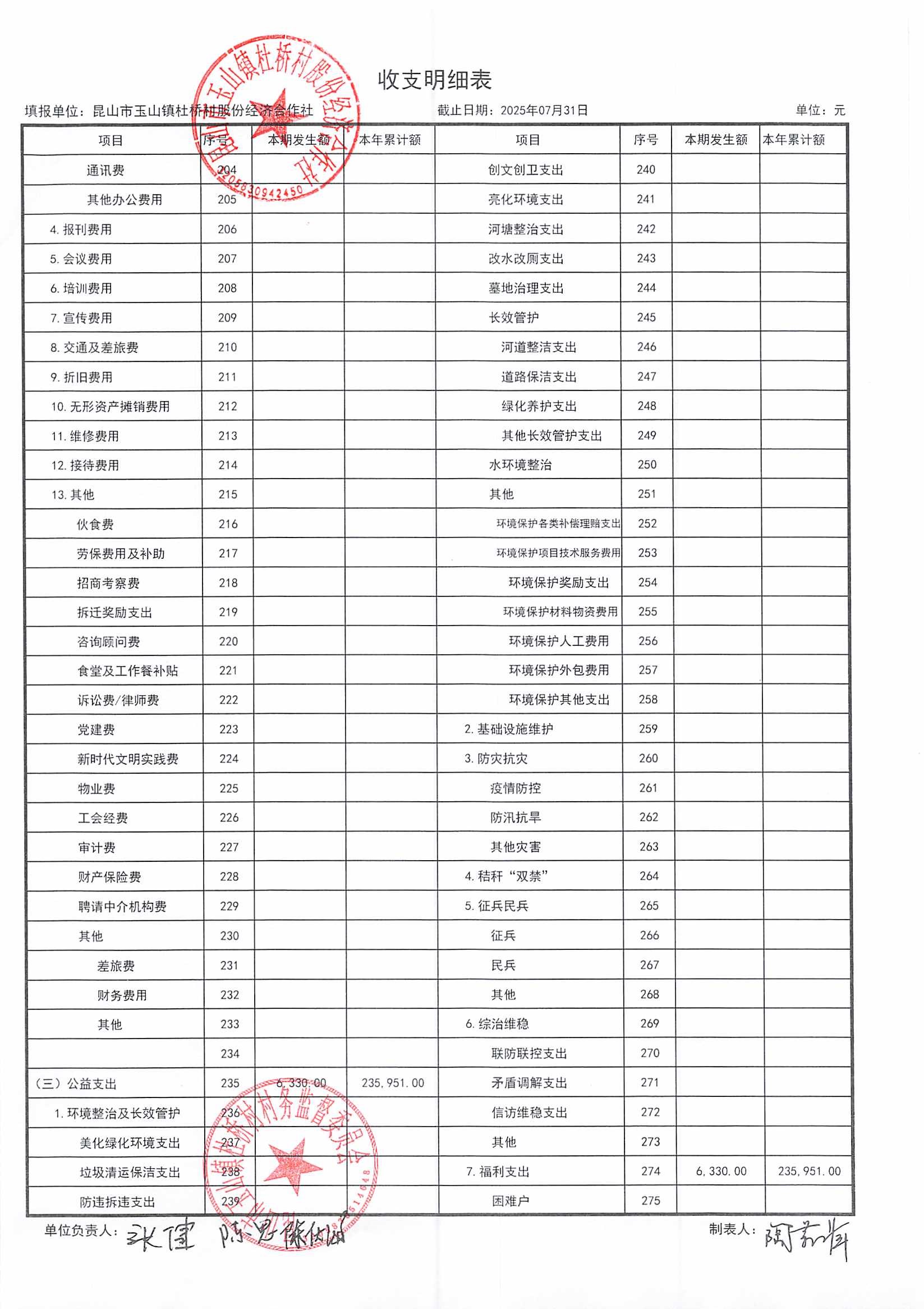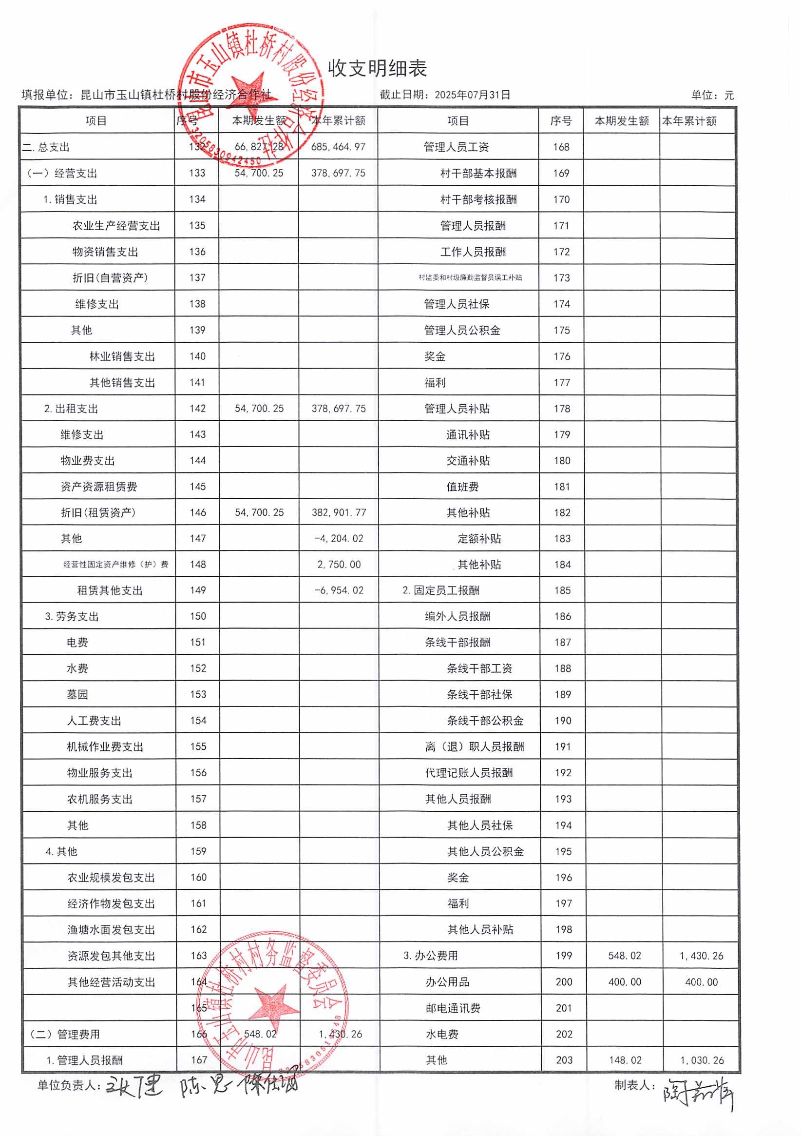 杜桥村股份经济合作社2025年8月份财务公开(2025年7月数据)
