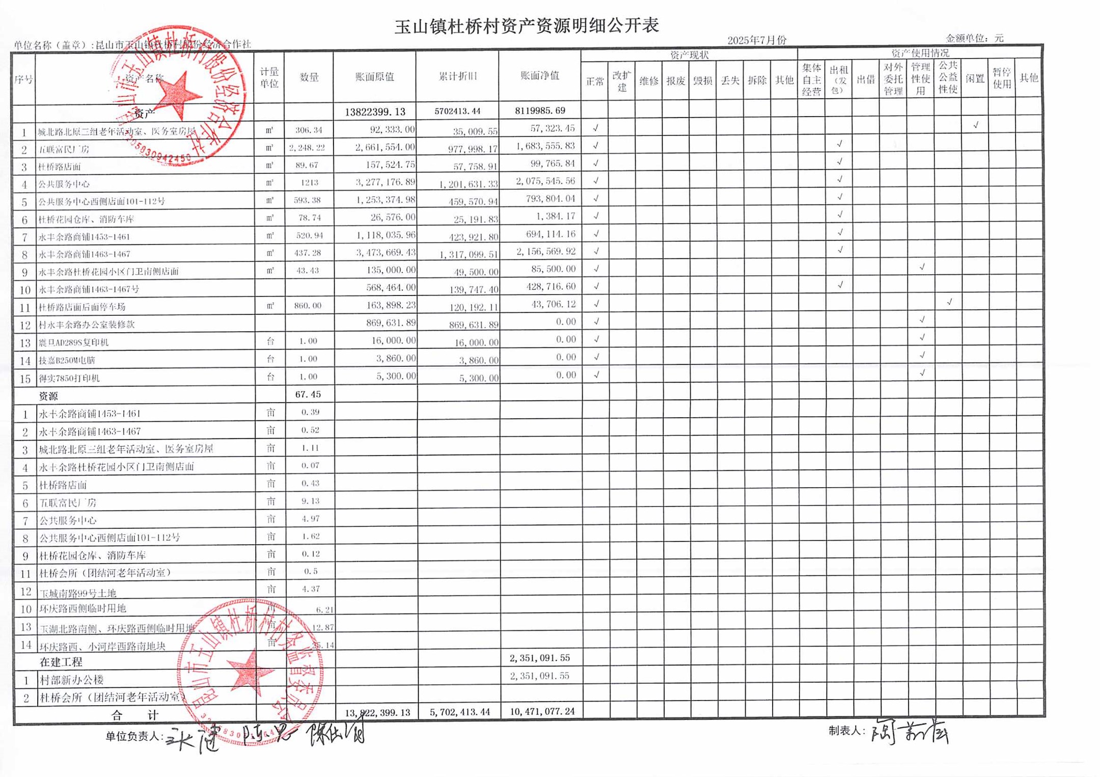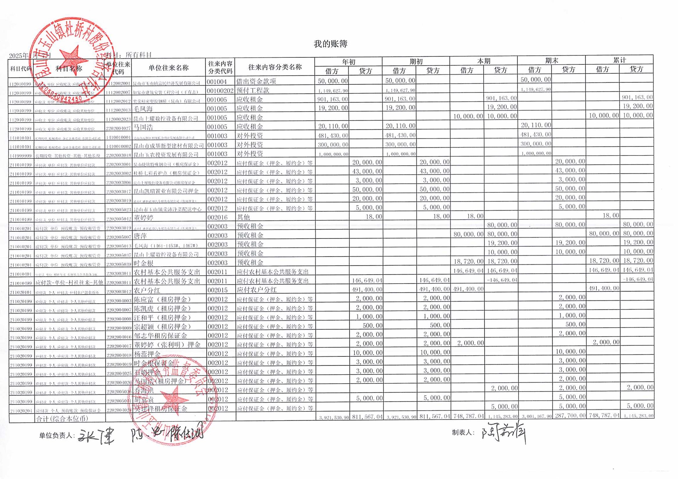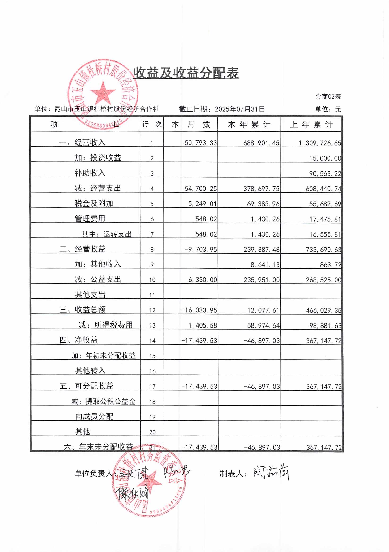 杜桥村股份经济合作社2025年8月份财务公开(2025年7月数据)
