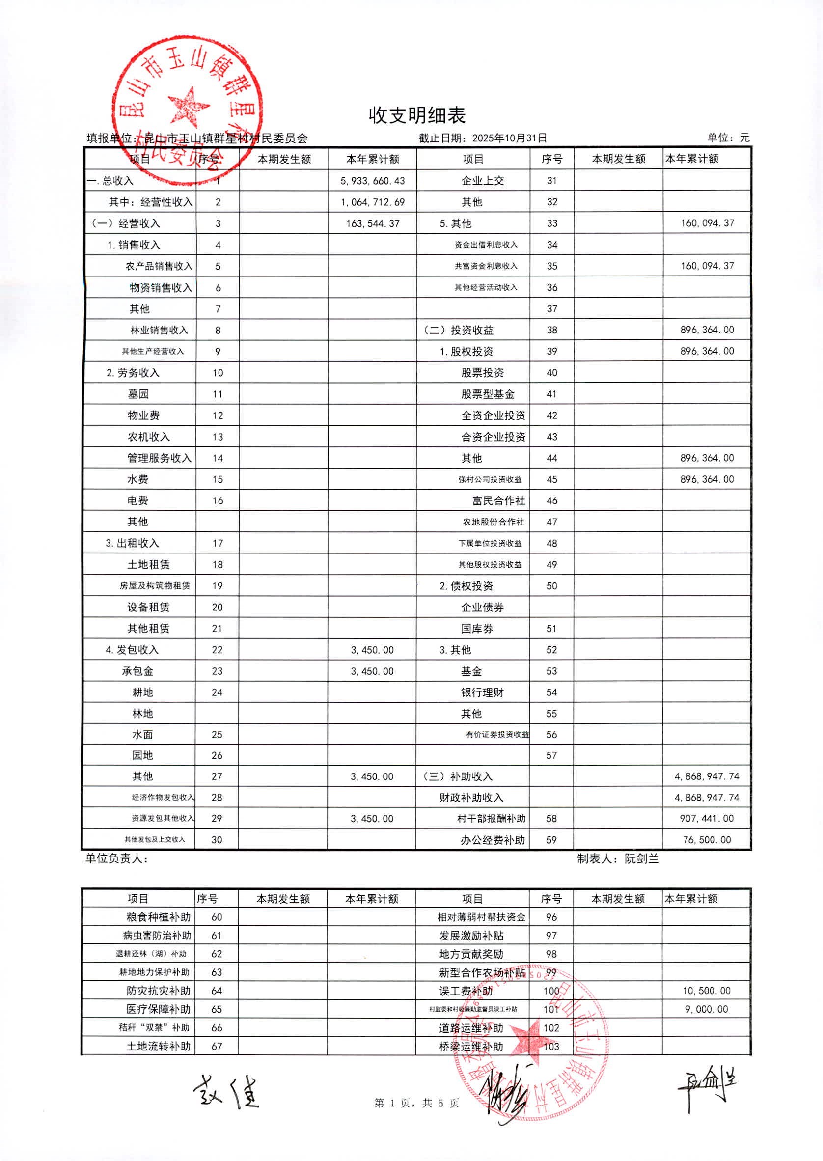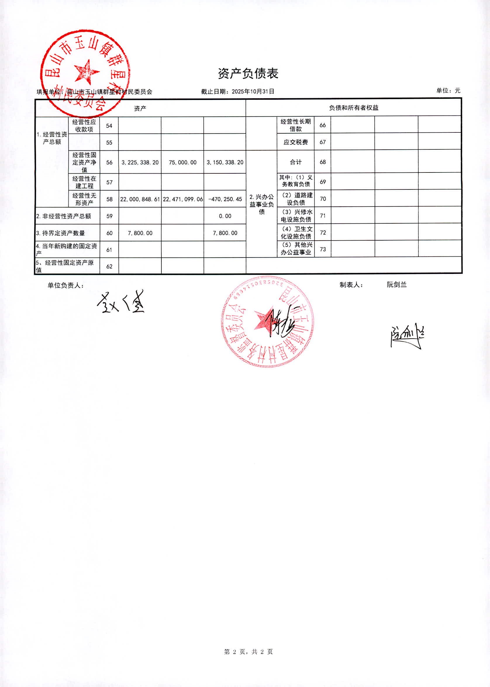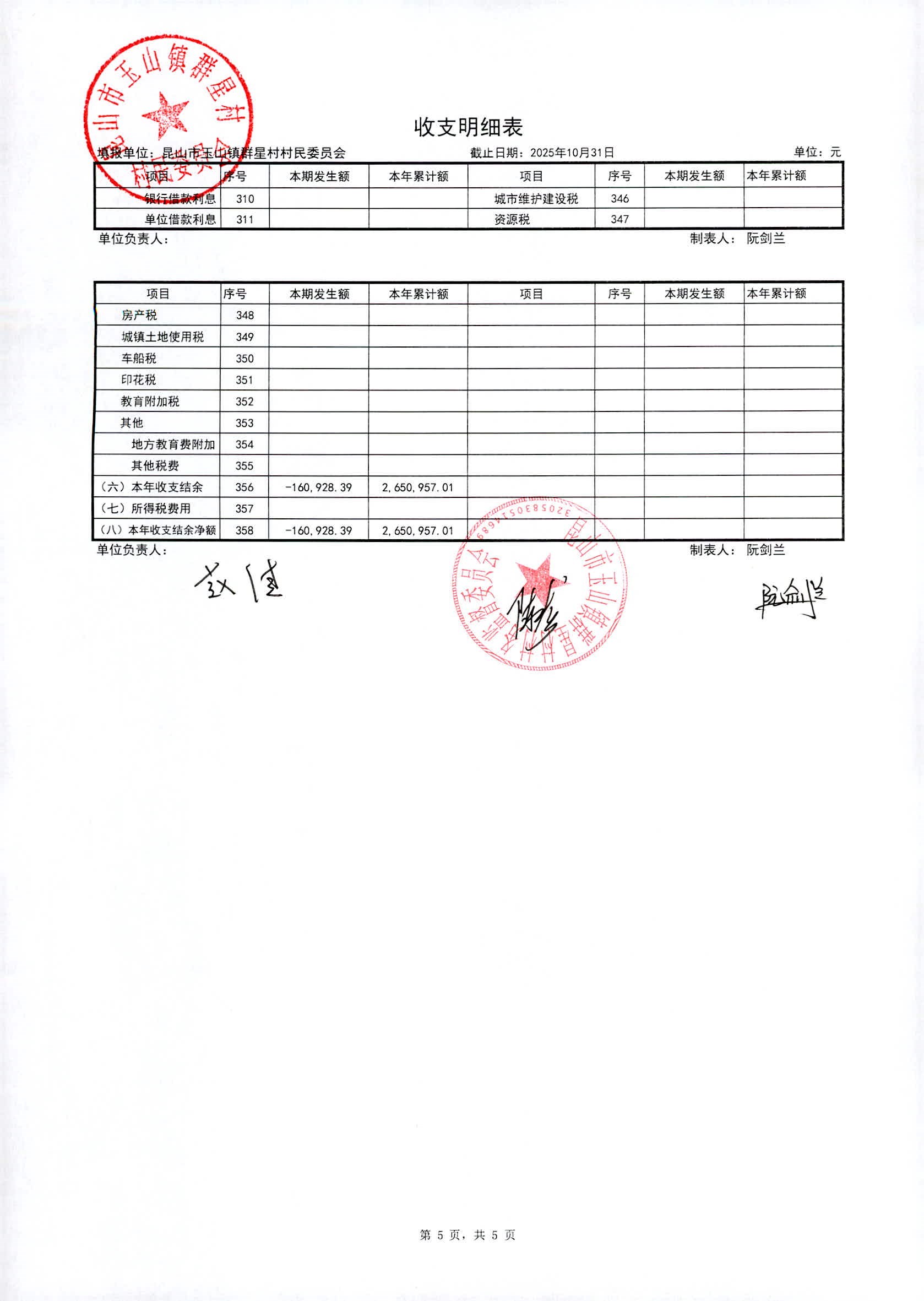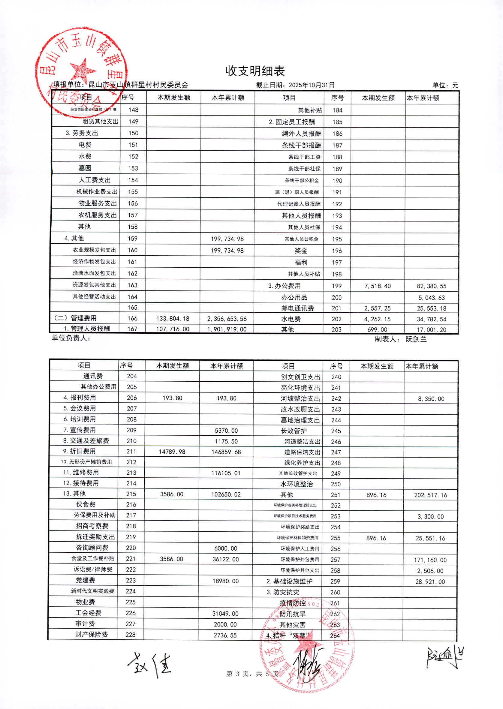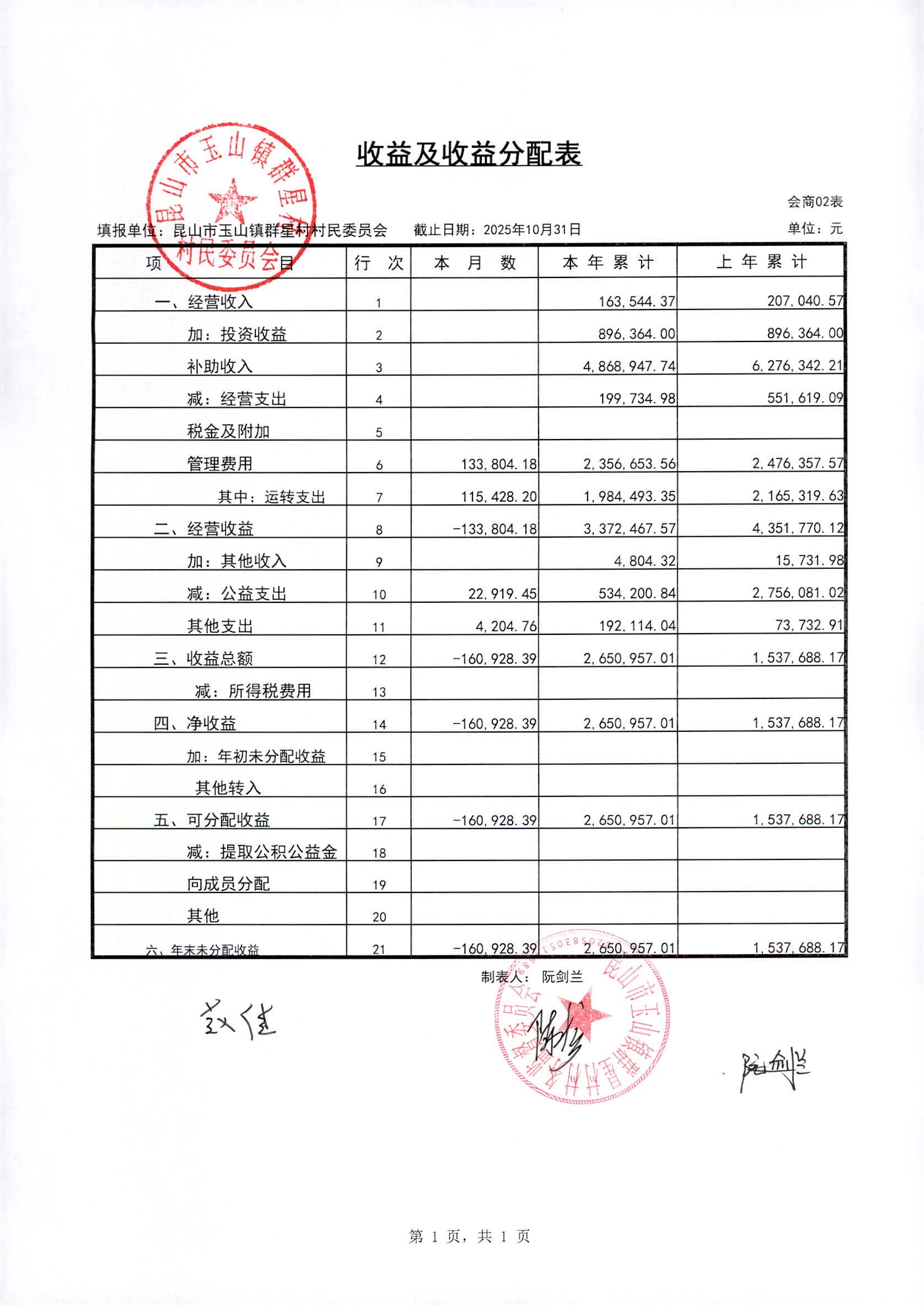 昆山高新区群星村2025年11月份公开村民委员会10月财务信息