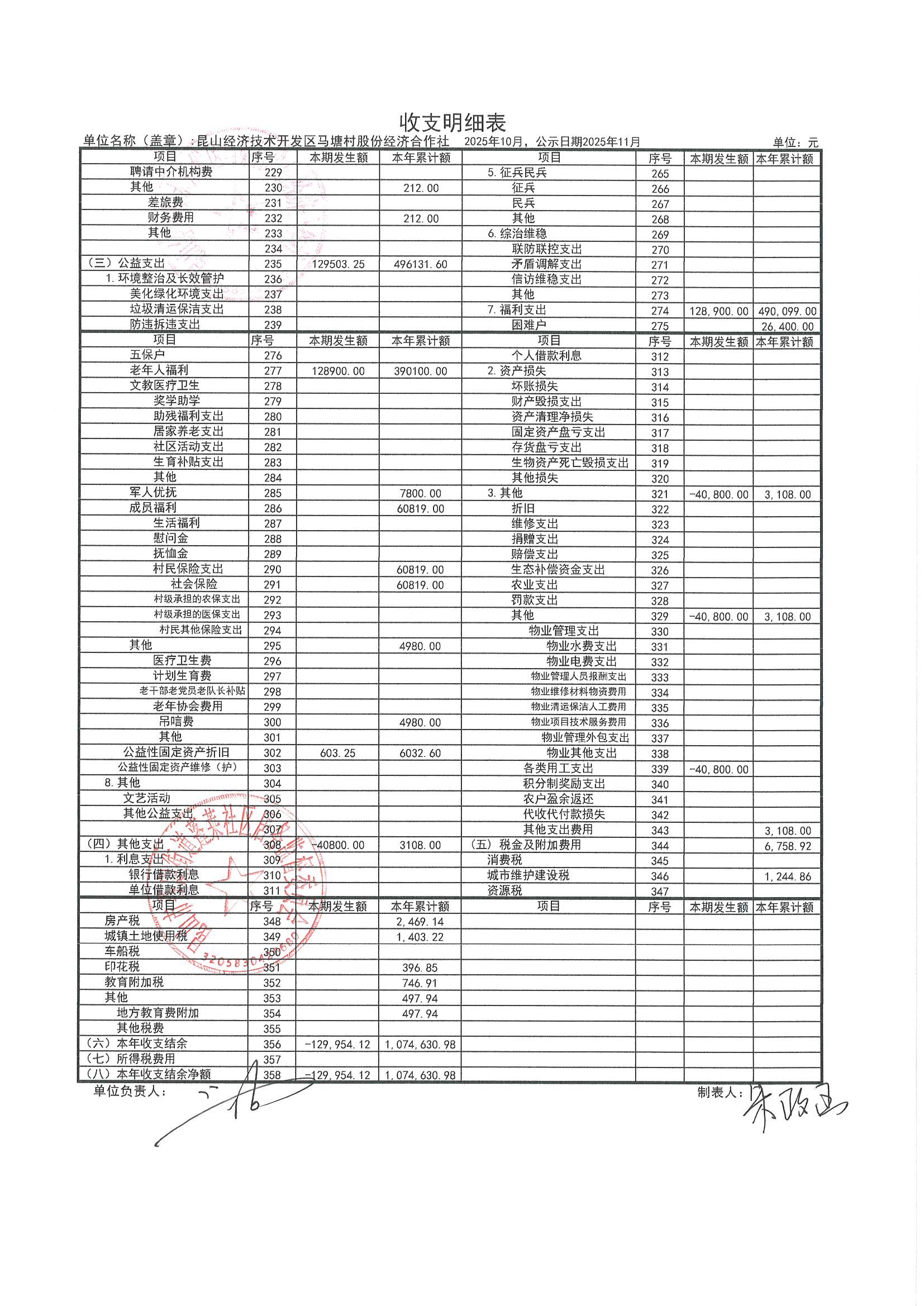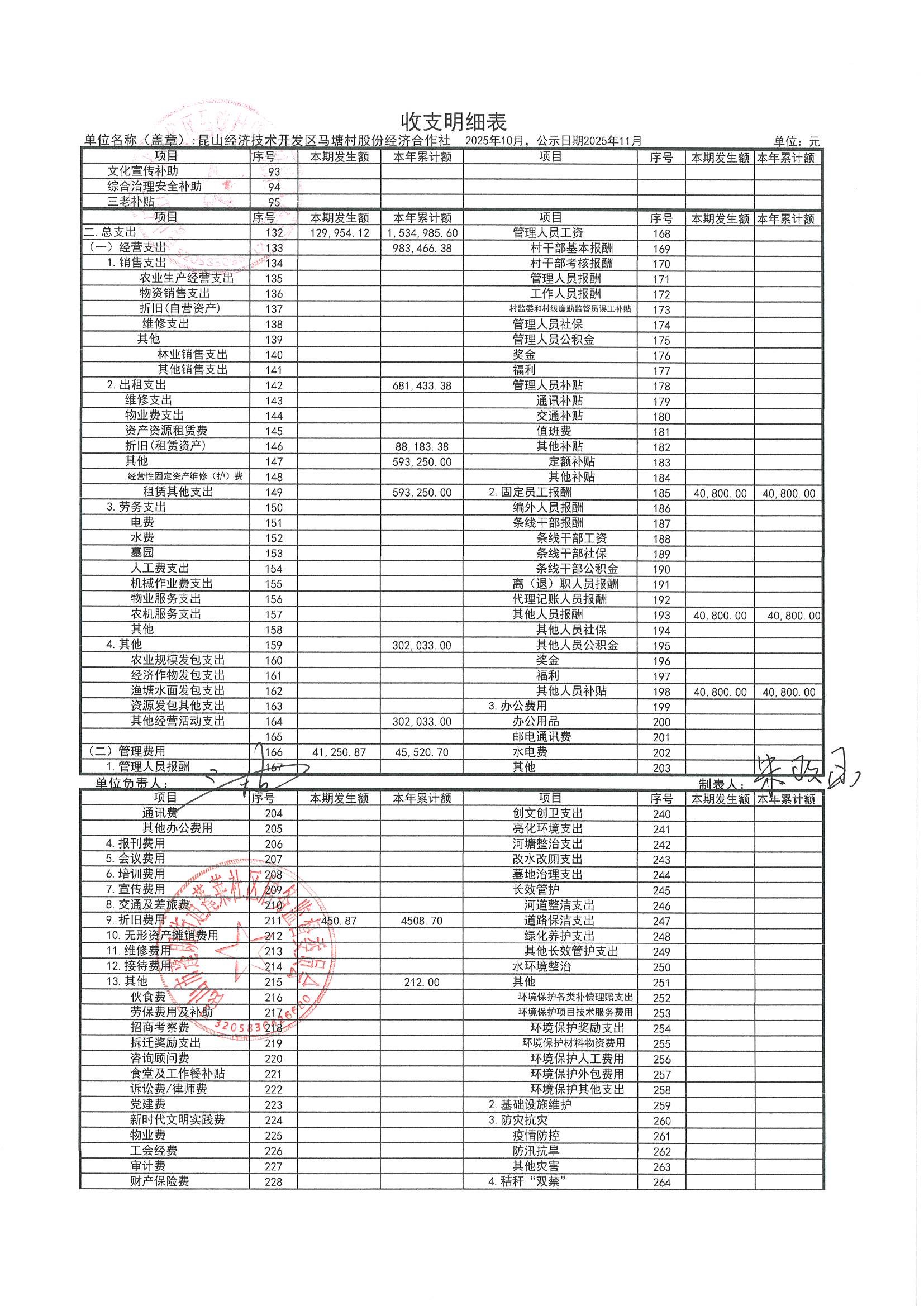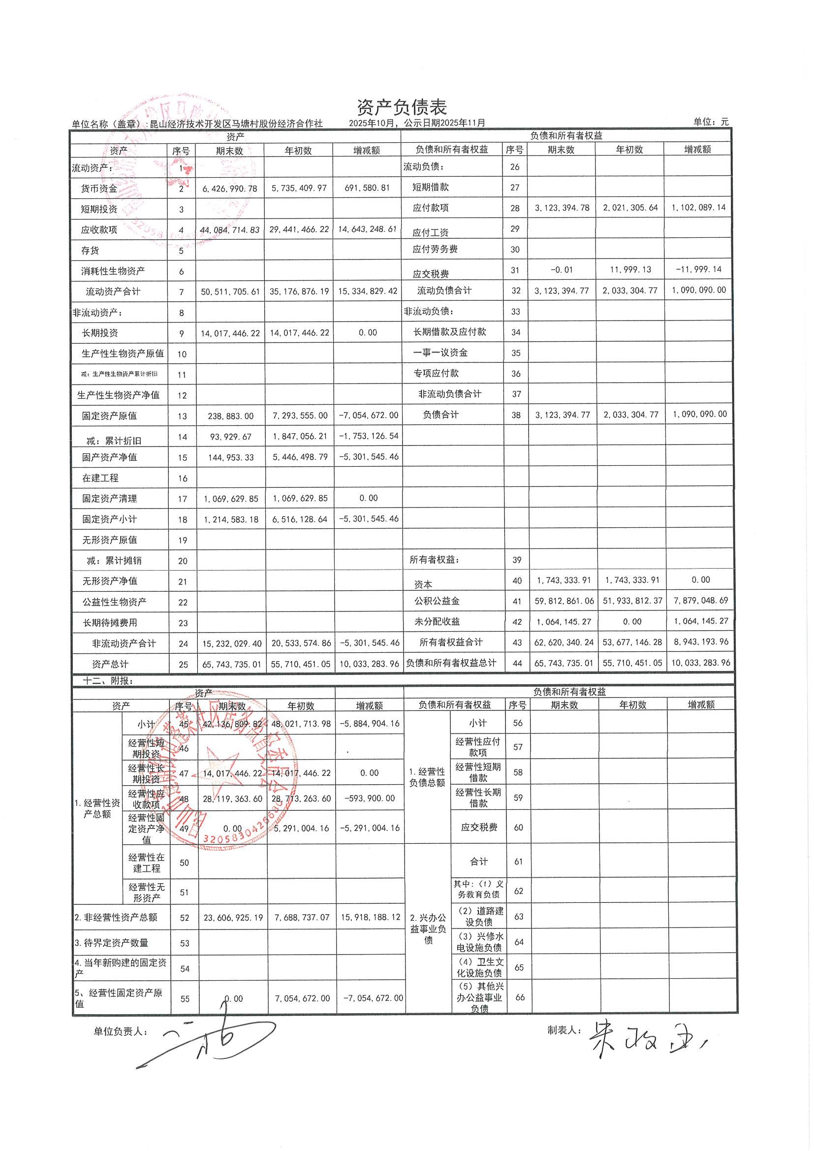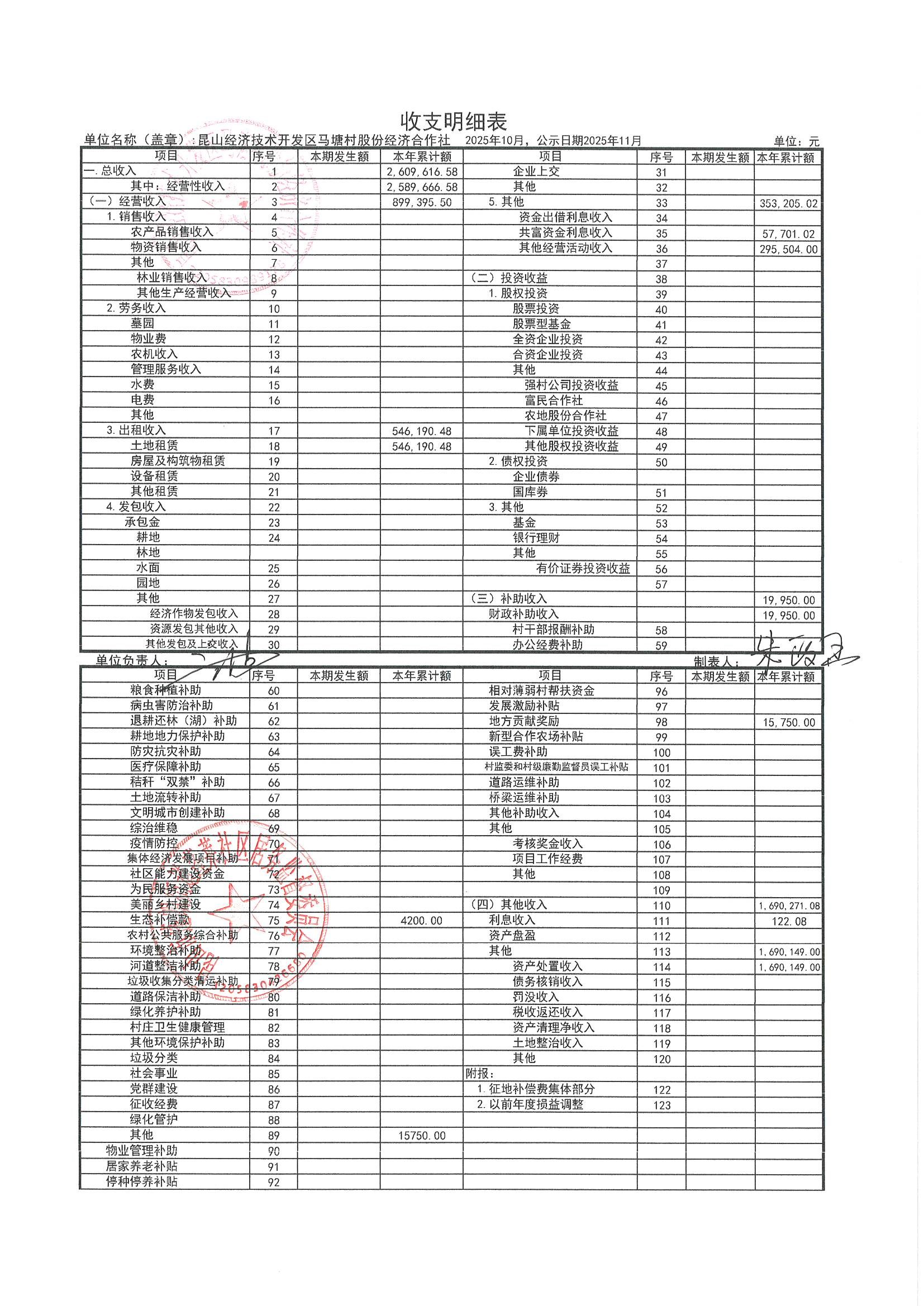 2025年10月财务公开(马塘村股份经济合作社)