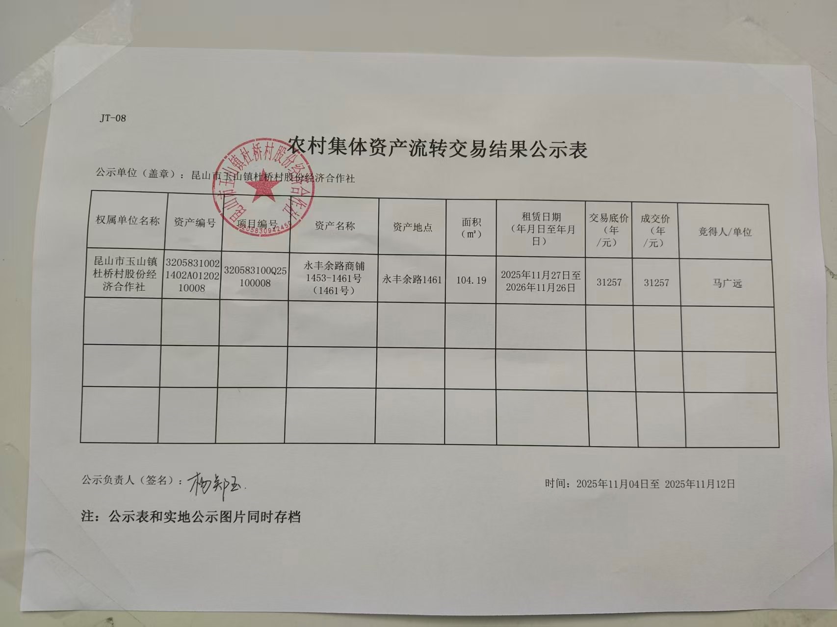 杜桥股份经济合作社农村集体资产流转交易结果公示表(马广远)