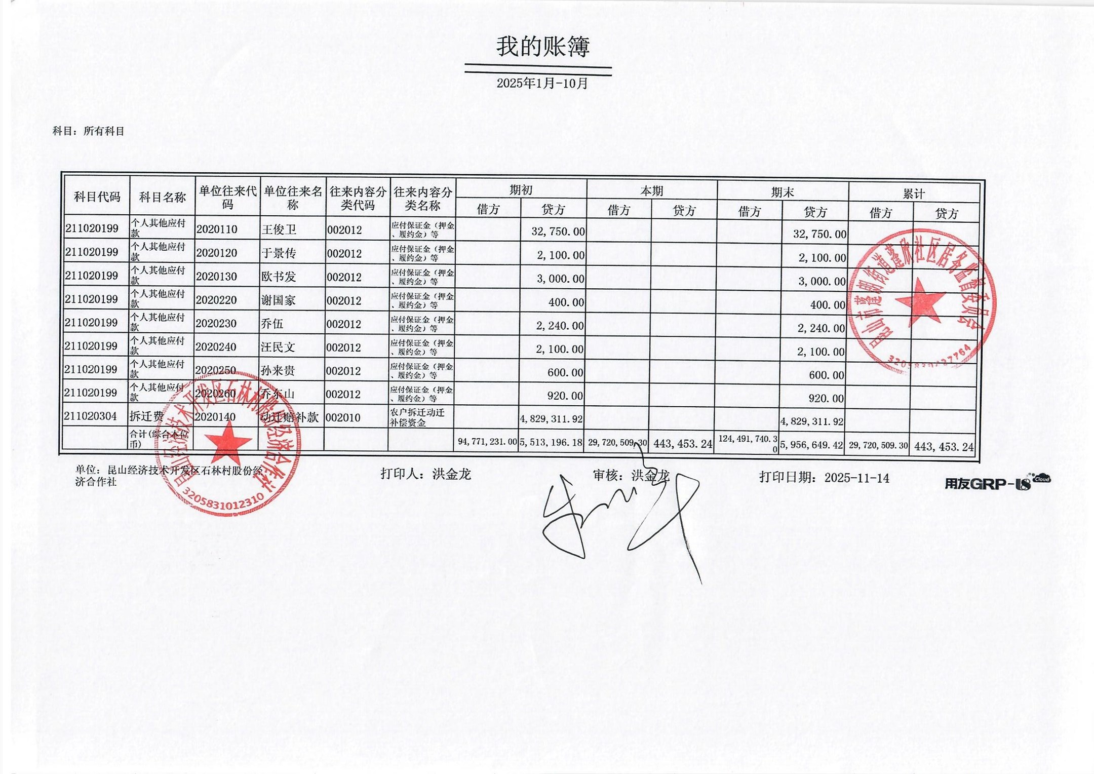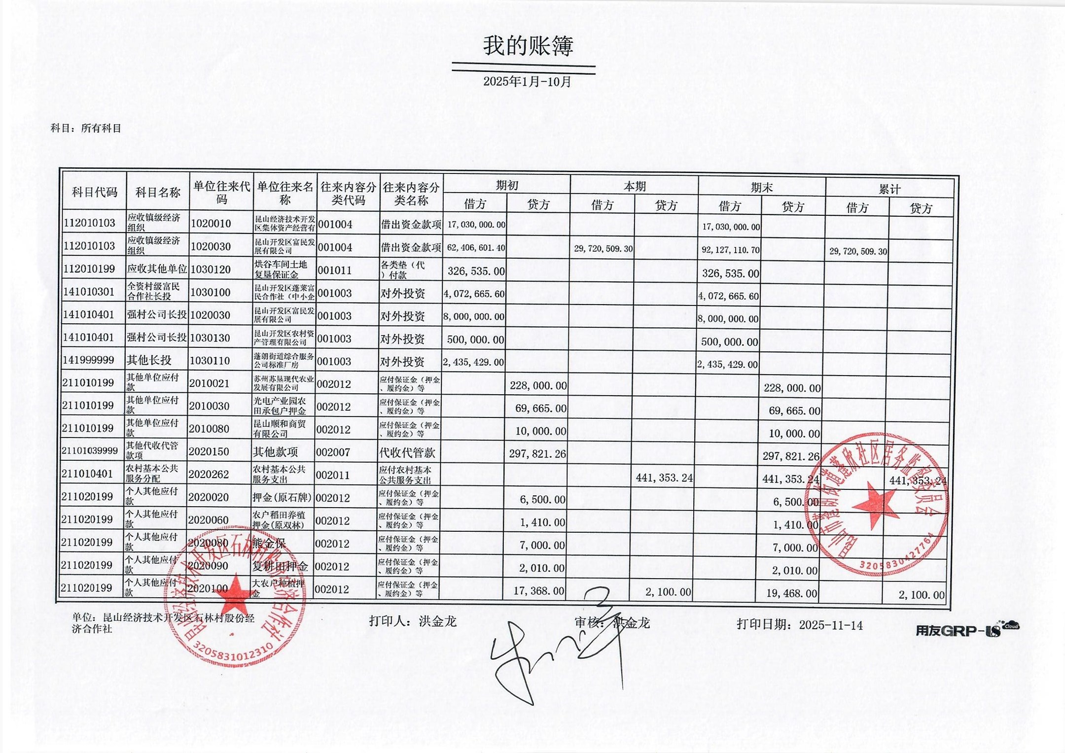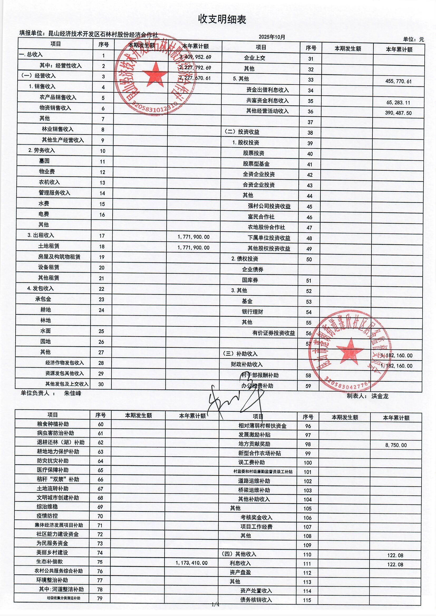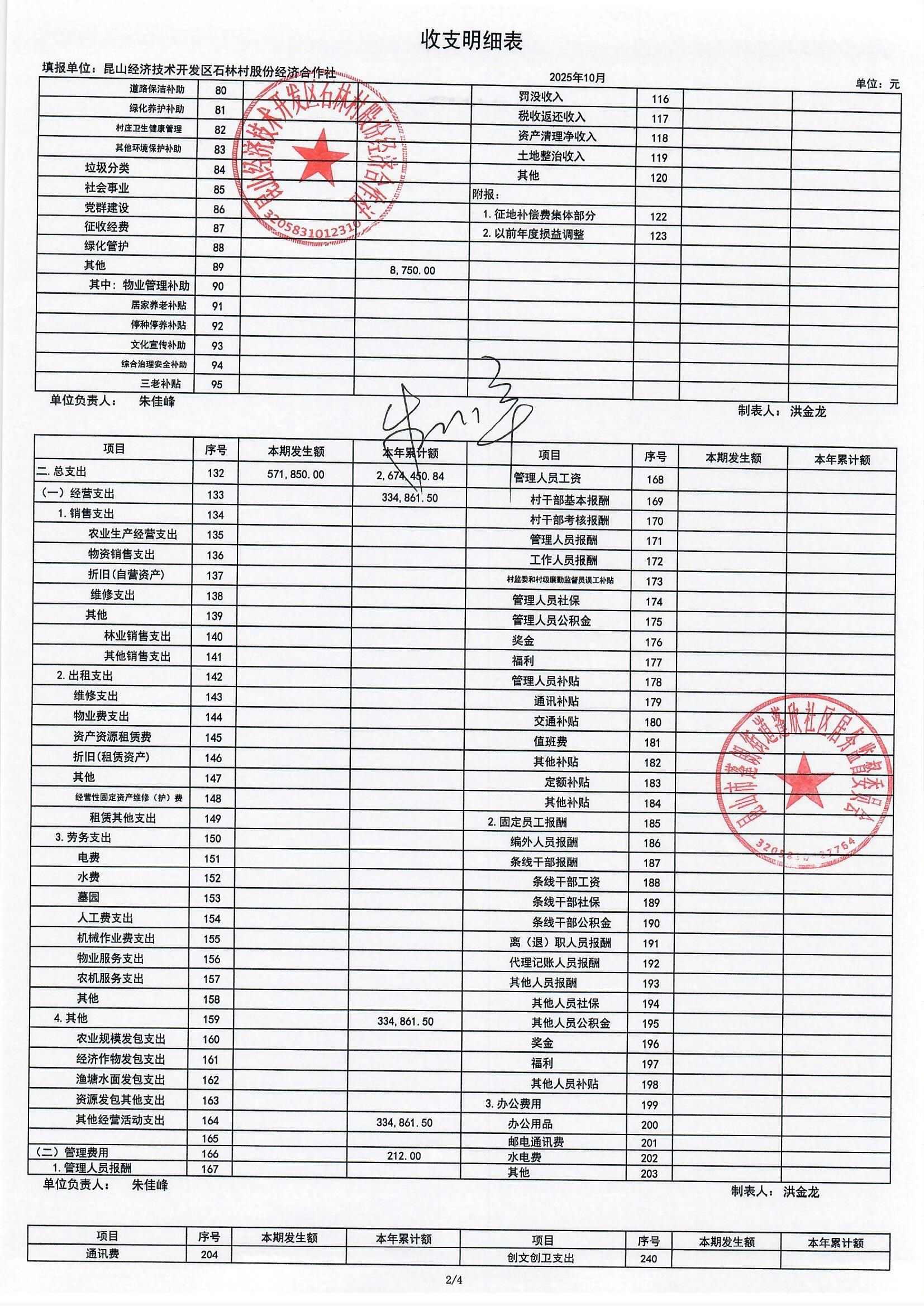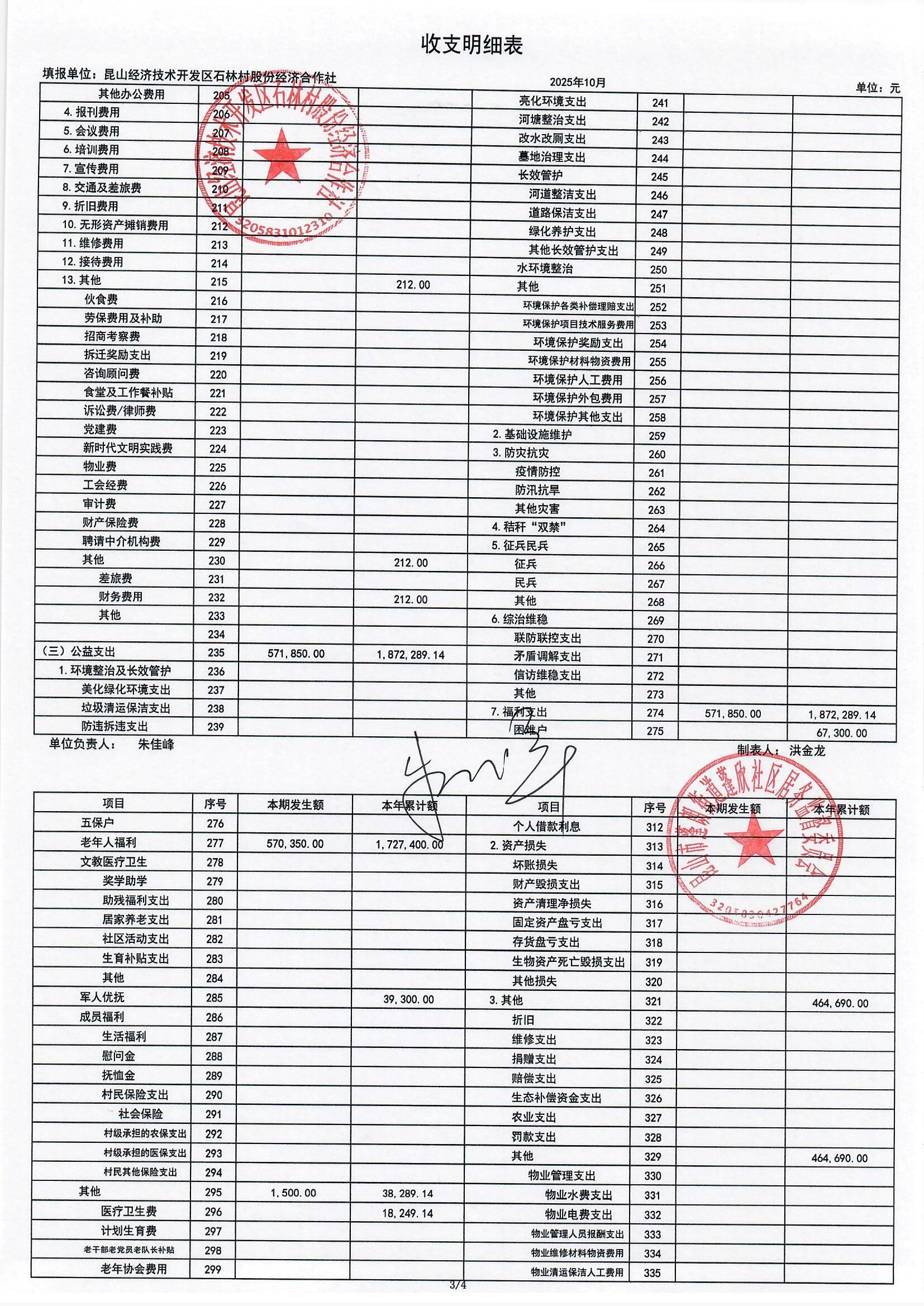 2025年10月份石林村股份经济合作社财务公开