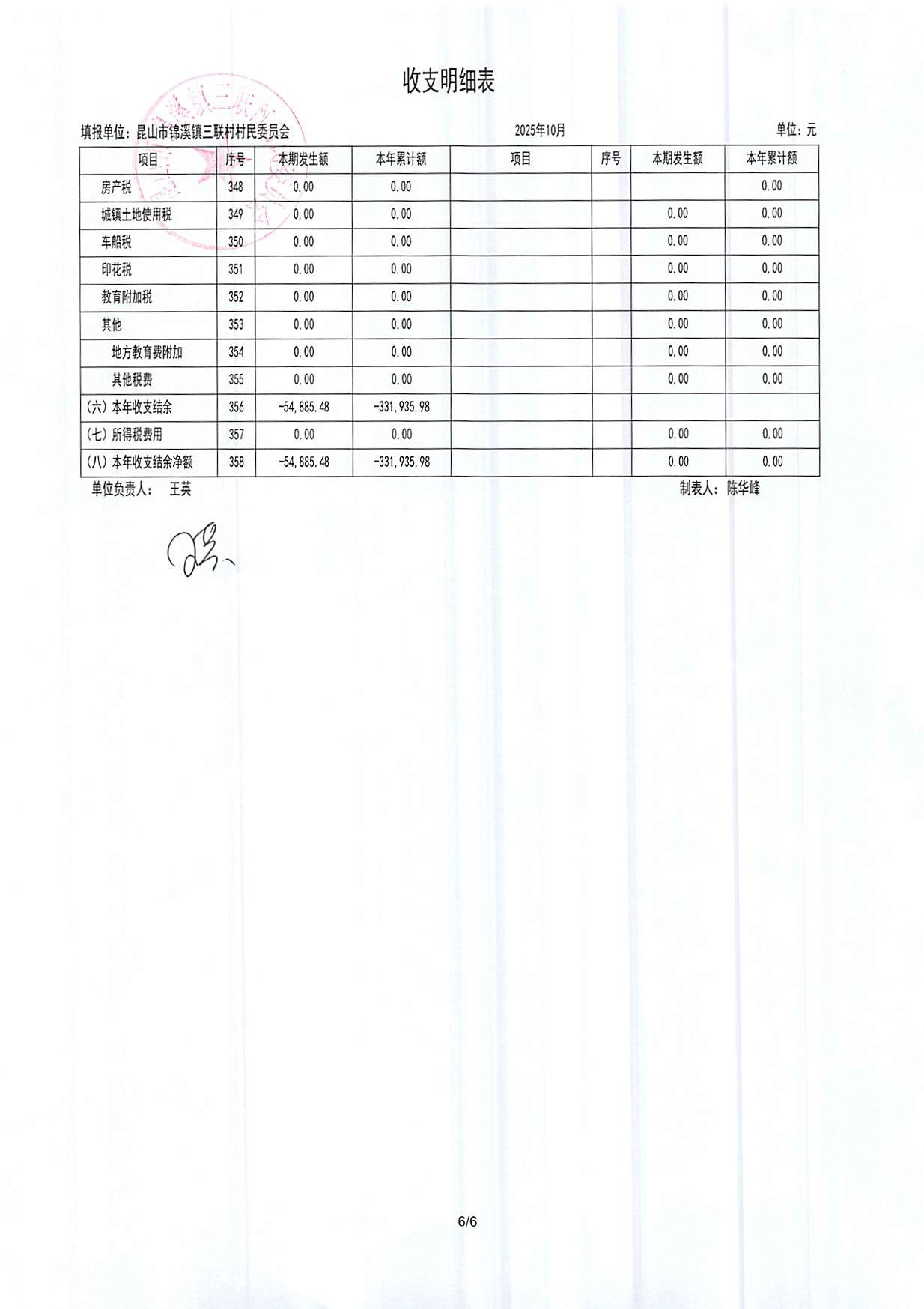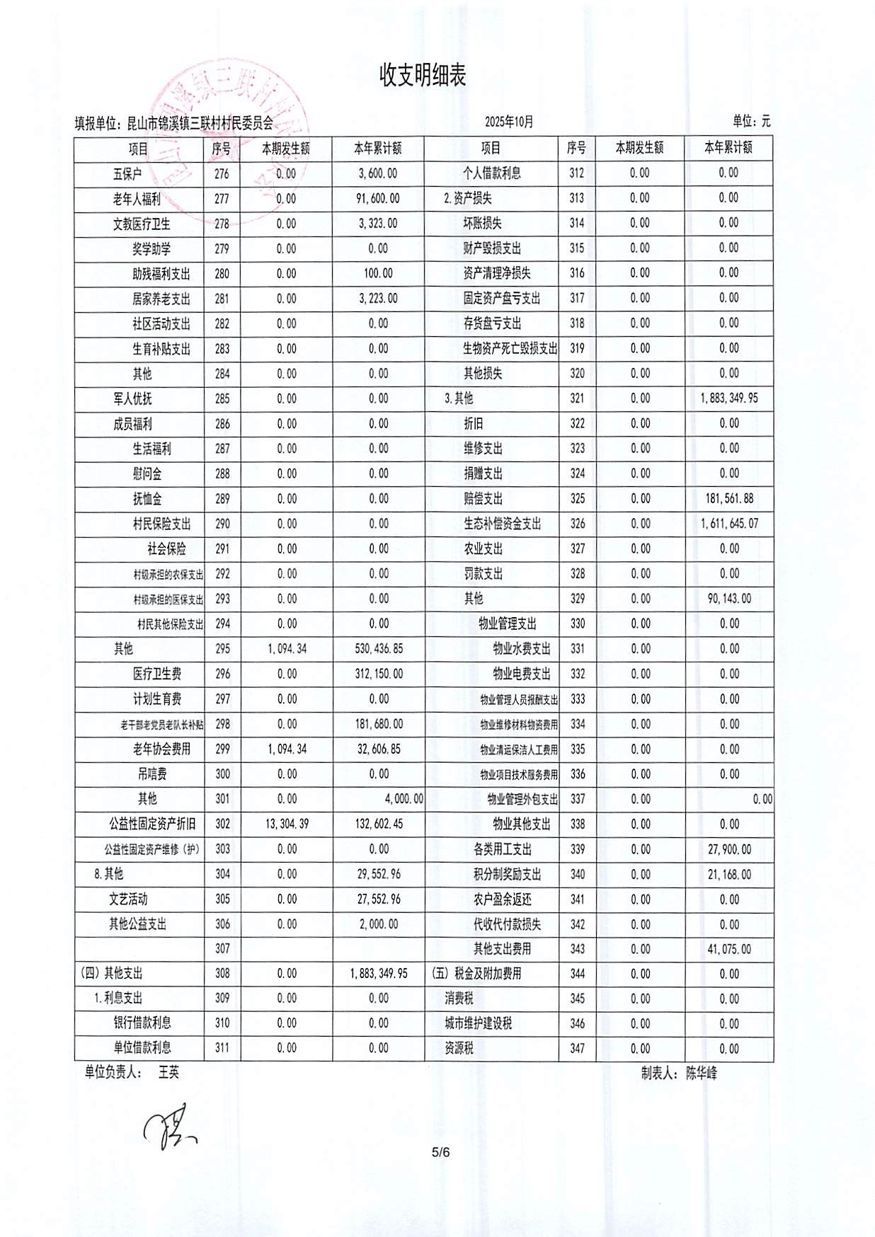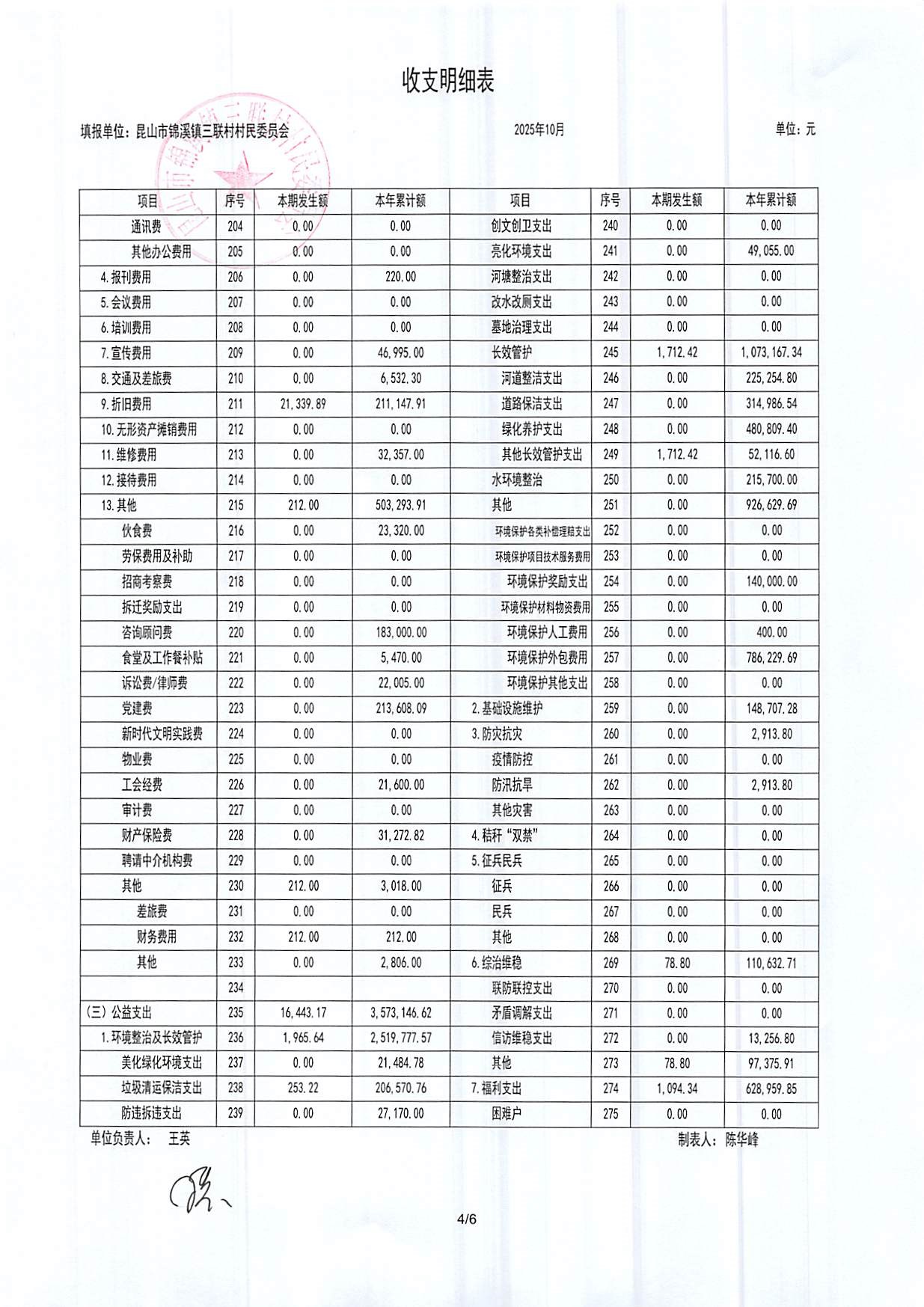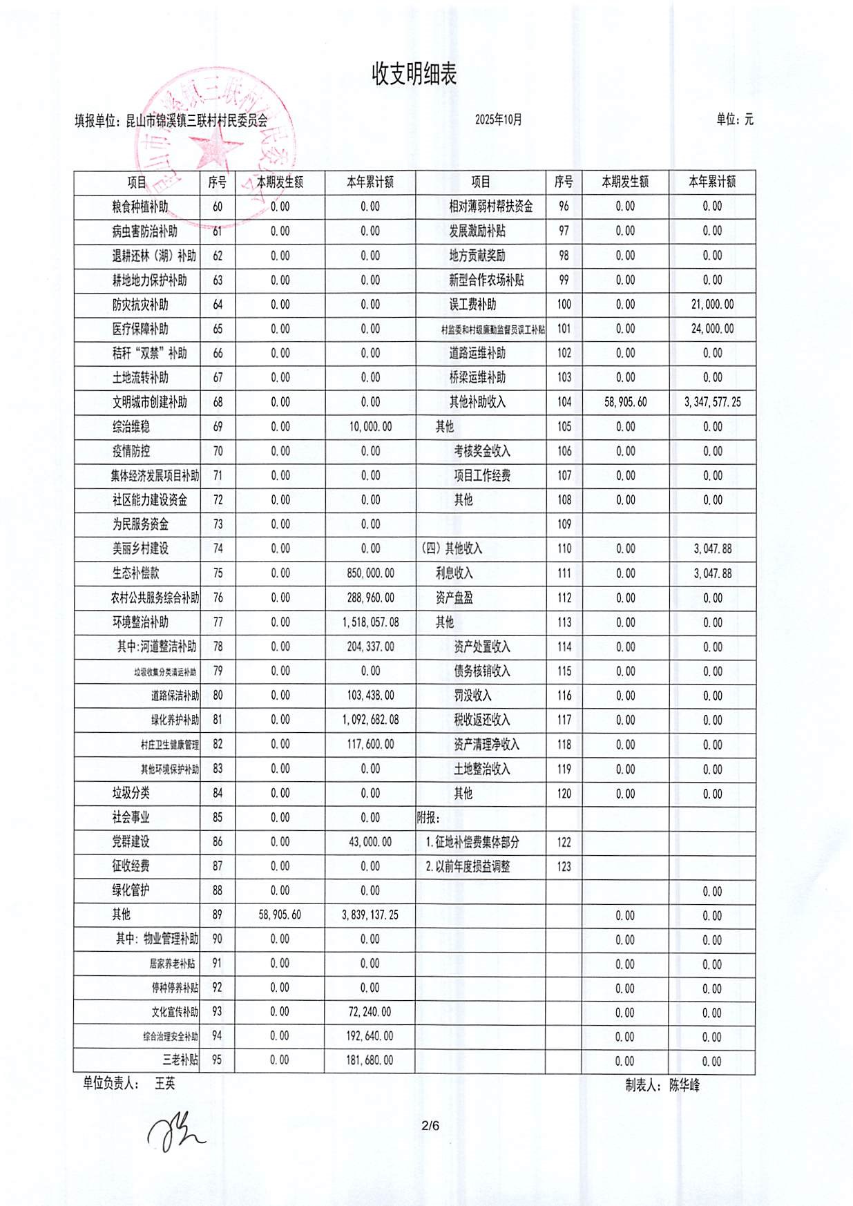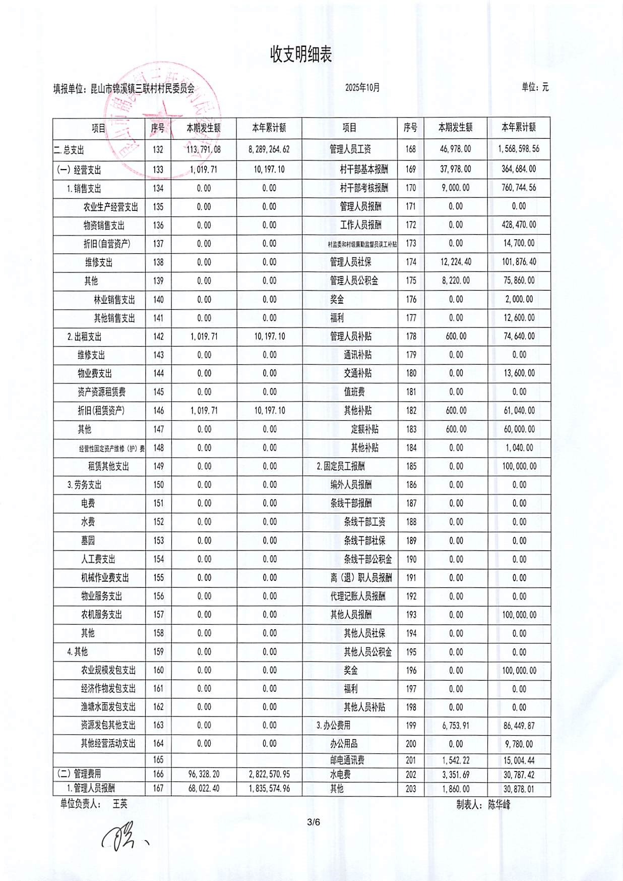 2025年三联村村委会10月份财务公开