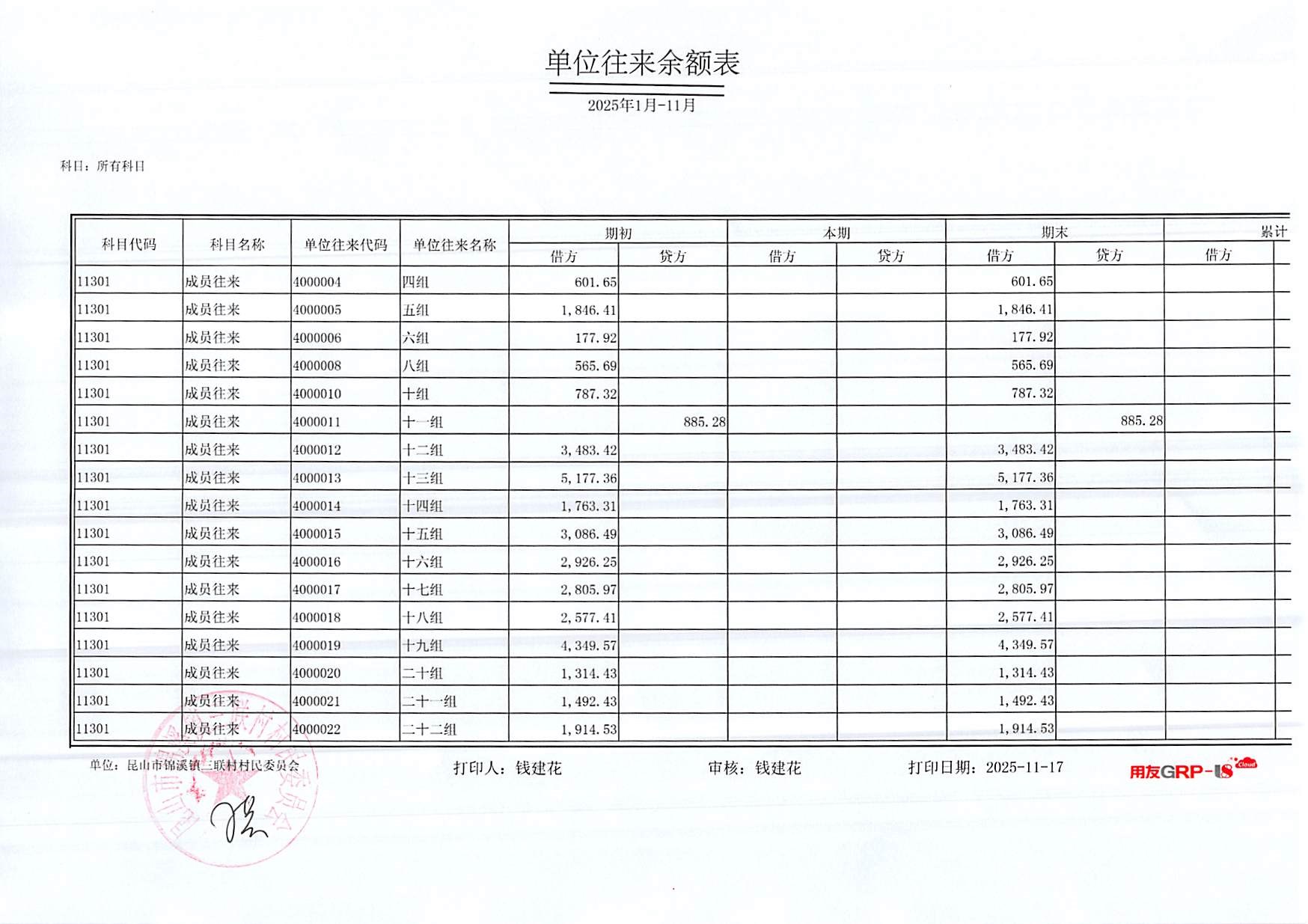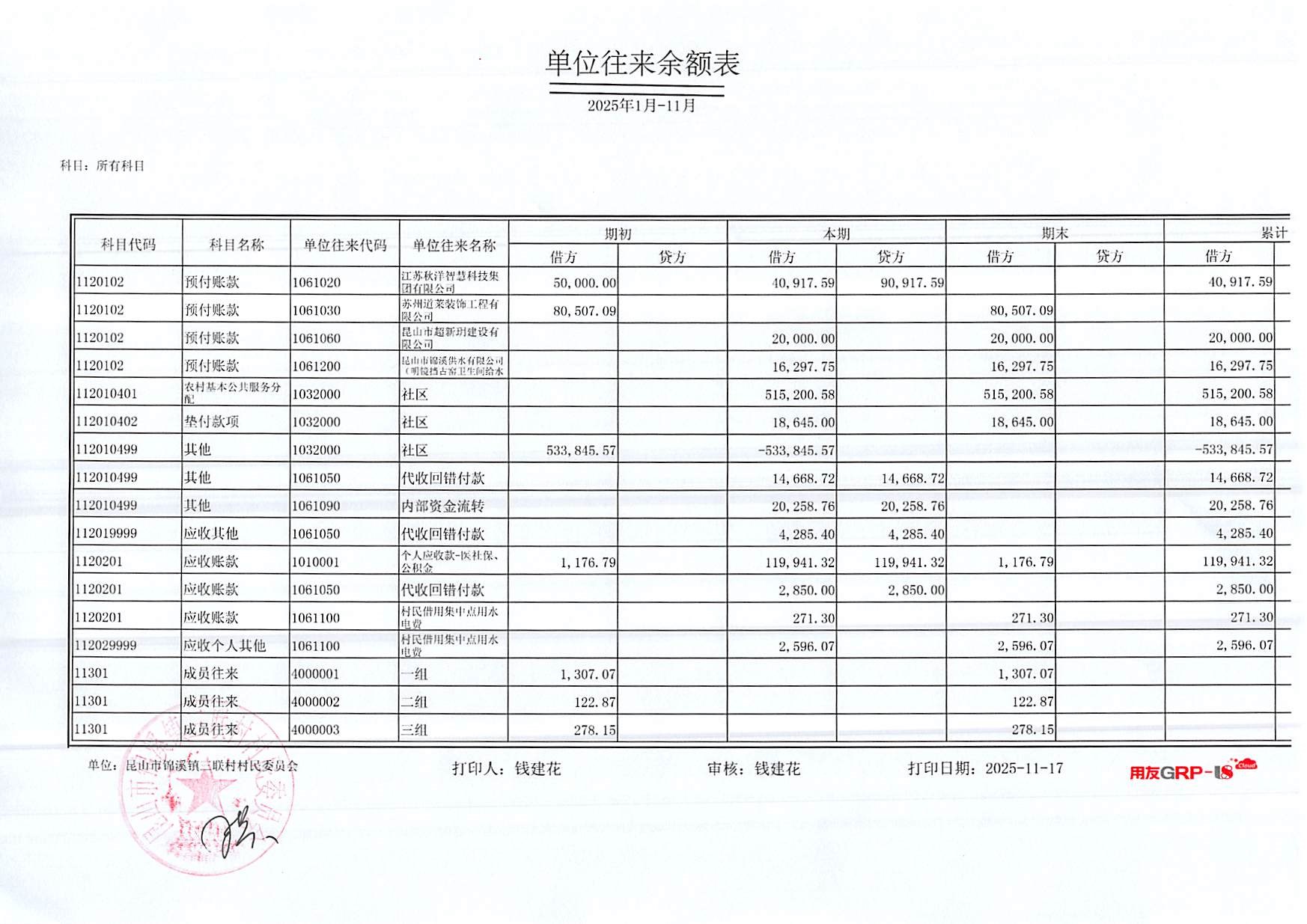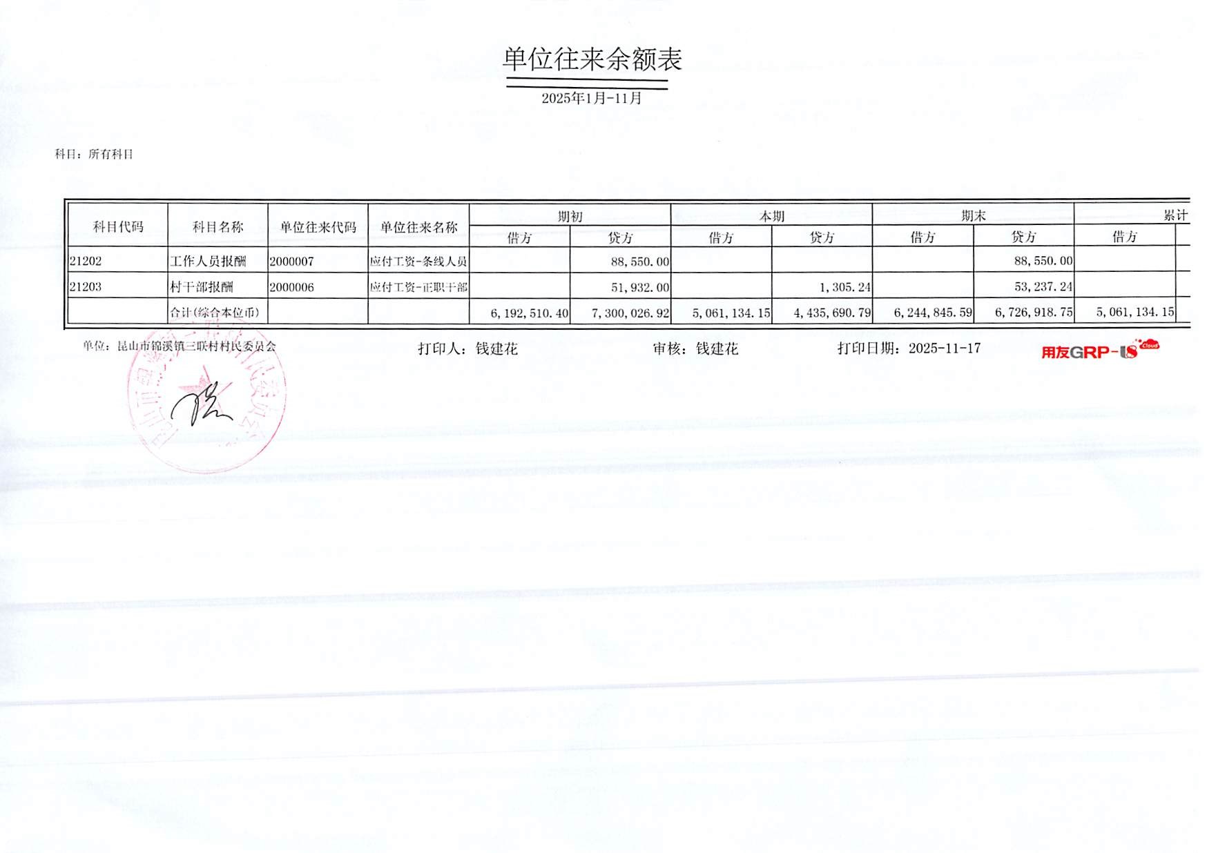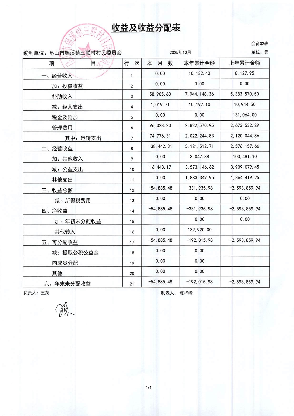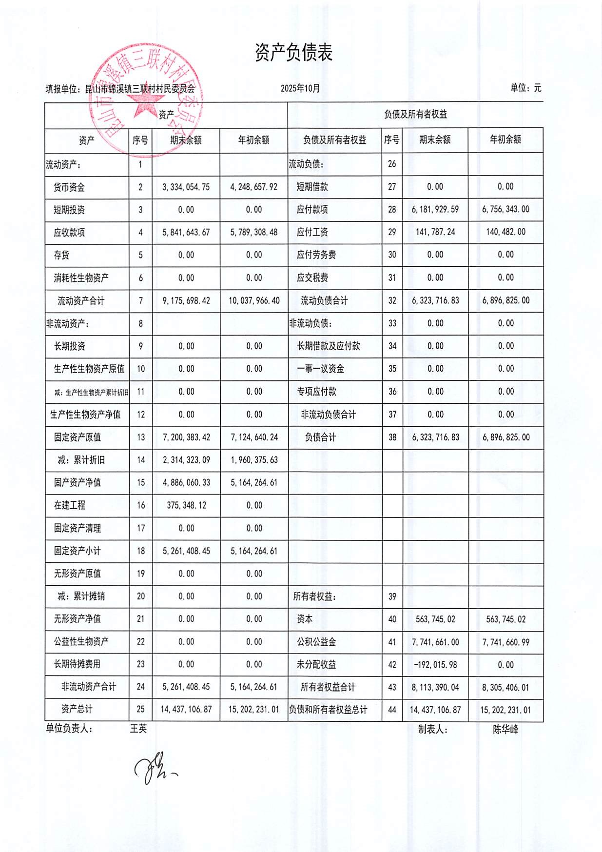 2025年三联村村委会10月份财务公开