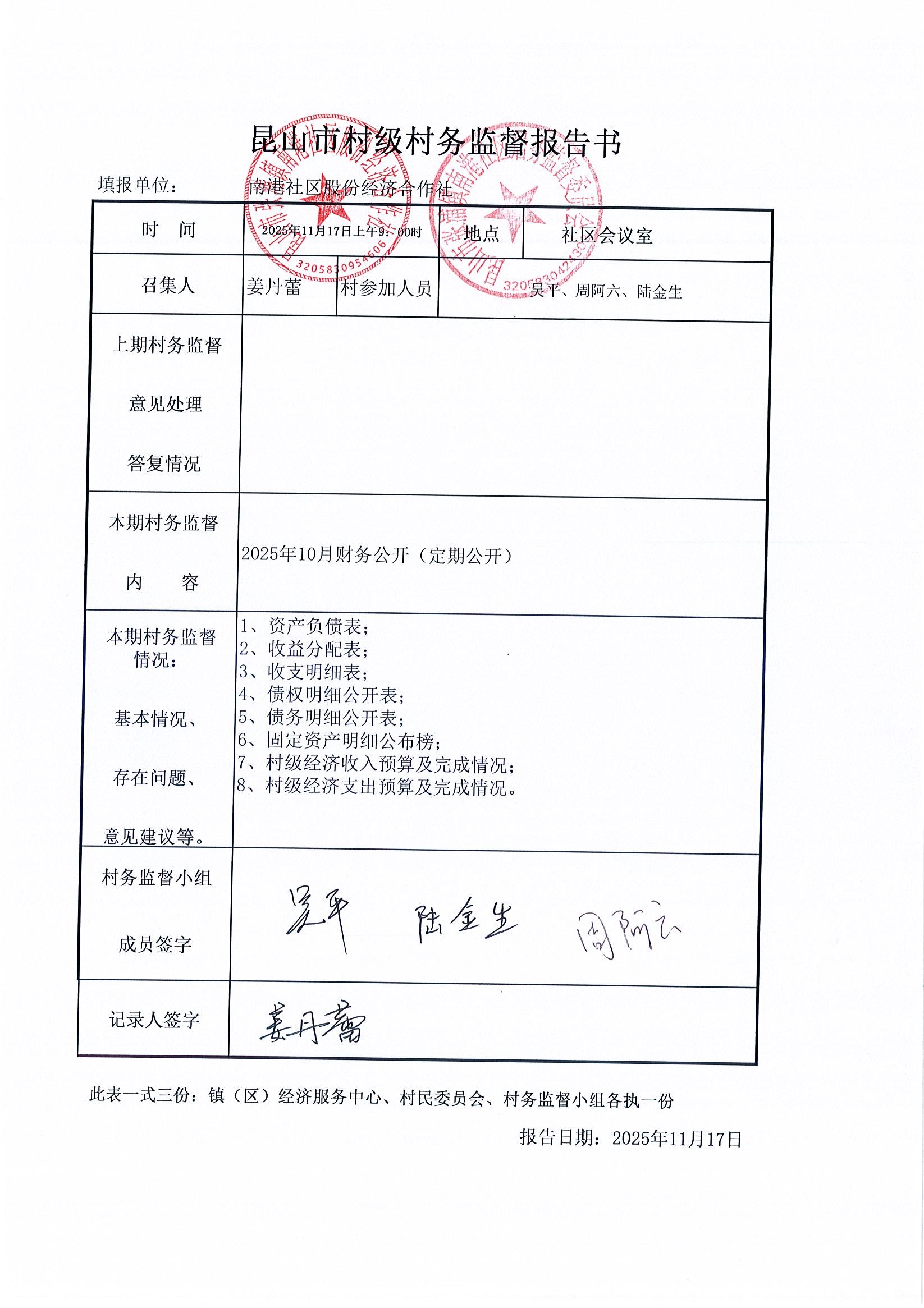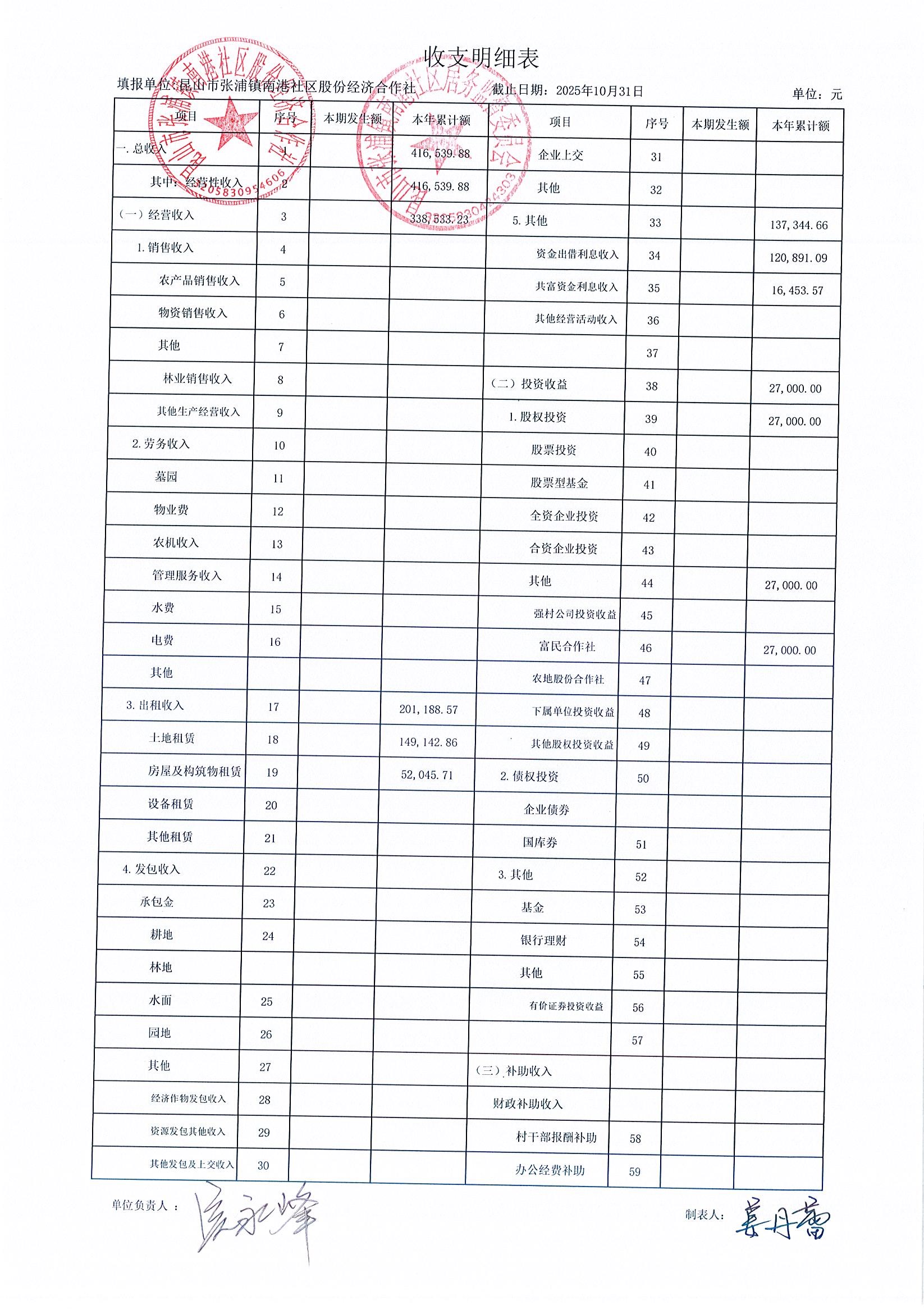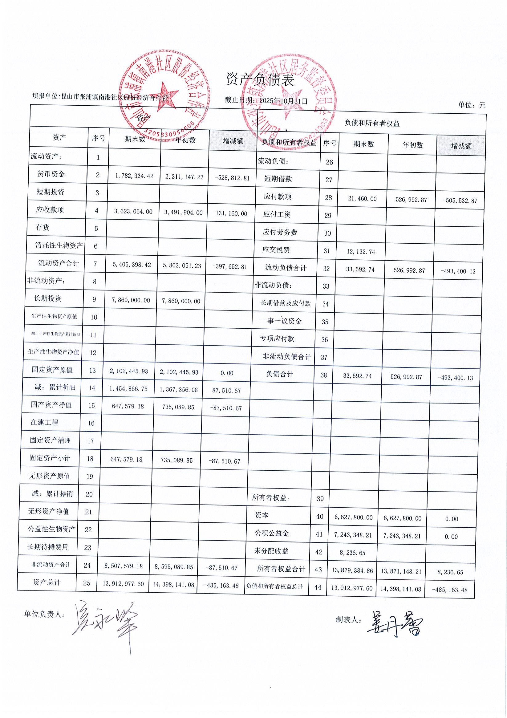 南港社区股份经济合作社2025年10月财务公开(定期公开)