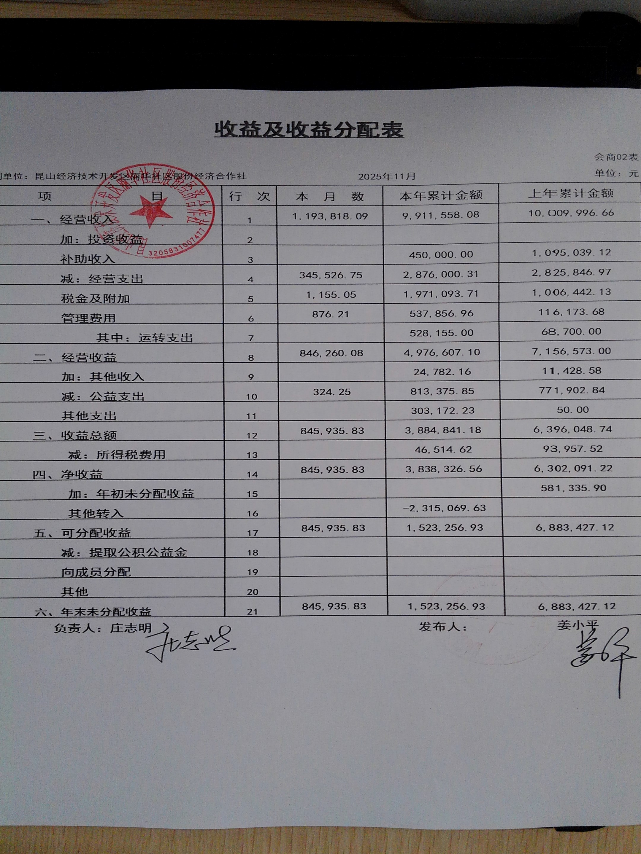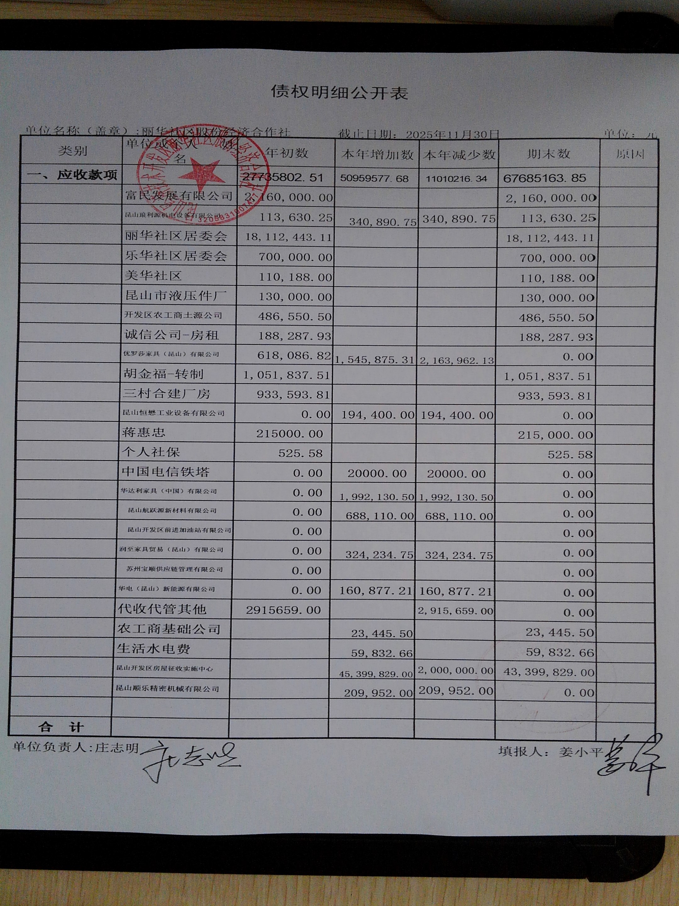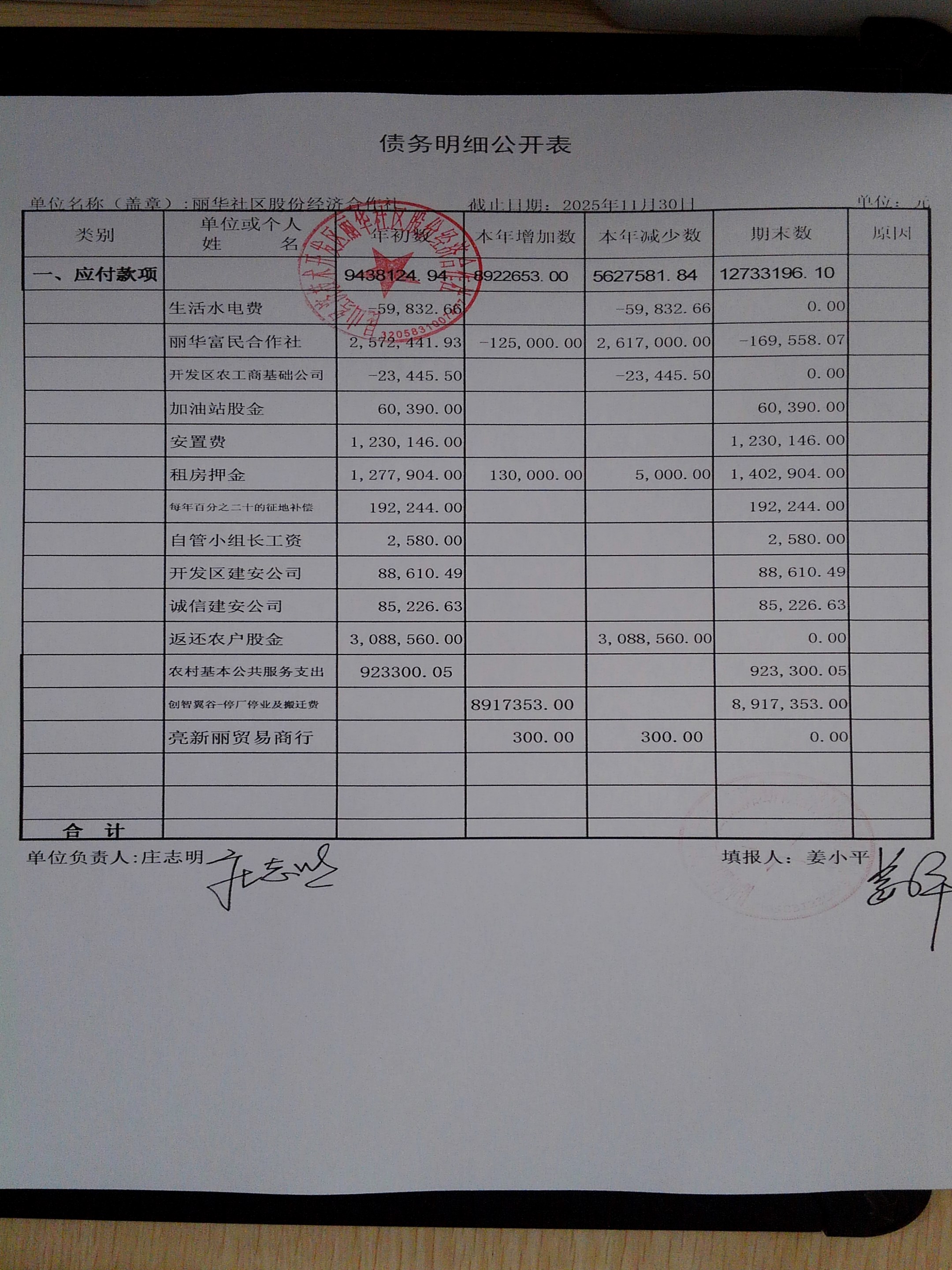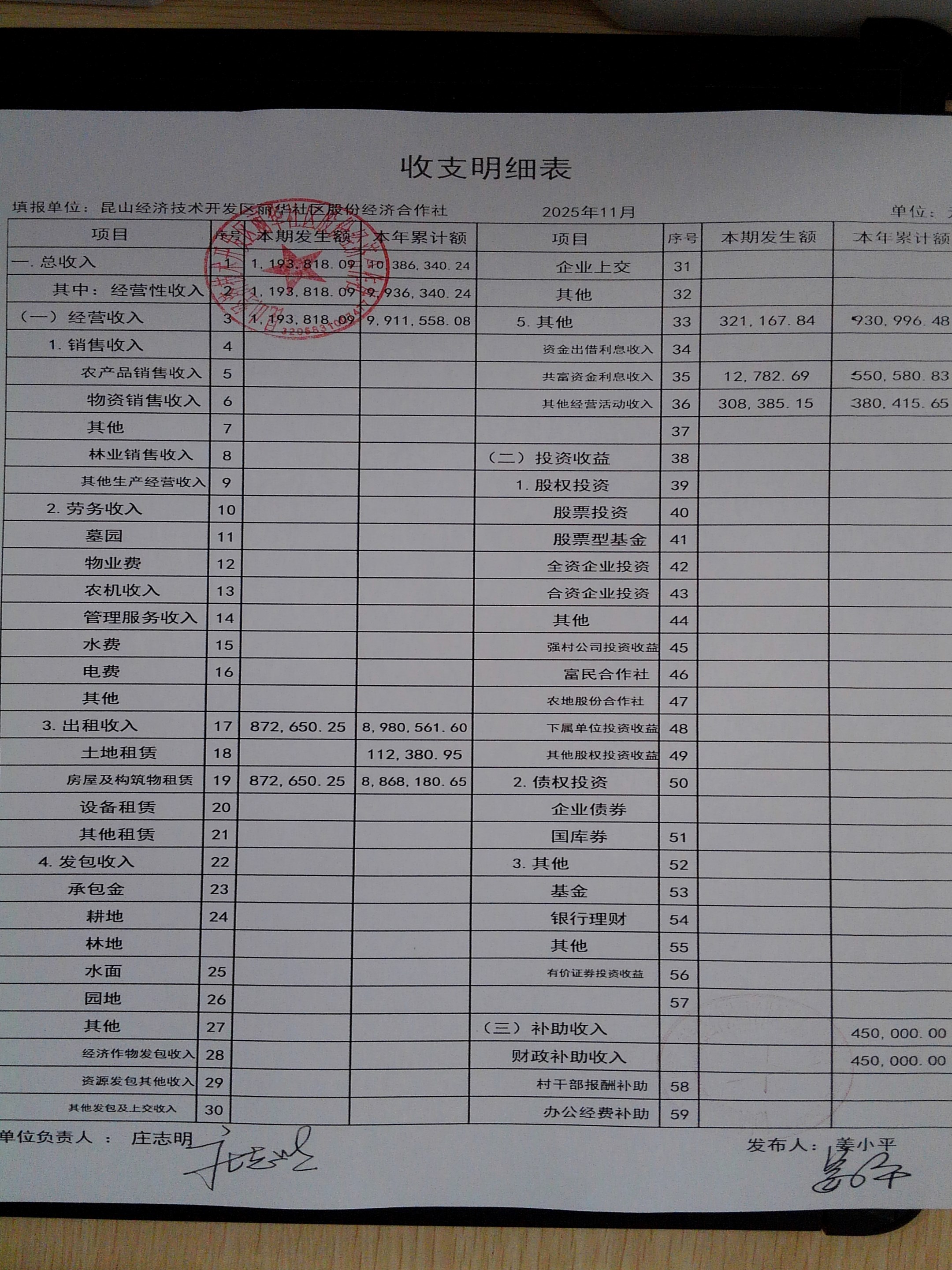 2025年11月份丽华社区股份经济合作社财务公开