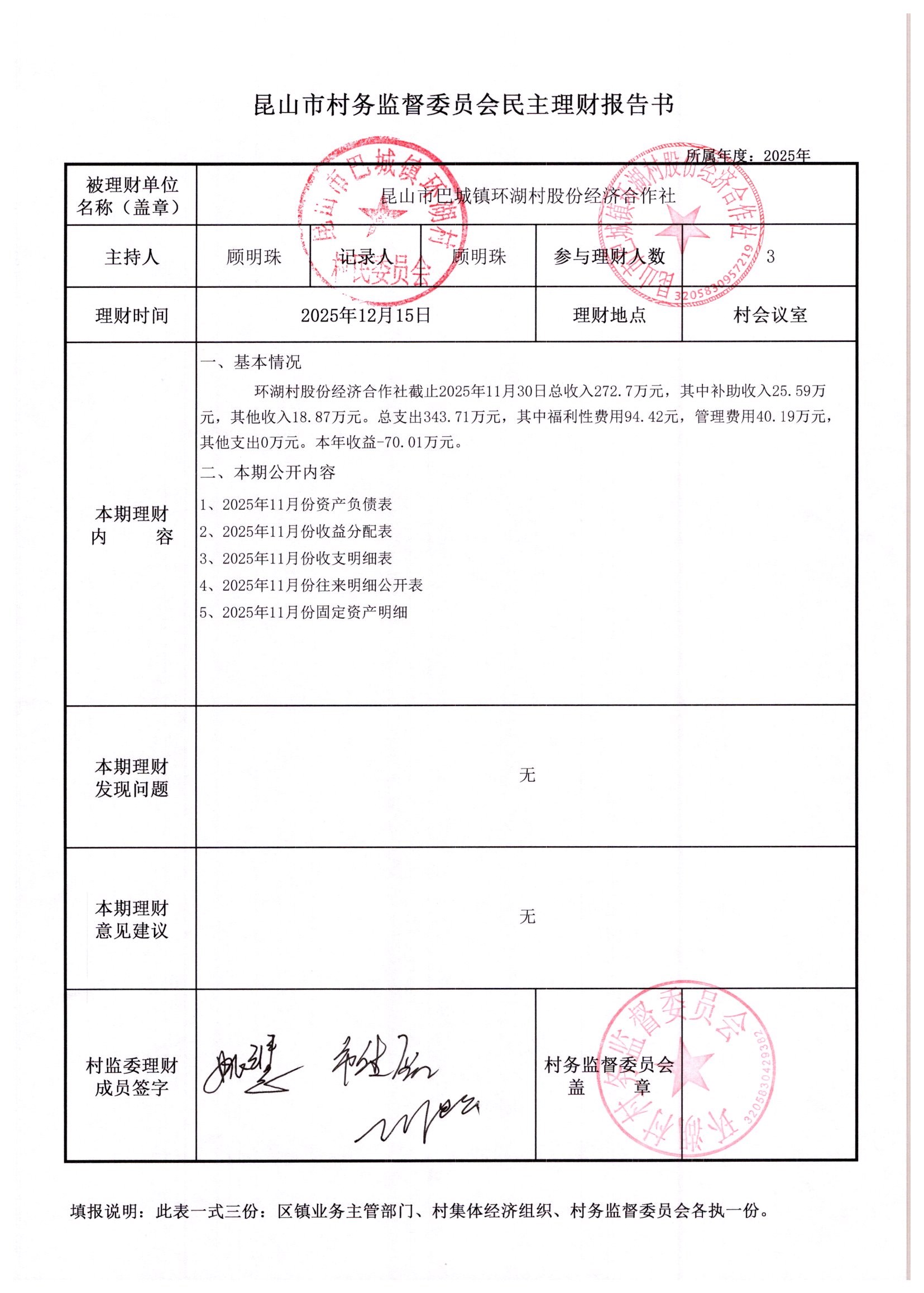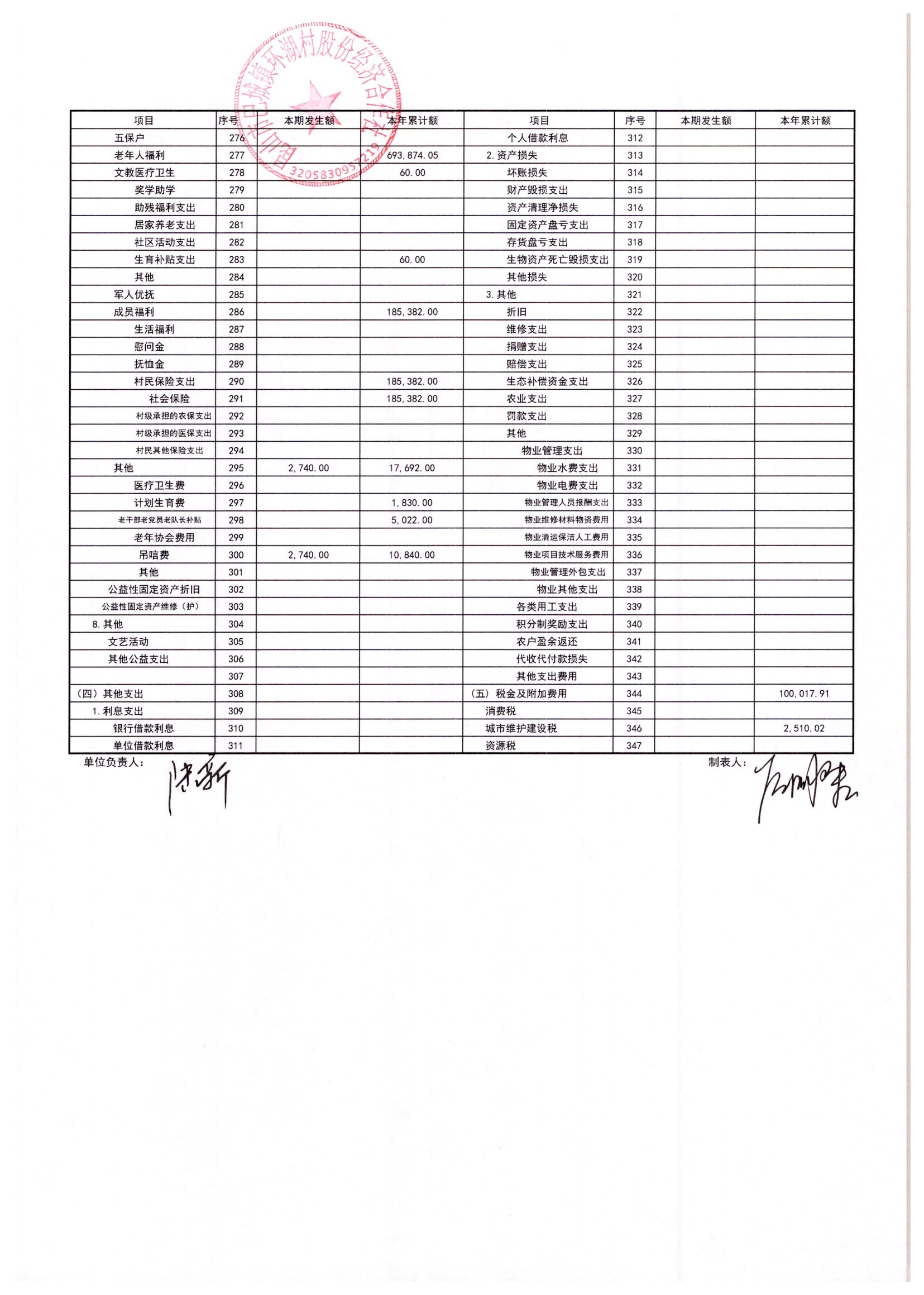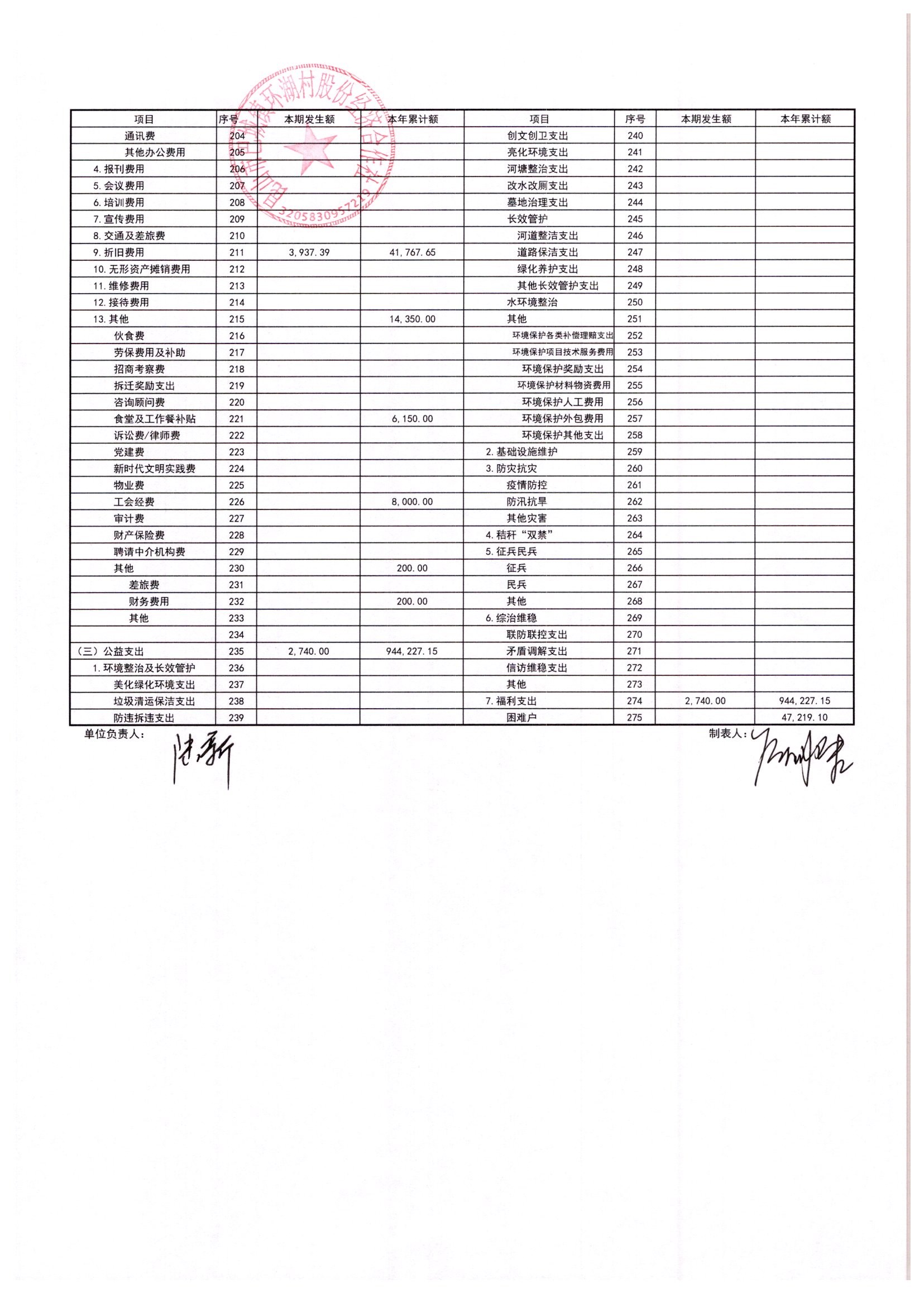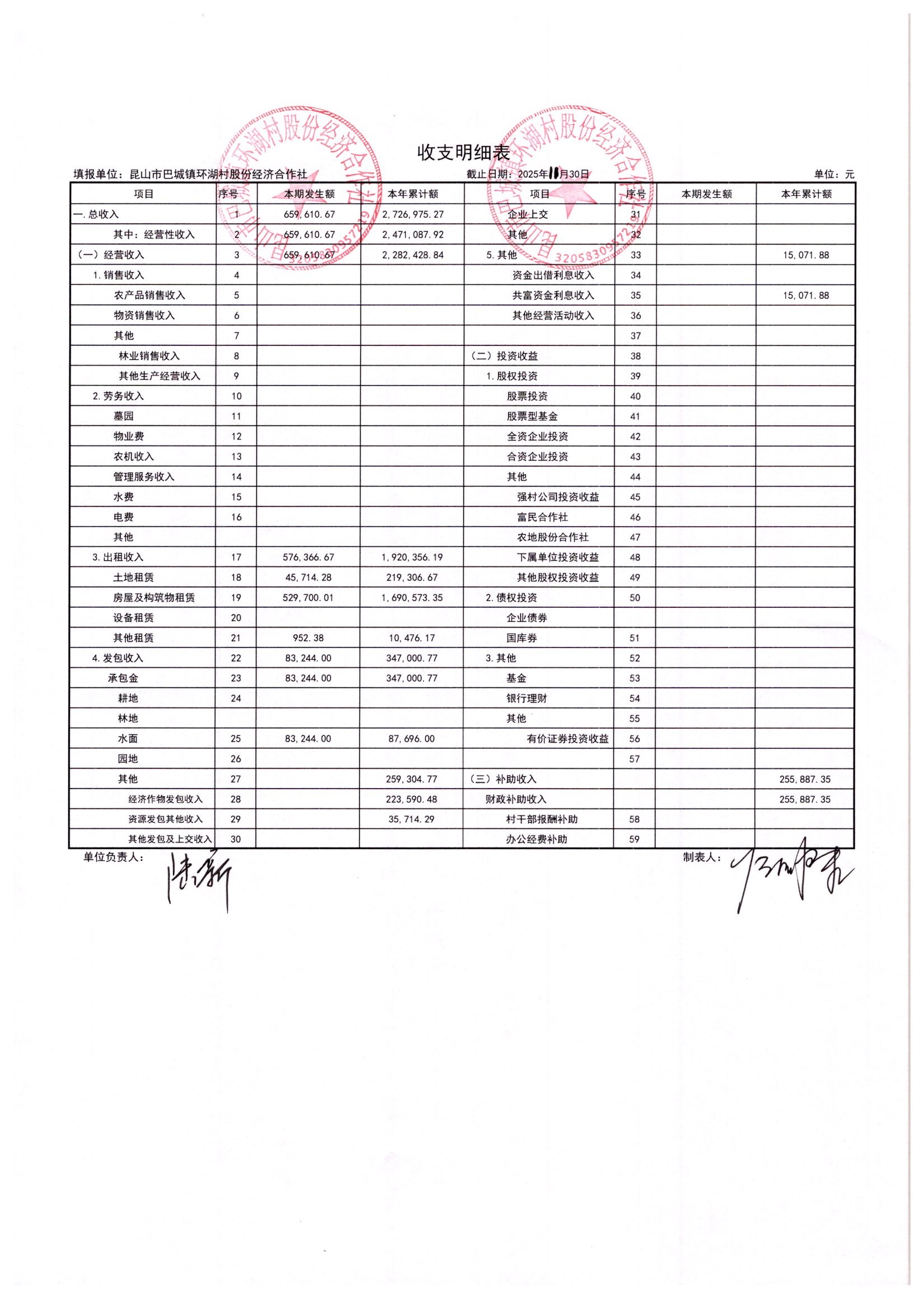 2025年11月环湖村股份经济合作社财务公开