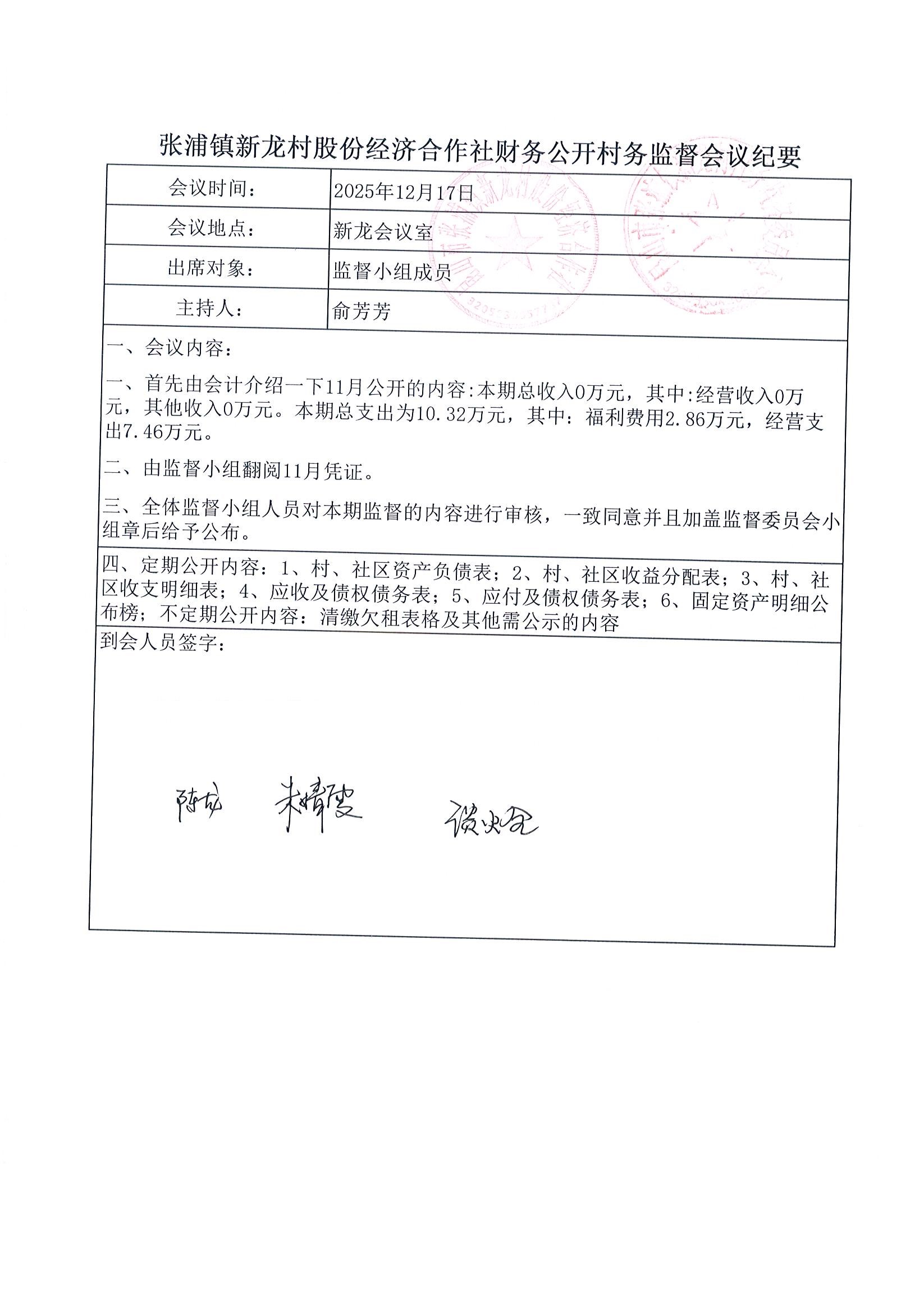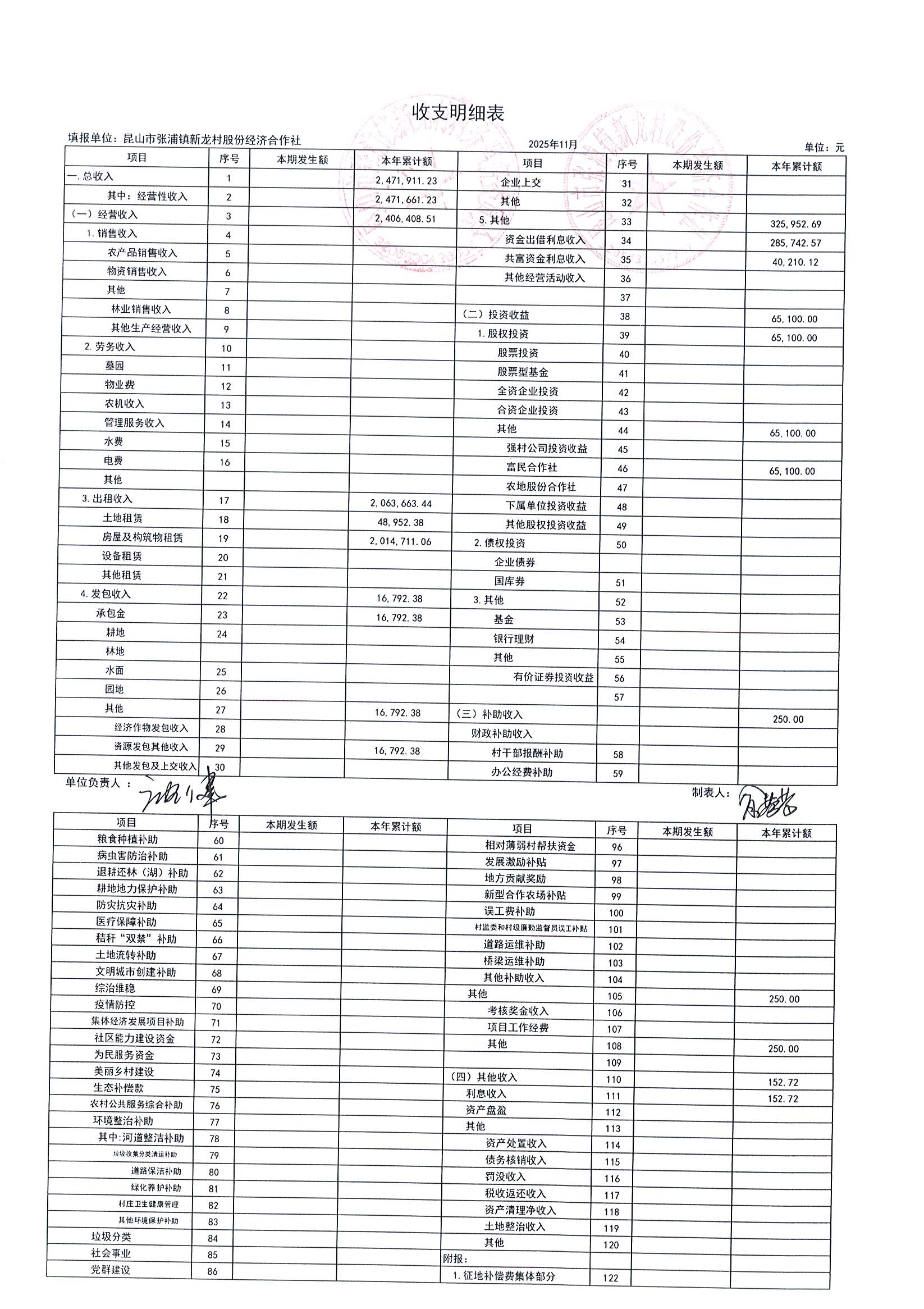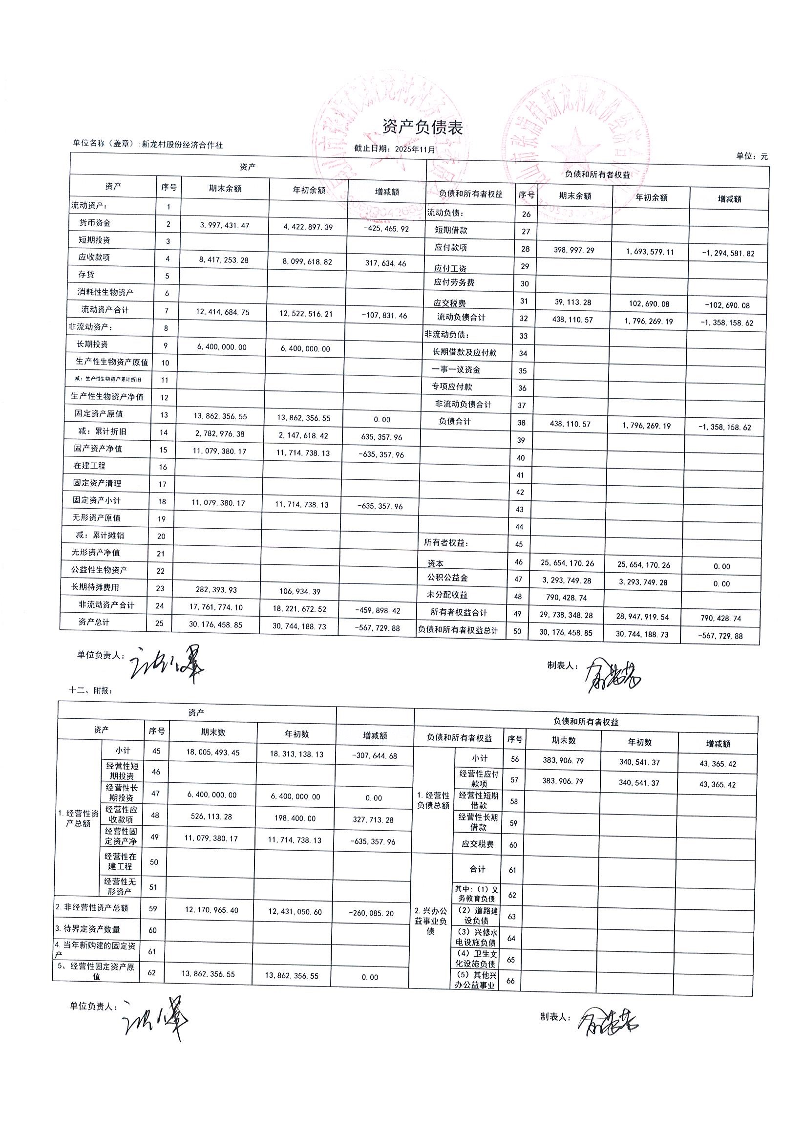 2025年张浦镇新龙村股份经济合作社11月财务公开