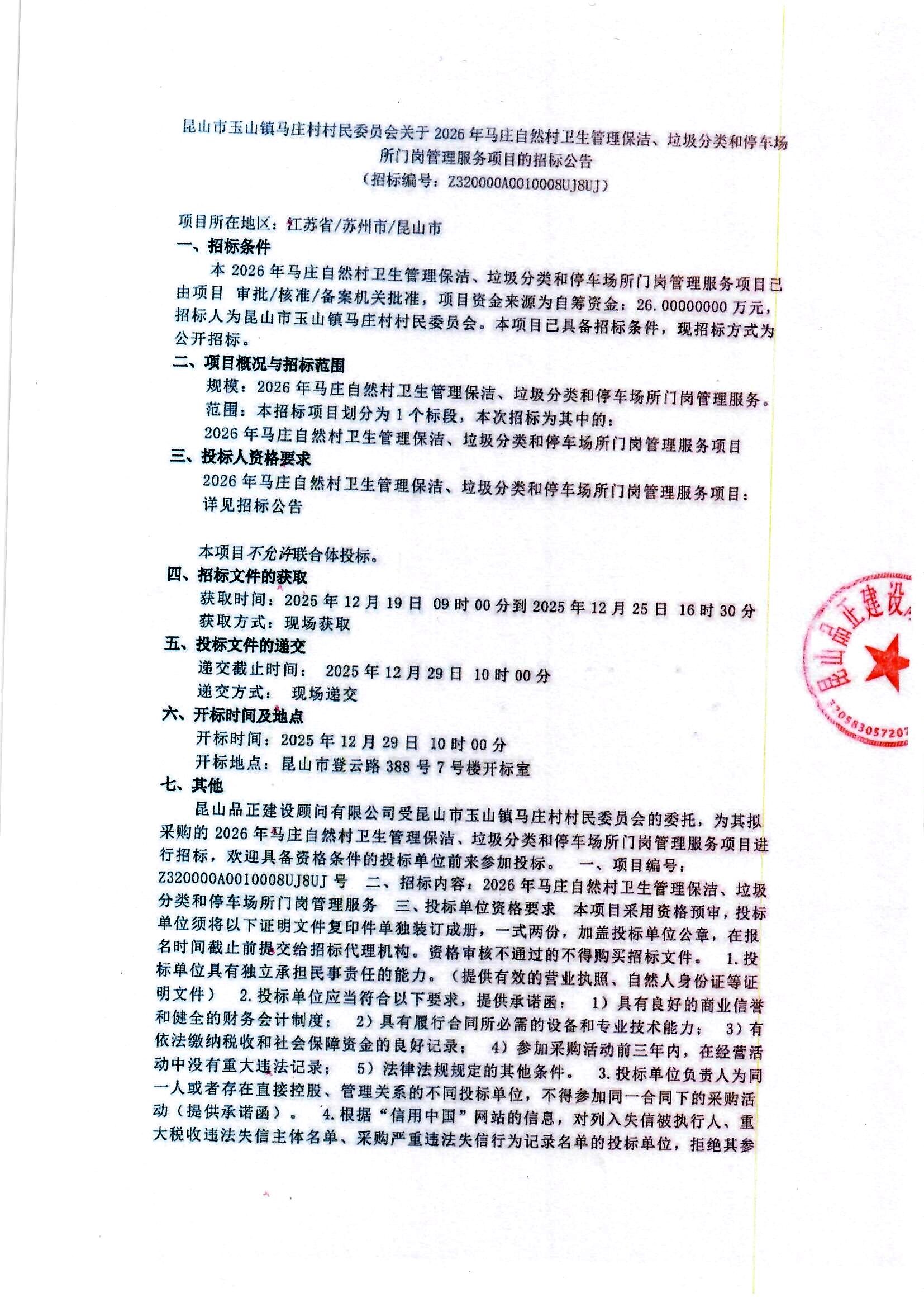 2026年马庄自然村卫生保洁、垃圾分类和停车场所门岗管理招标公告