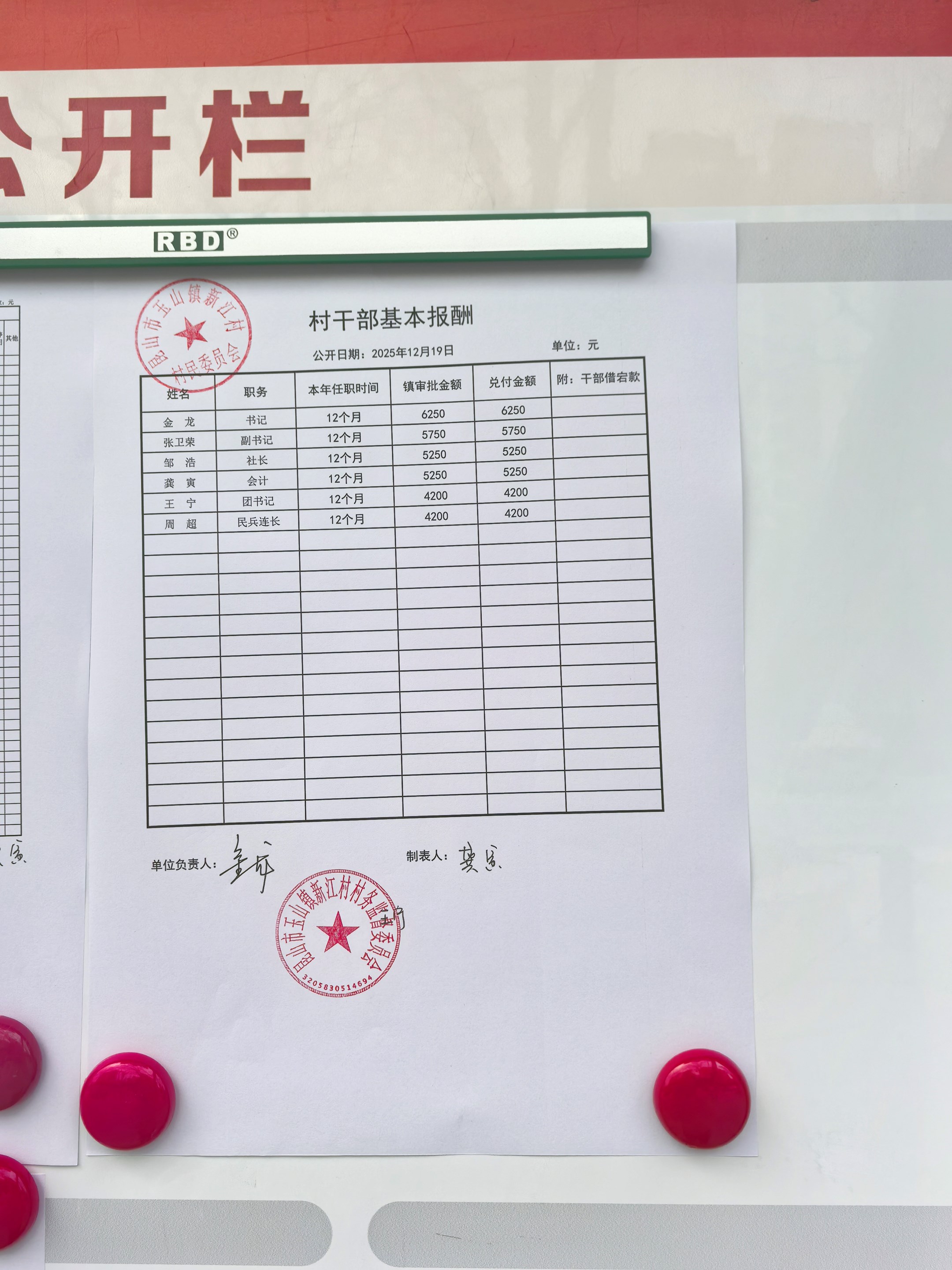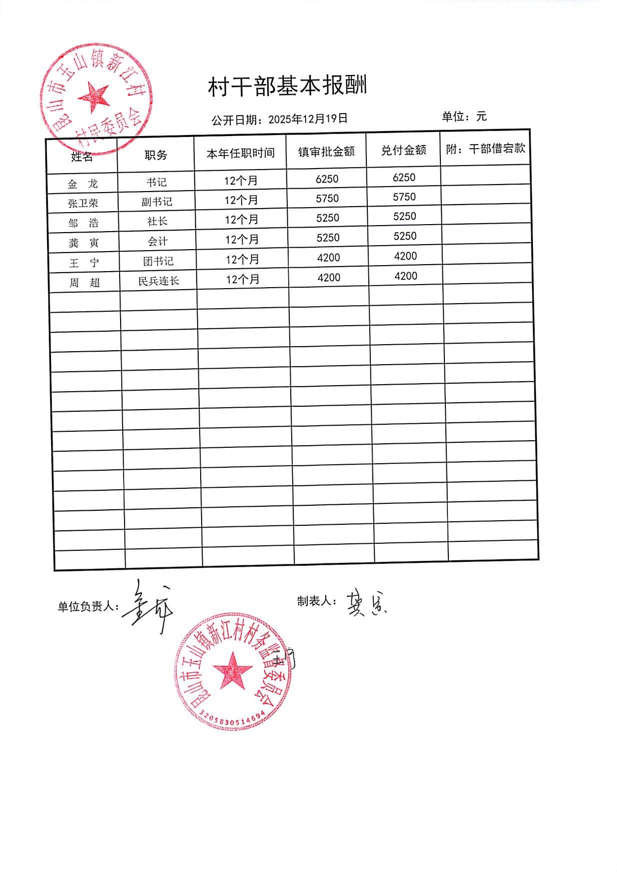 新江村2025年12月村干部基本报酬公示