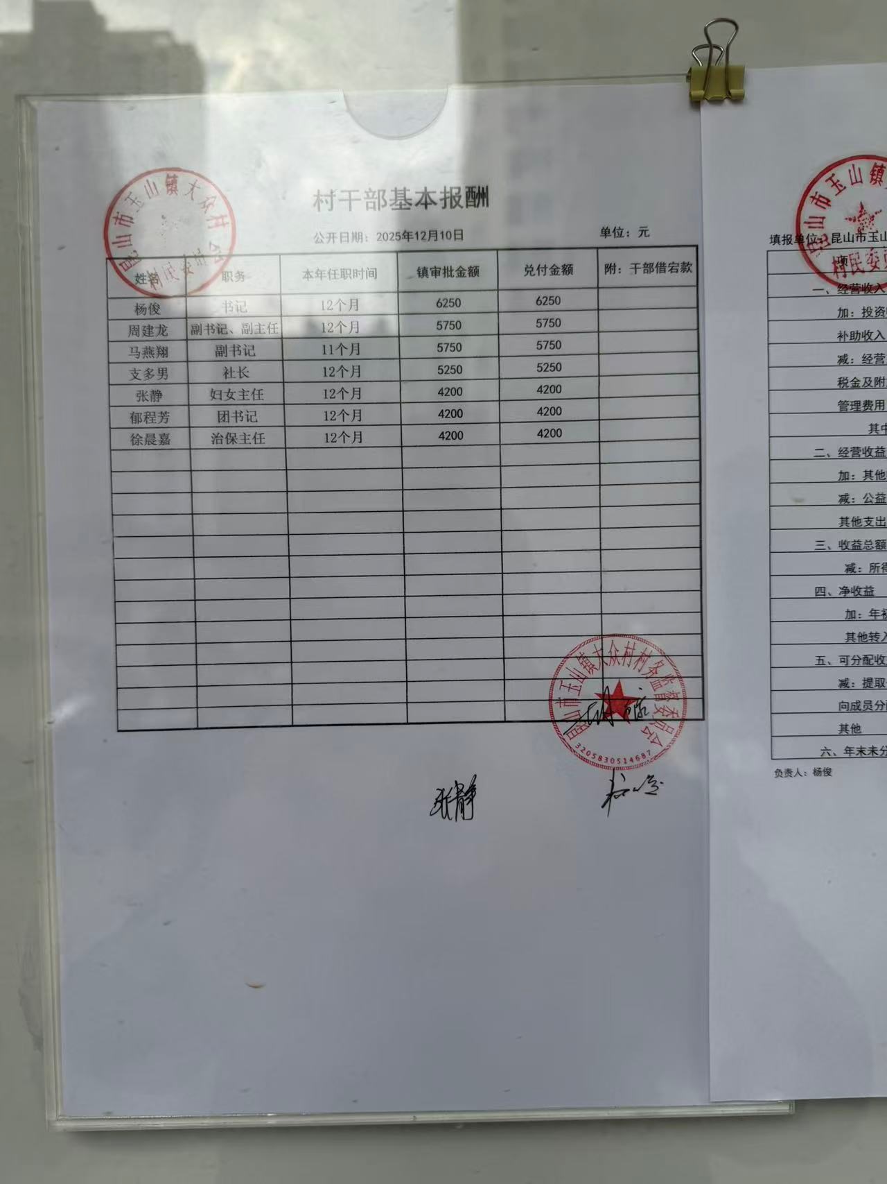 大众村2025年12月份村干部基本报酬公开