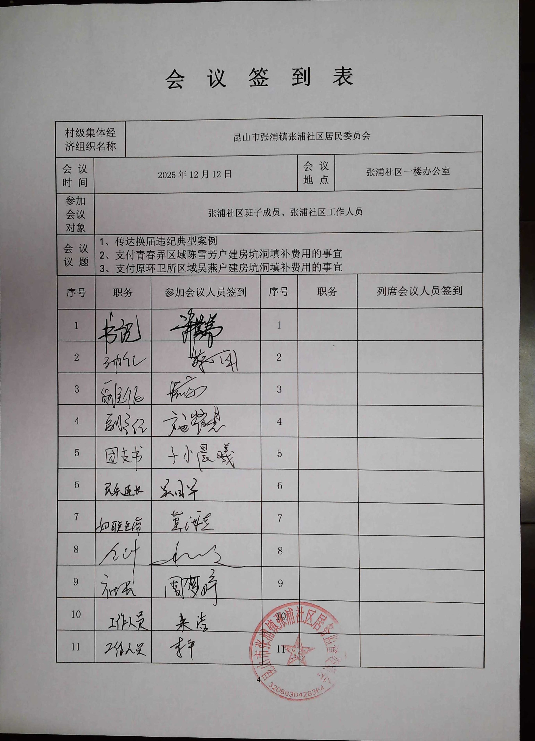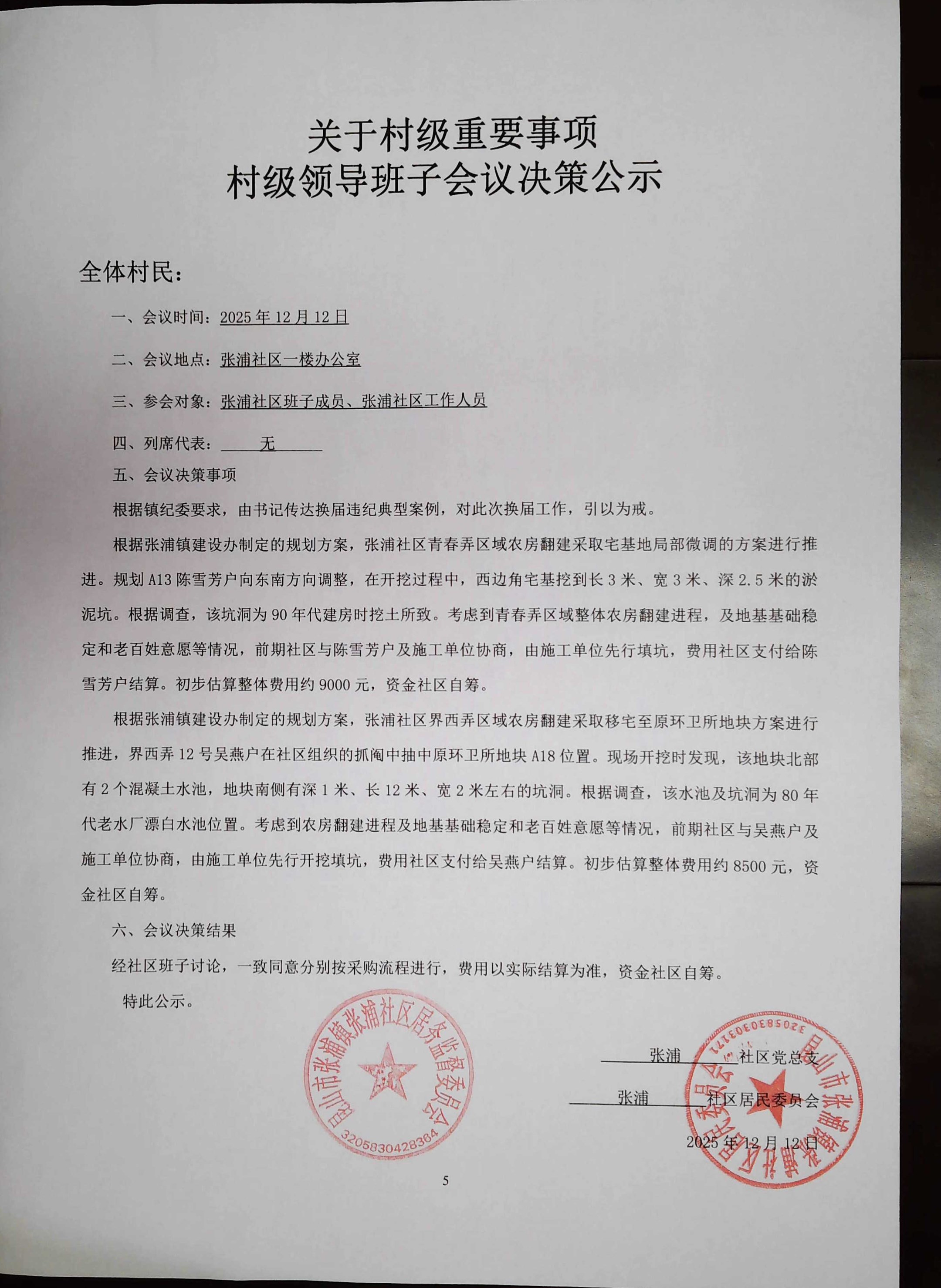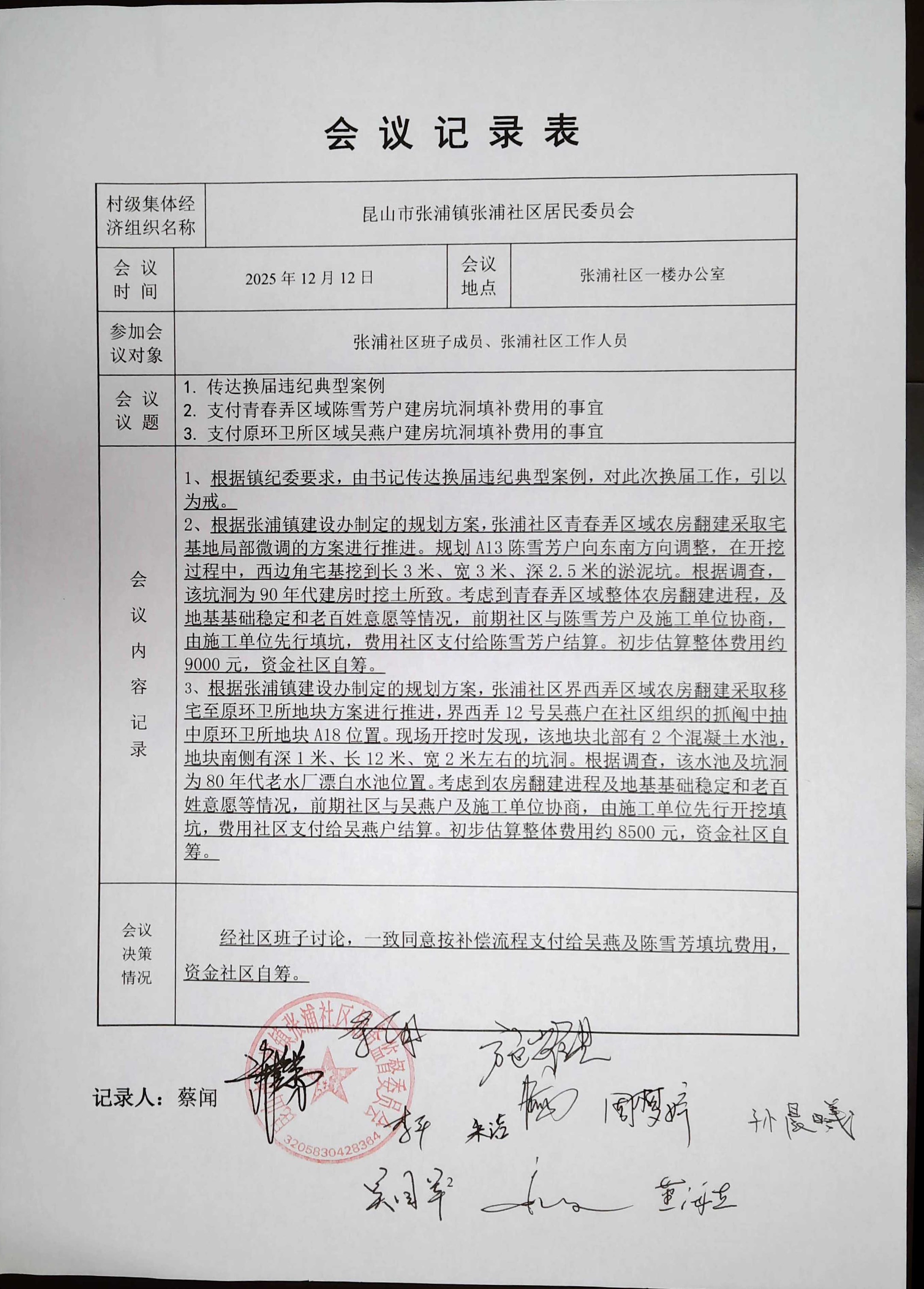 关于传达换届违纪典型案例、农房翻建陈雪芳户、吴燕户坑洞填补等事项会议决策