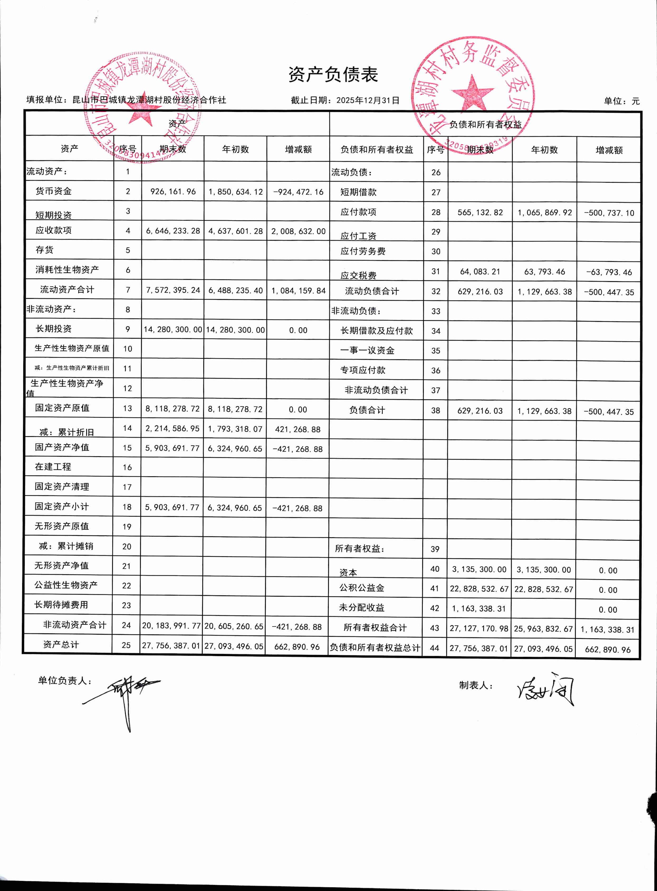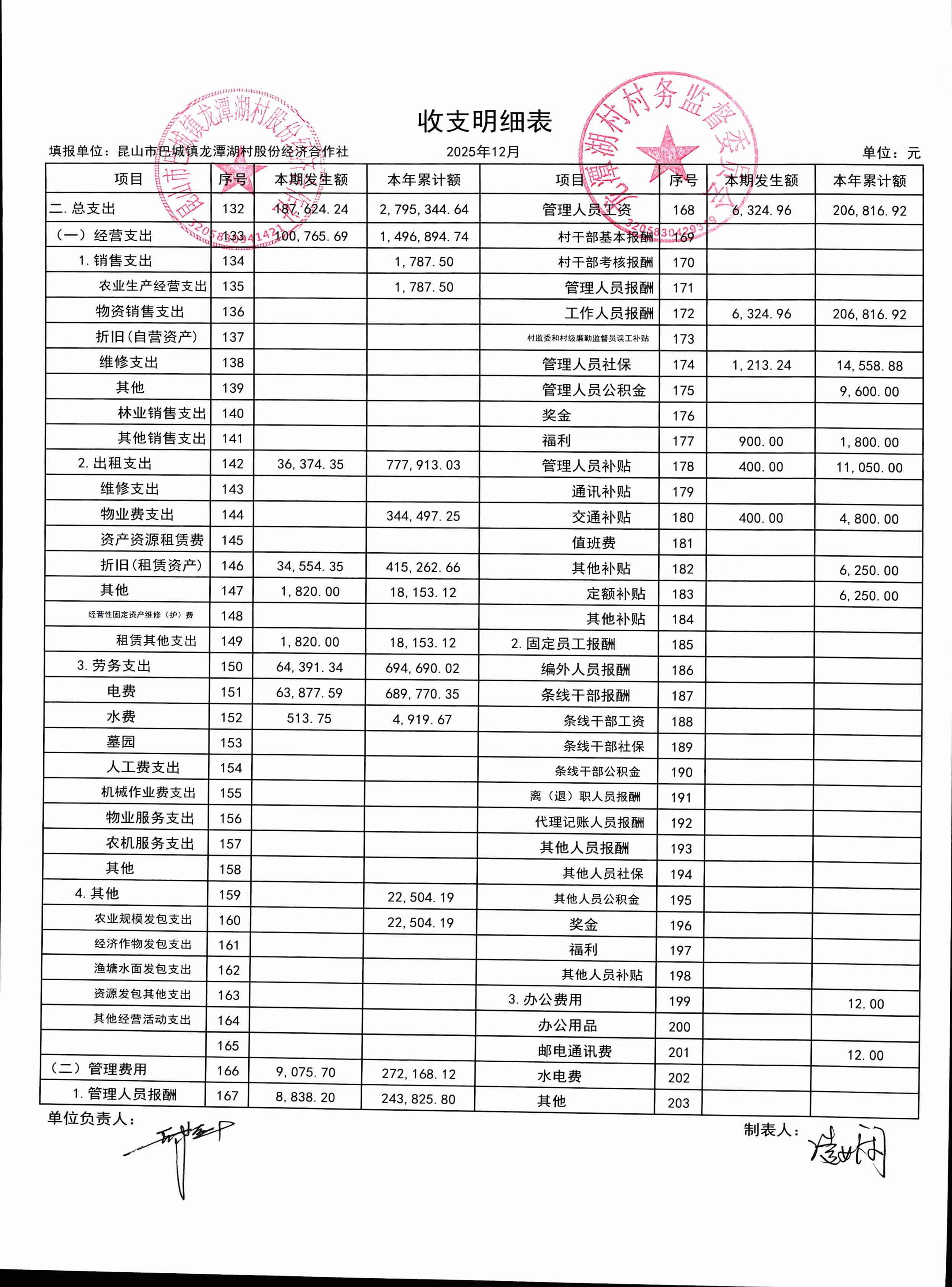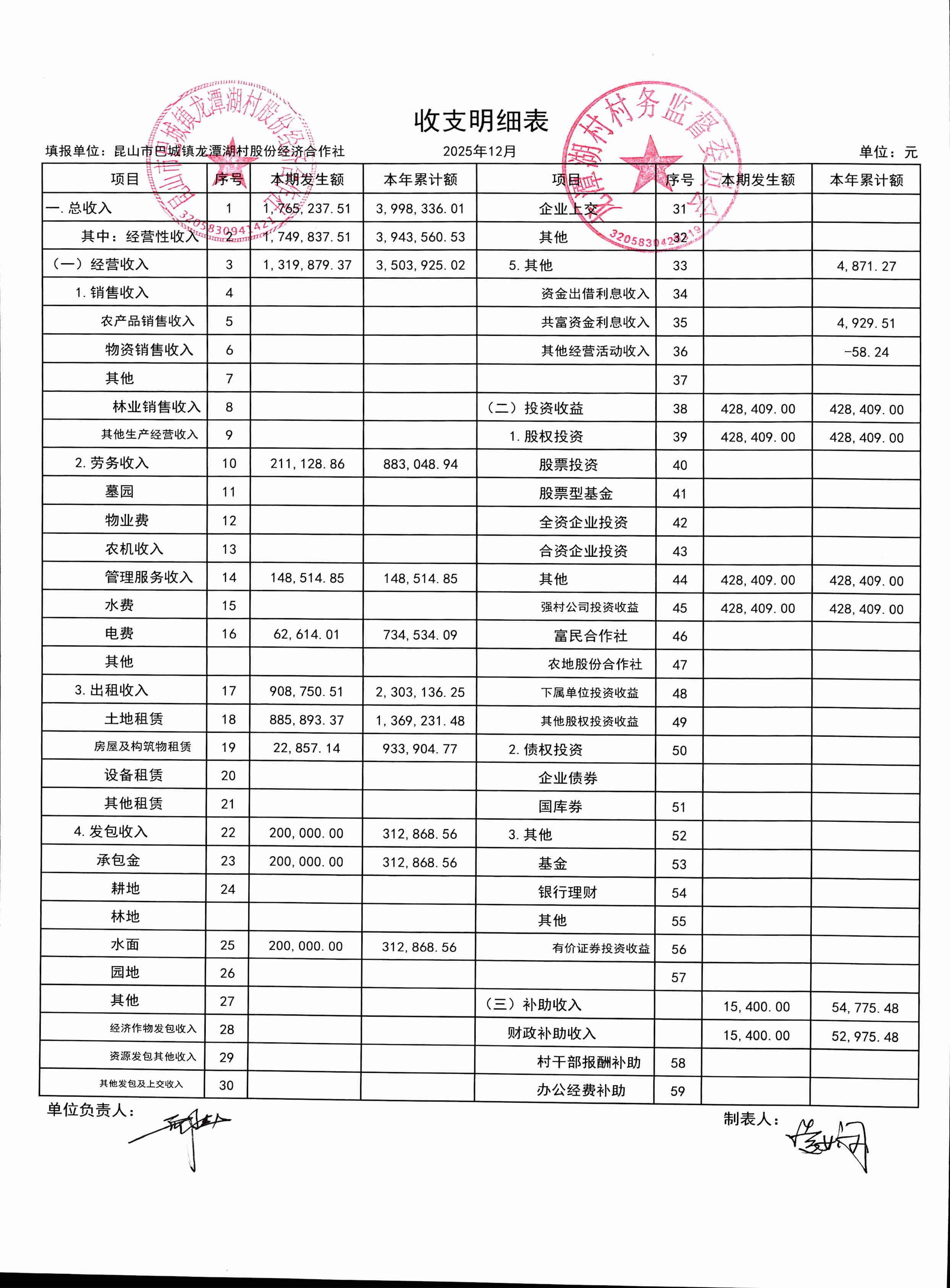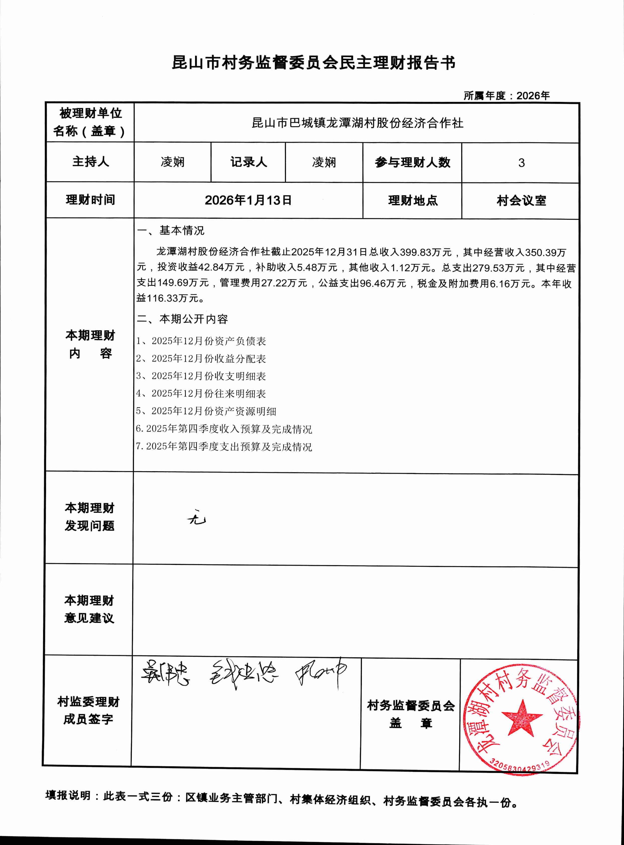 2026年1月份龙潭湖村股份经济合作社财务公开