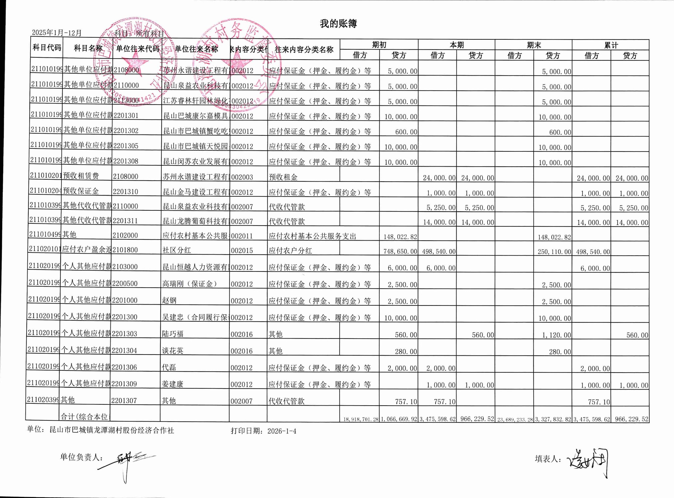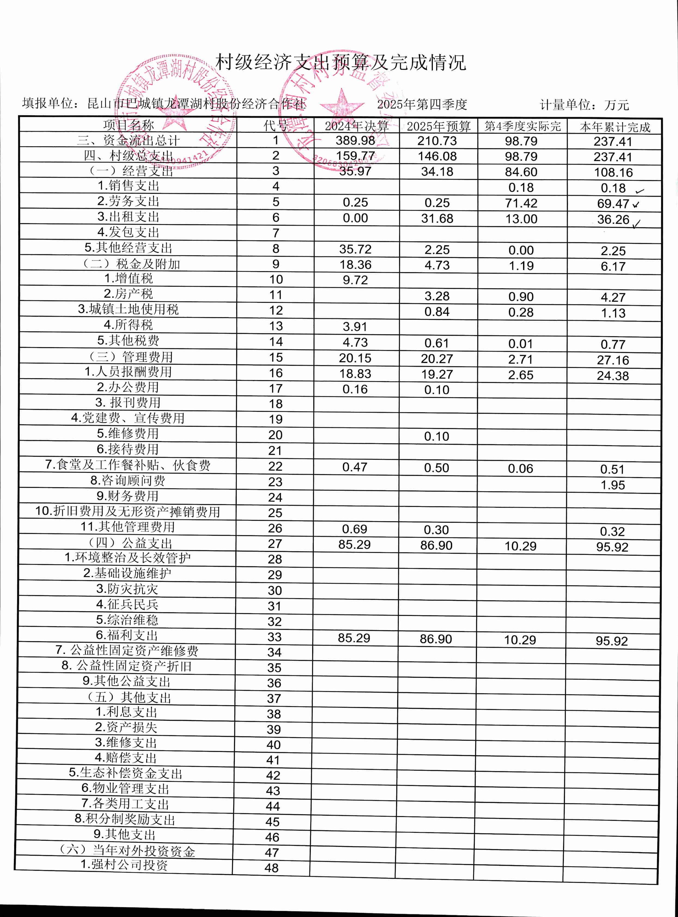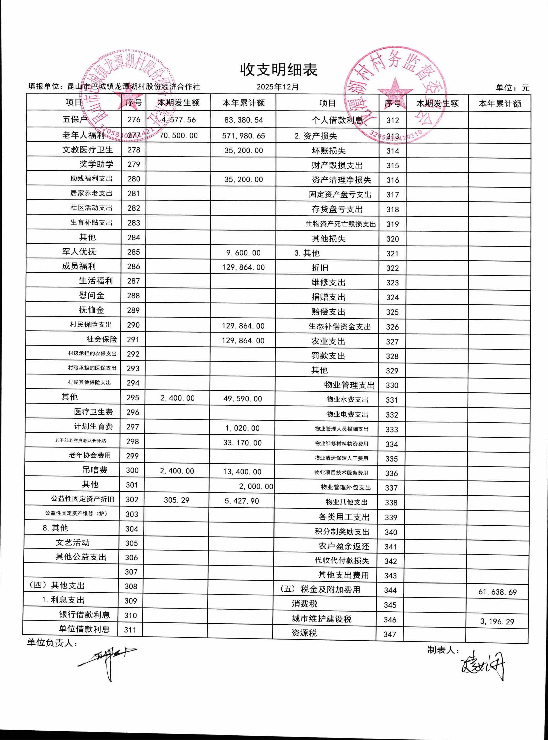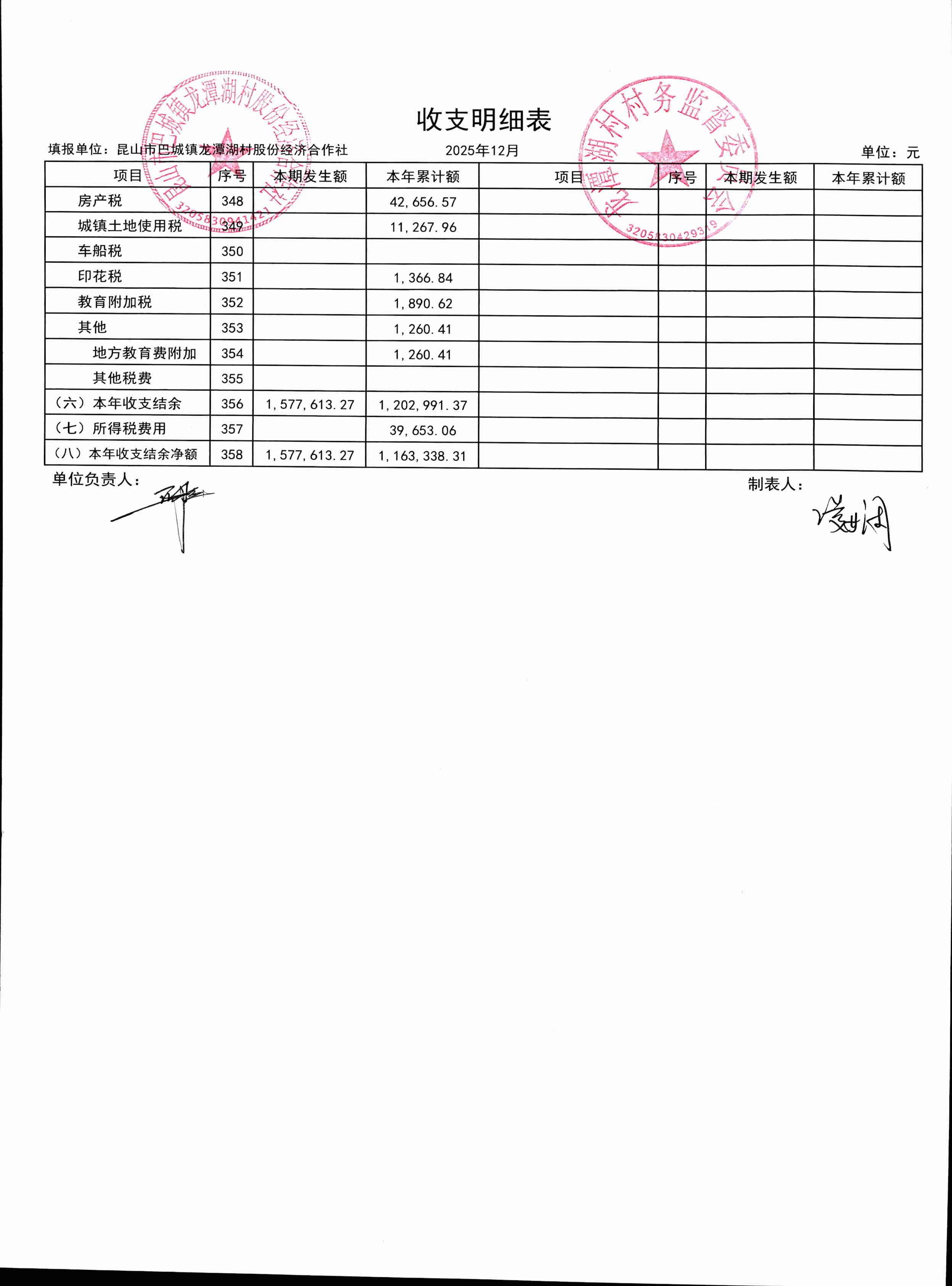 2026年1月份龙潭湖村股份经济合作社财务公开