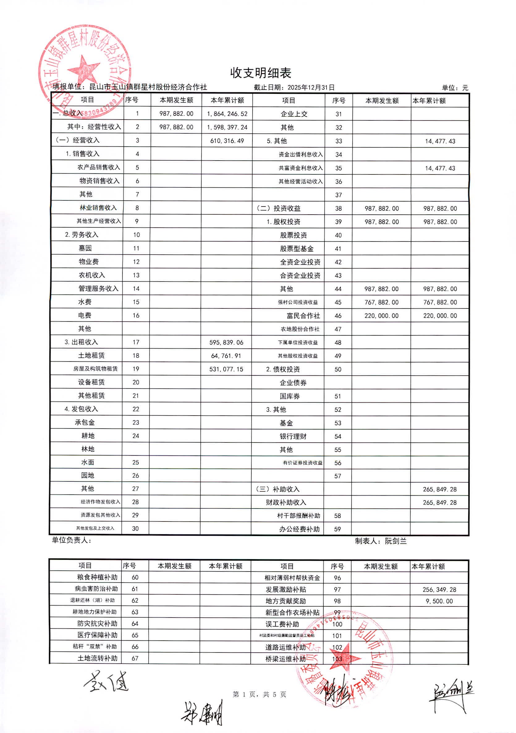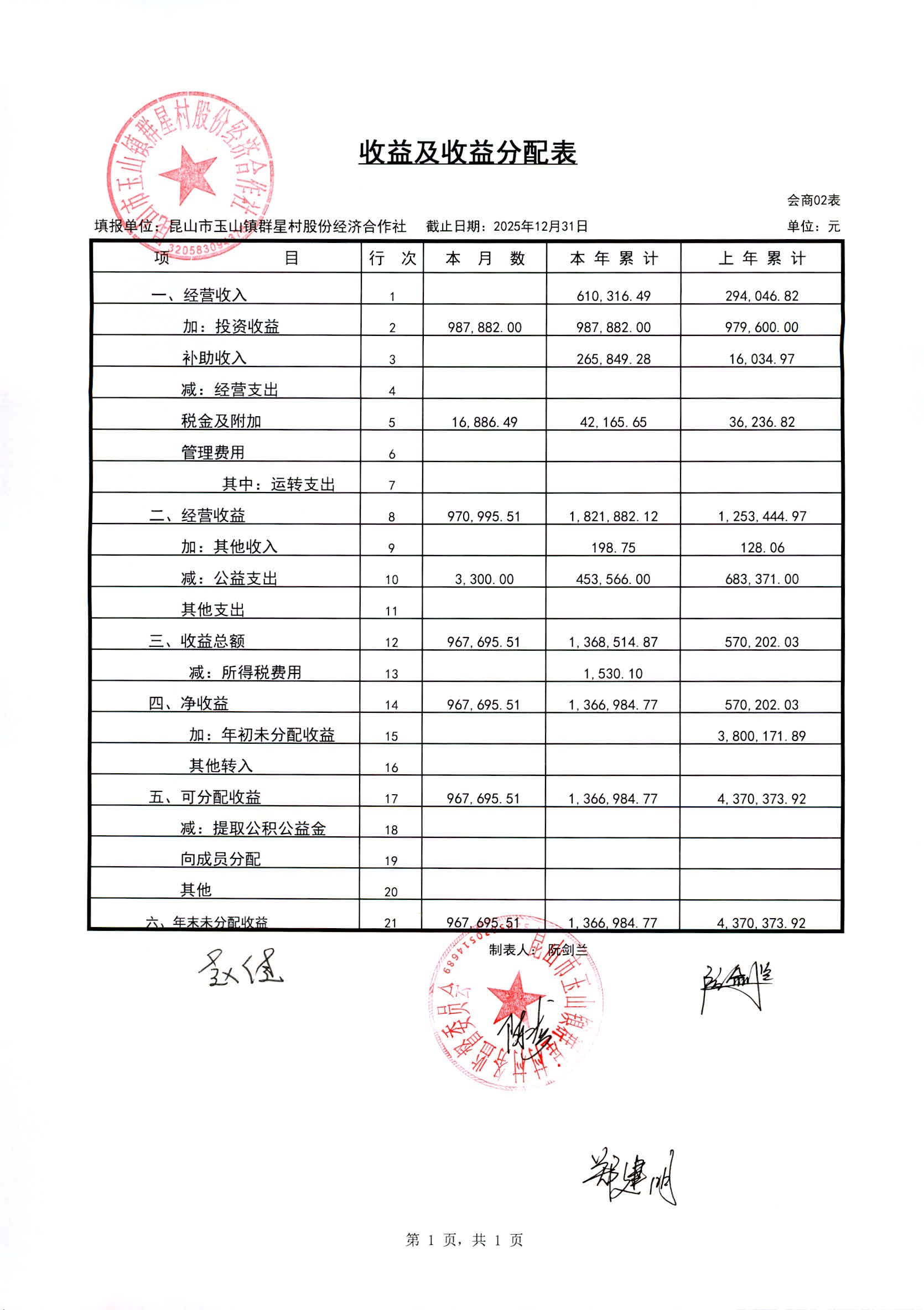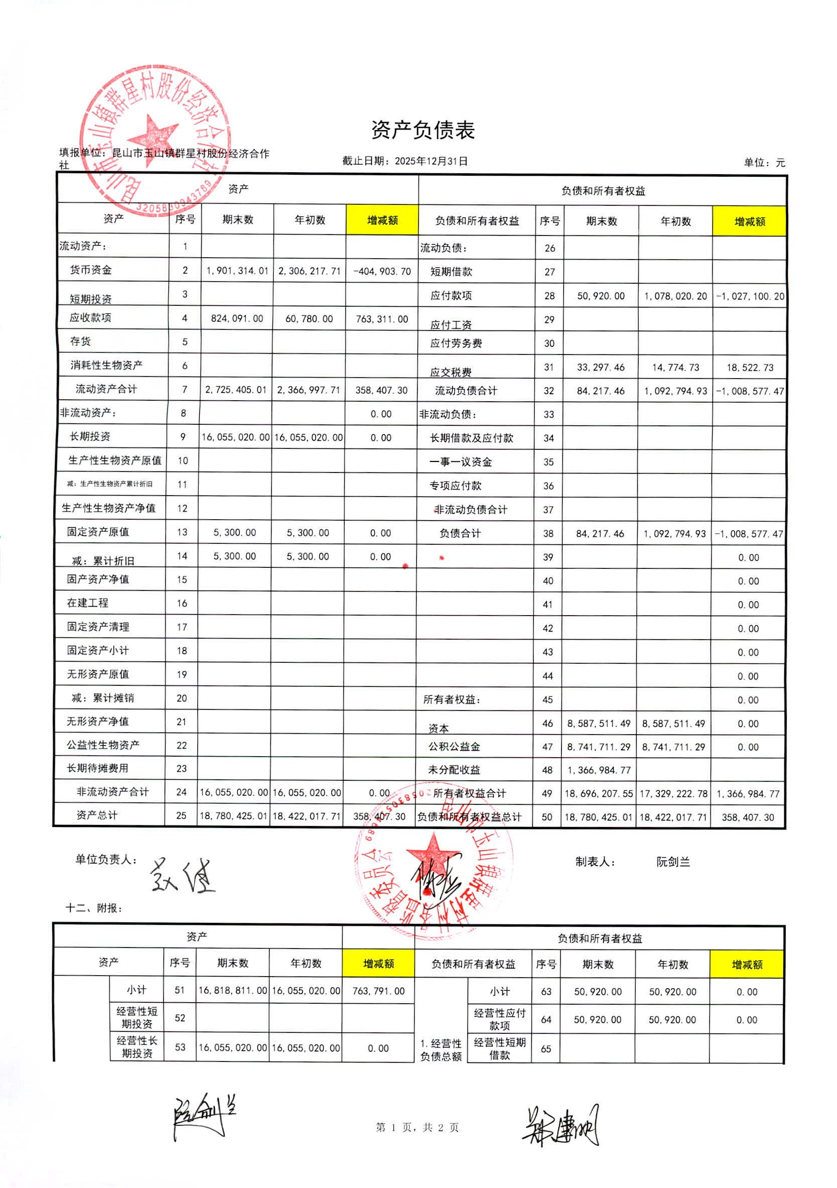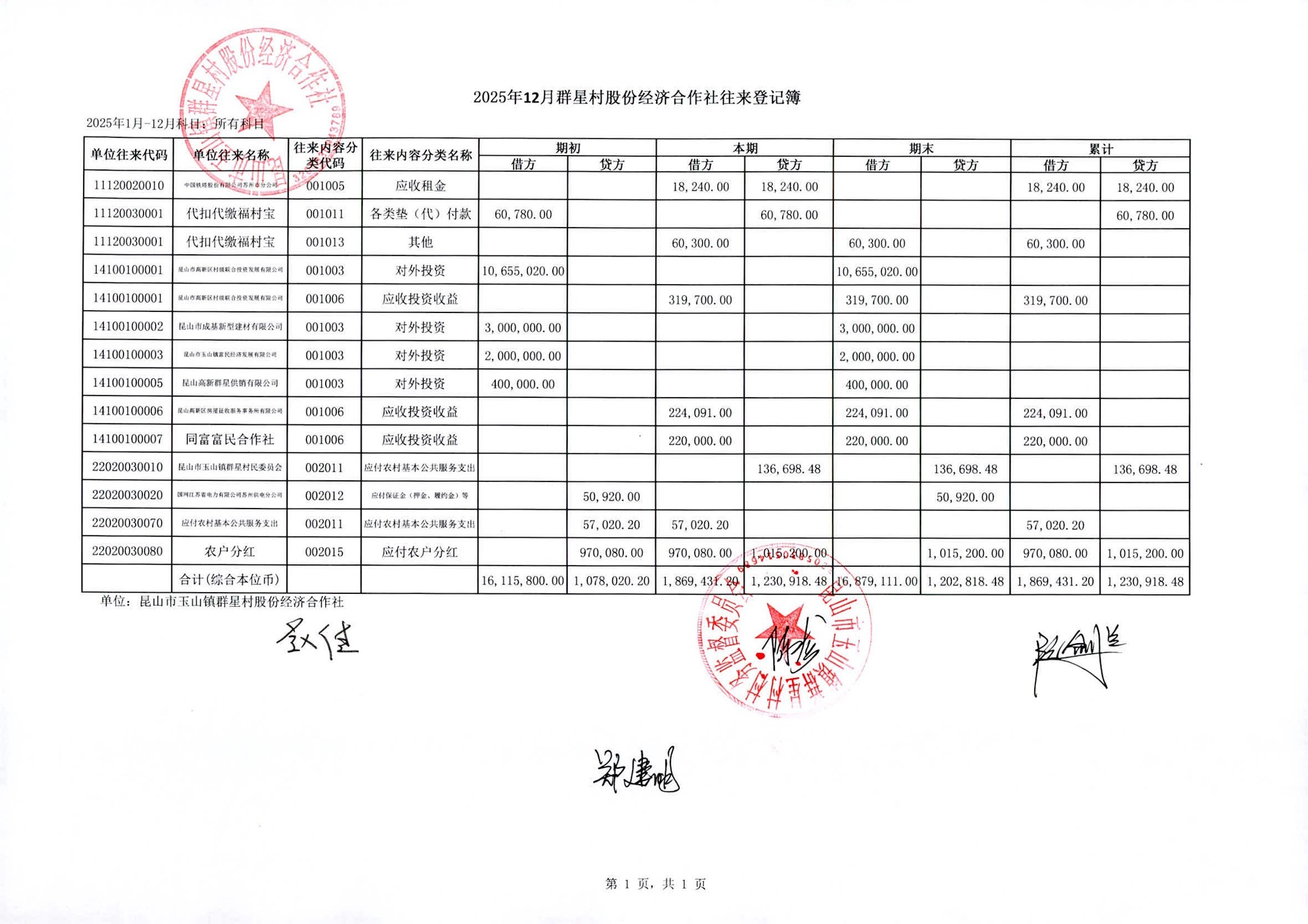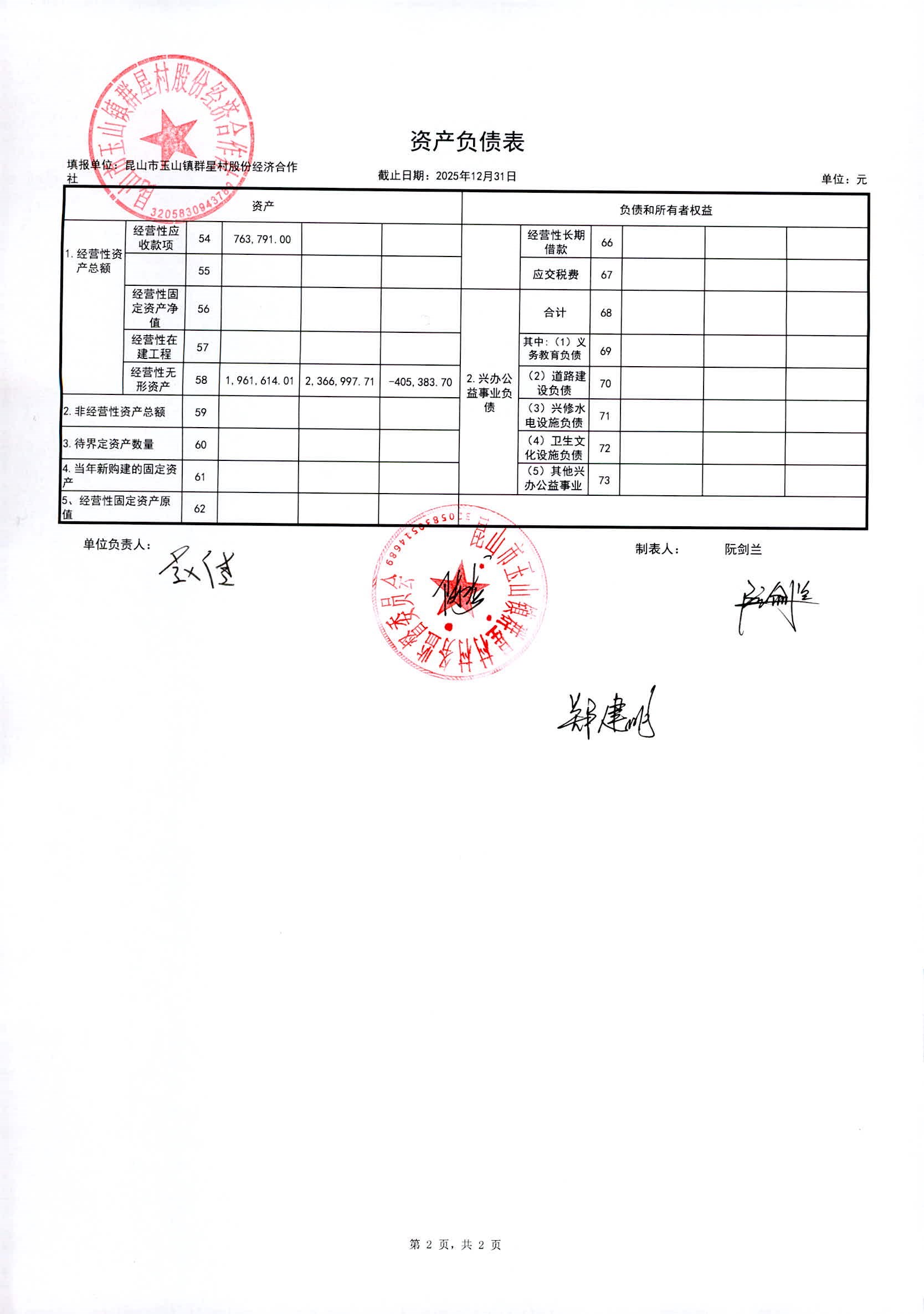 昆山高新区群星村2026年01月份公开股份经济合作社2025年12月财务信息